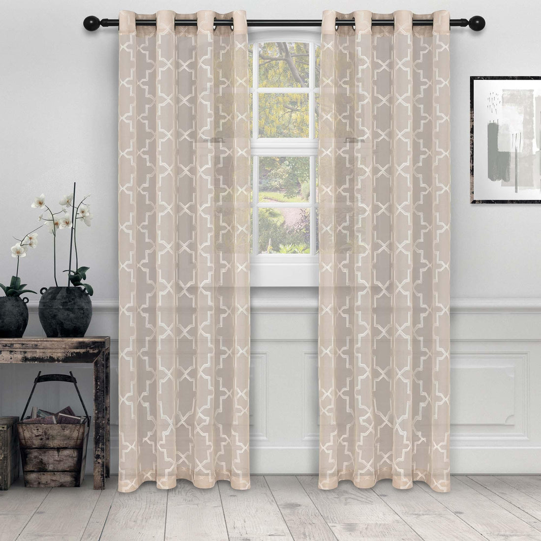 Embroidered Quatrefoil Semi Sheer 2 Piece Curtain Panel Set