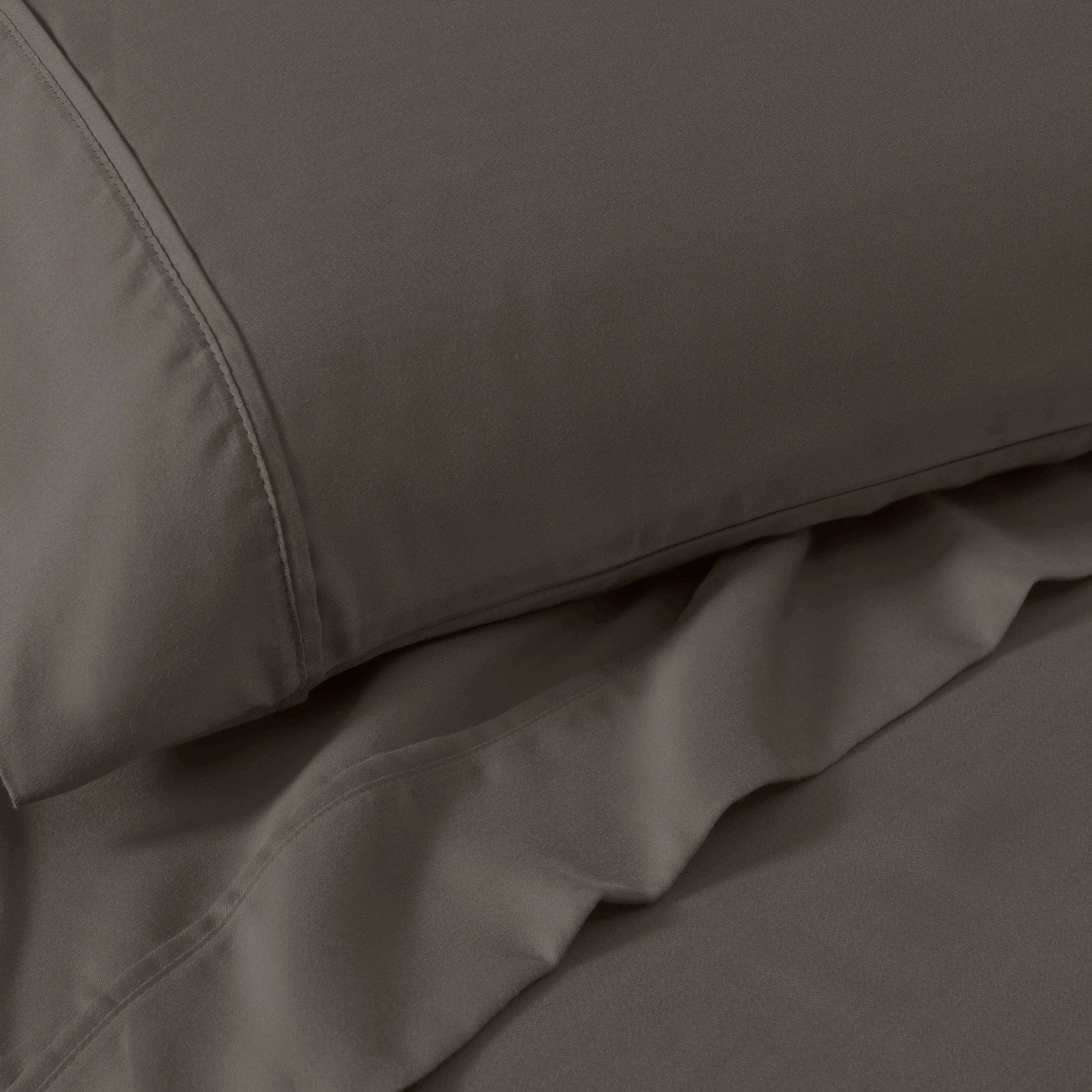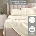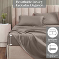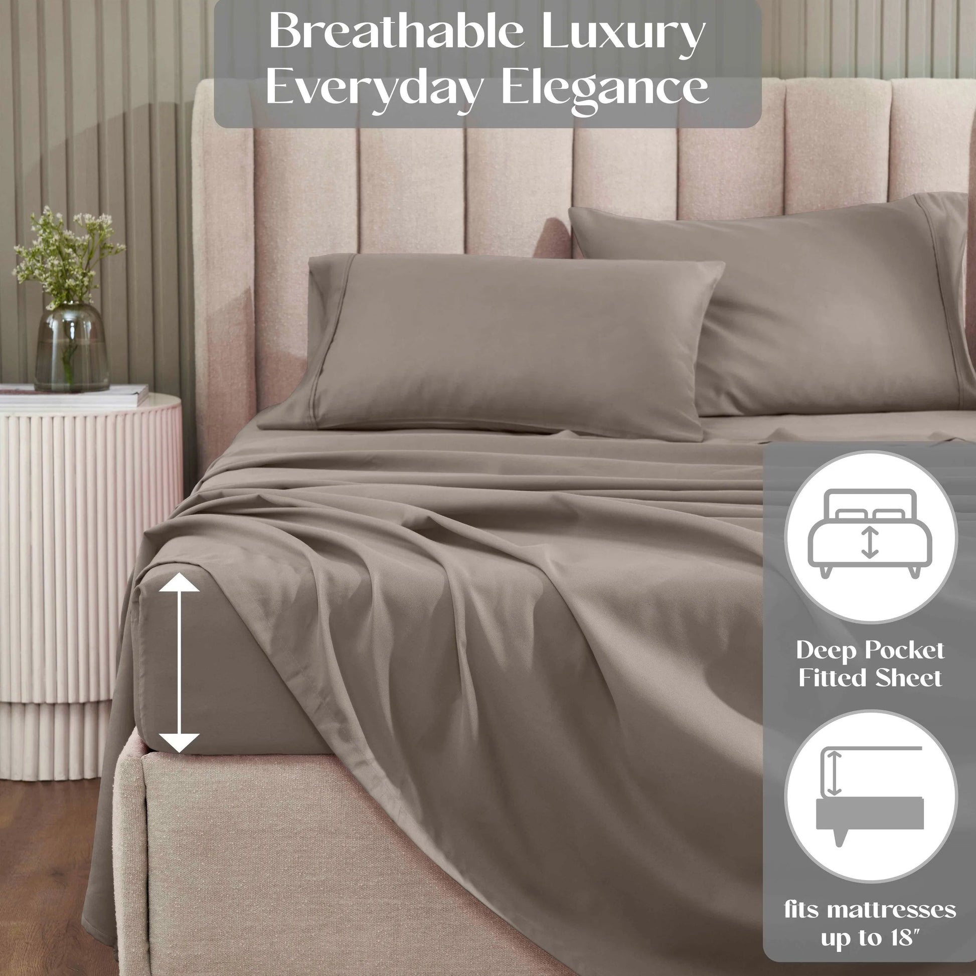 This set includes one flat sheet, one fitted sheet (with split king size including two fitted sheets), and two matching pillowcases. The fitted sheet features an all-around elastic band that stretches to 18 inches, ensuring a secure fit for deep mattresses.