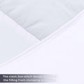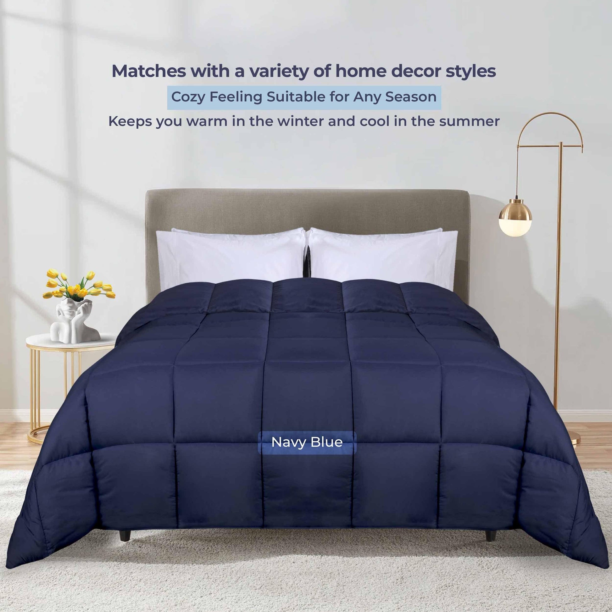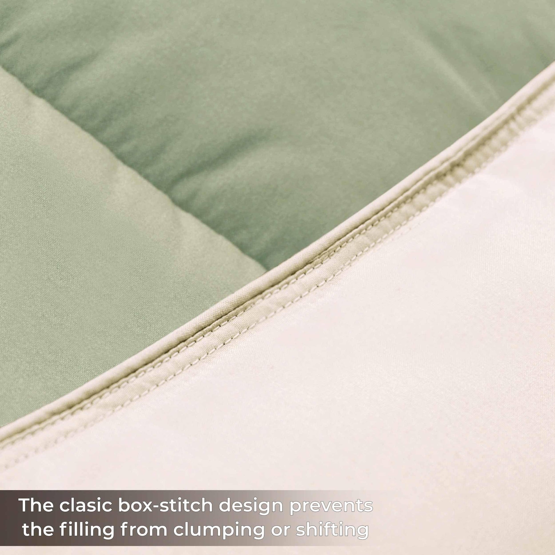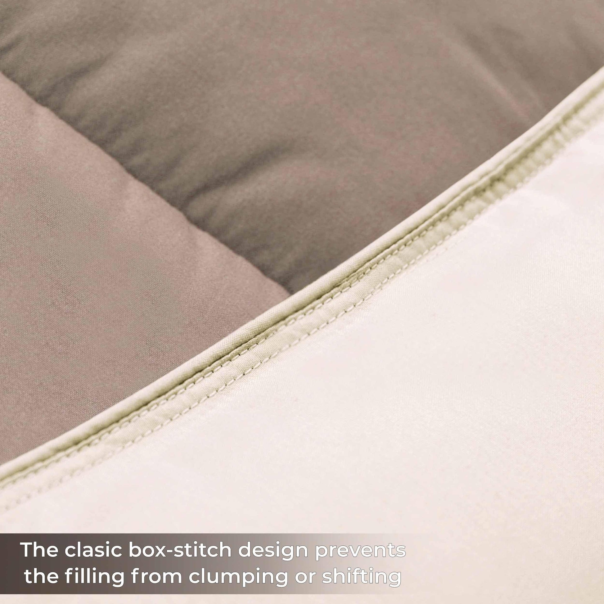 - Design Details: Box-quilt design to ensure that the down alternative polyester fill stays in place; Stitching into both the top and bottom of the comforter reduces cold areas by creating pockets that are firmly sewn shut; Medium weight warmth level for year-round comfort; Reversible design is versatile and instantly changes the look of your bedroom space; Piped edging adds a refined touch and durability.