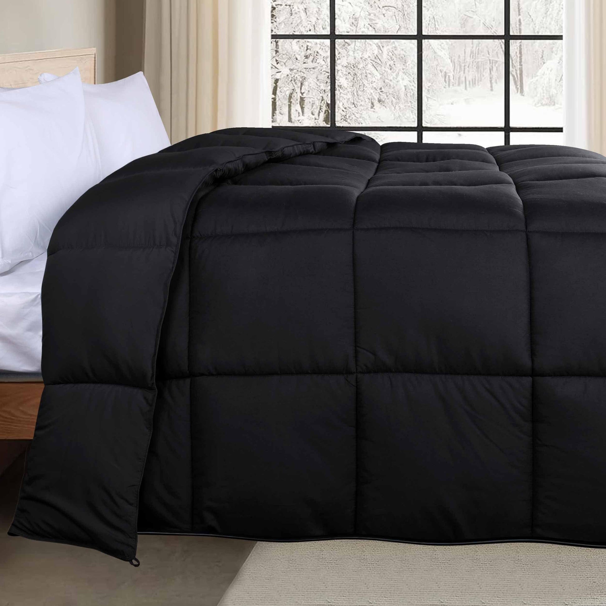Turn your bedroom into a soothing retreat with our Reversible Down Alternative Comforter. This hypoallergenic comforter features a plush-down alternative fill and an ultra-soft brushed microfiber shell that will wrap you in calming comfort every night. Displaying a reversible solid pattern and a modern box-quilt detail, this comforter will easily match your existing bedding. Breathable and not too heavy, this comforter is available in a variety of sizes and classic solid colors to perfectly fit your bedroom space.