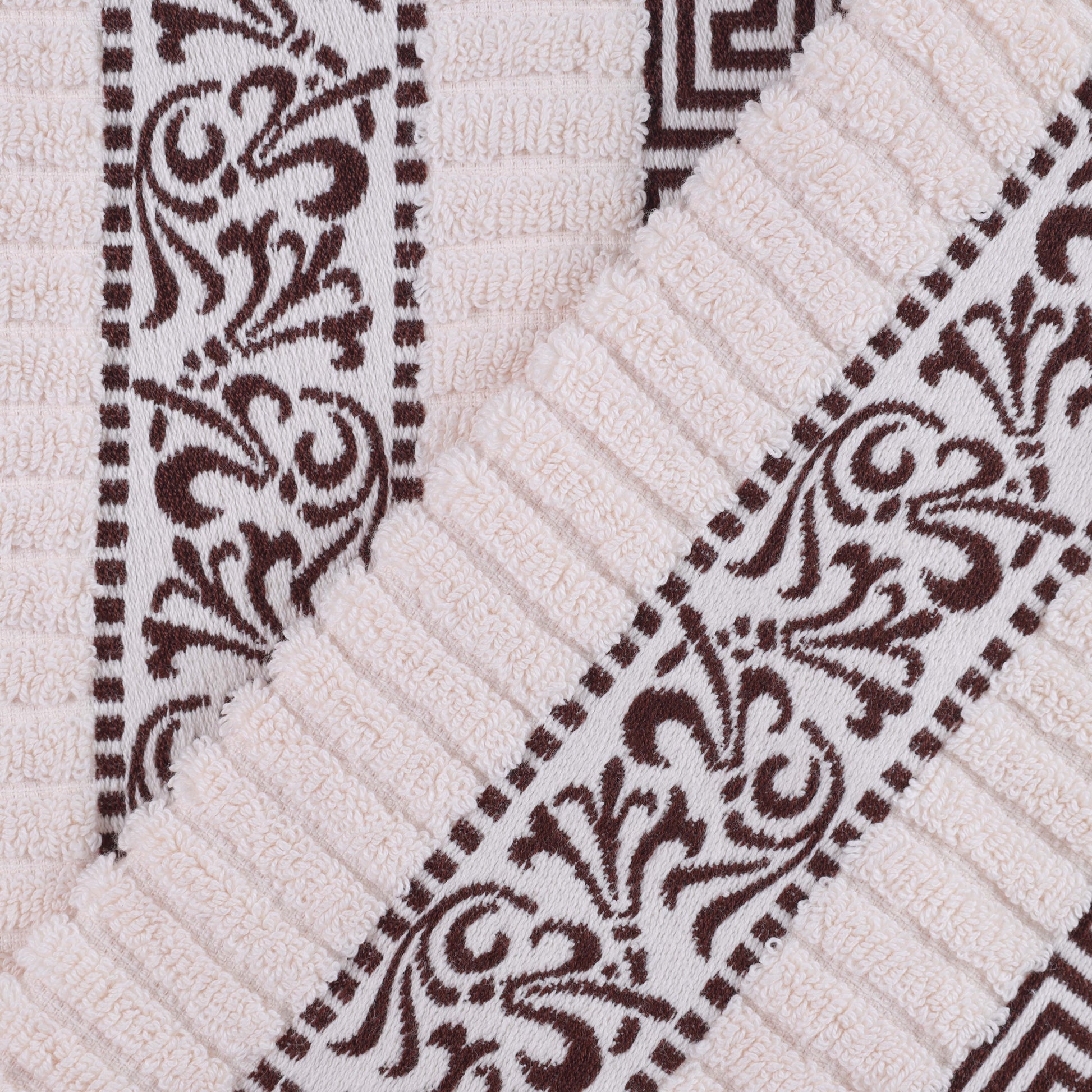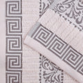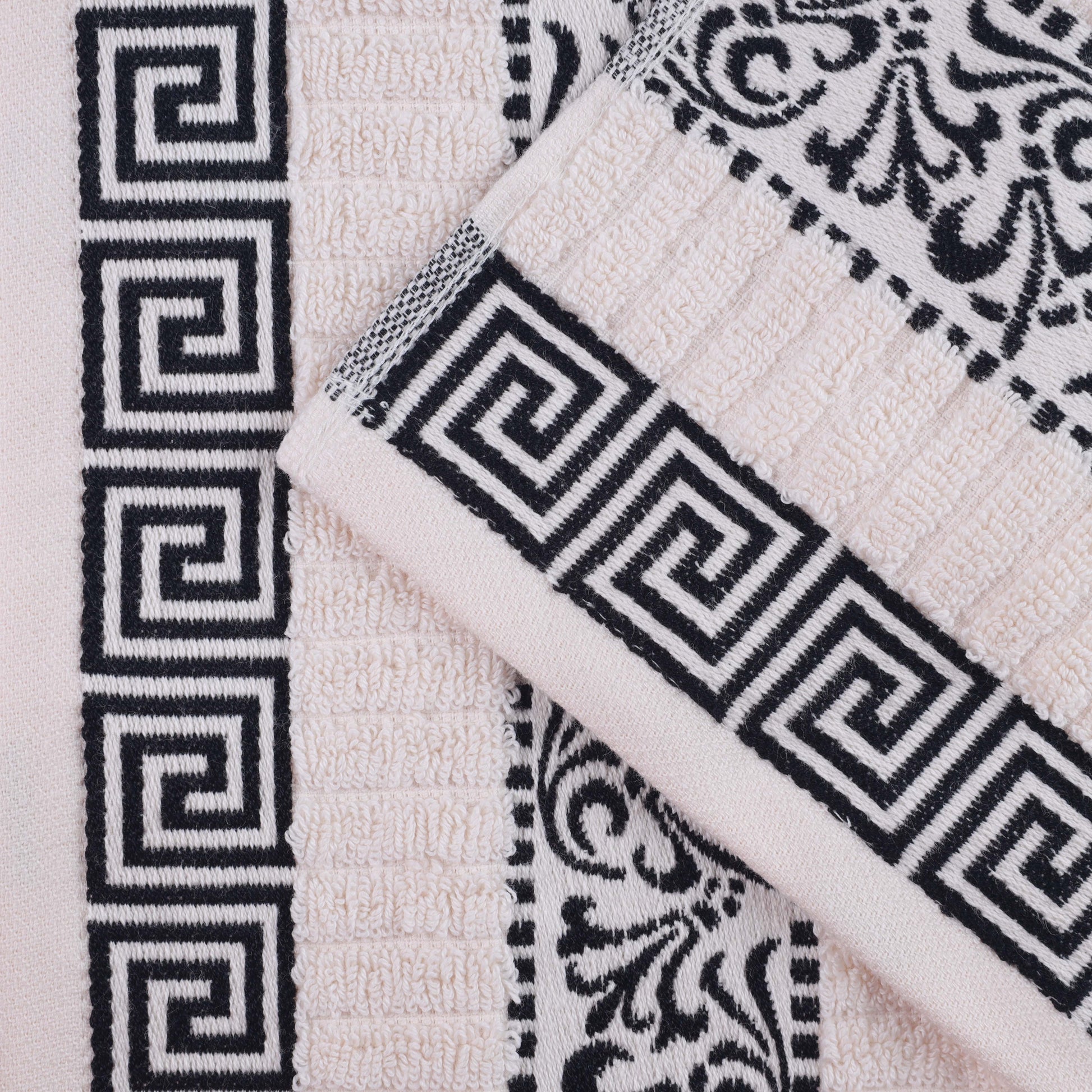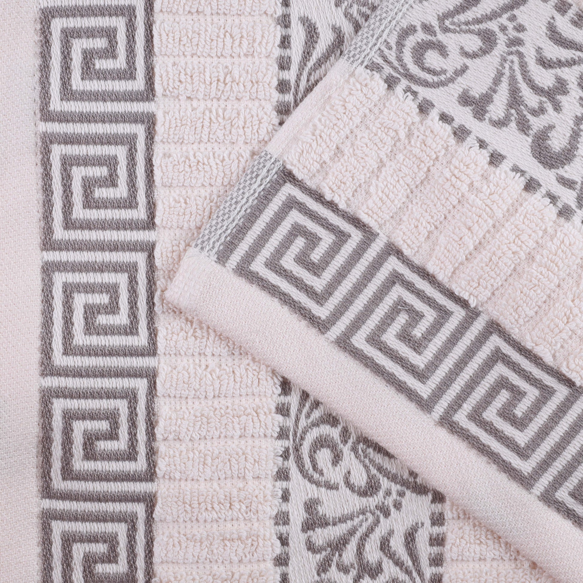 This premium cotton bath towel set combines timeless design with everyday functionality, offering softness, durability, and decorative charm in one bundle. Each towel features a detailed floral dobby border with a classic Greek key trim, making it a standout choice in towel bundles.