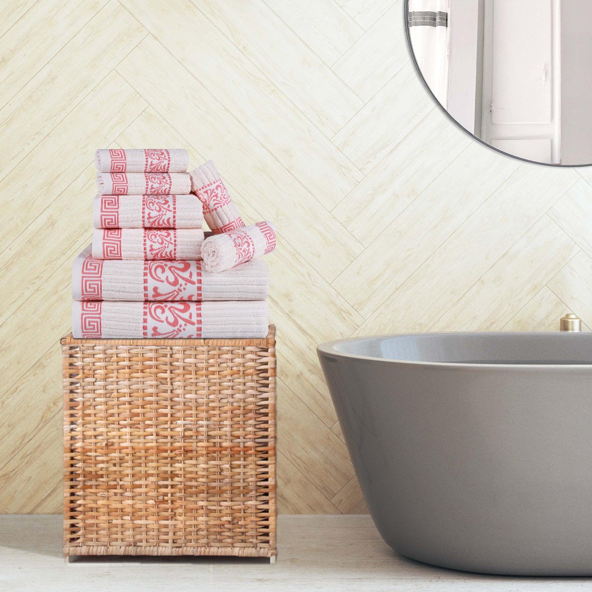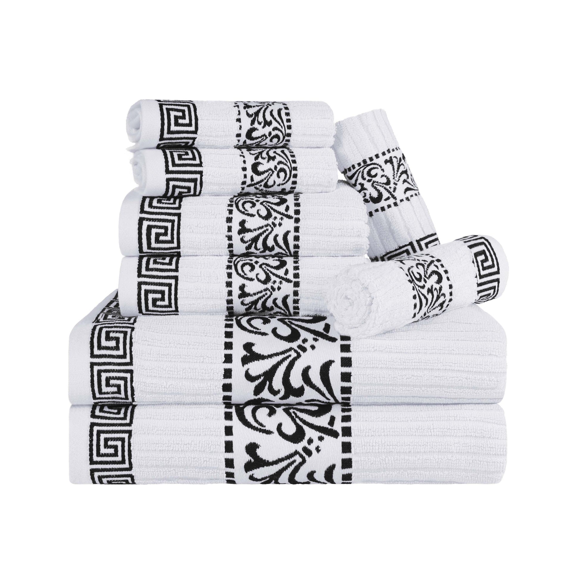 Pamper yourself with our Athens Cotton 8 Piece Assorted Towel Set. These decorative towels feature a Greek key and scroll pattern, perfect for adding a chic touch to your bathroom that will elevate your home. The luxurious bundle comes with two bath towels, two hand towels, and four face towels/ washcloths and pairs perfectly with any traditional, modern, or transitional decor styles. Well-made with plush, ring-spun cotton and a loop for easy hanging on each piece, this versatile towel set can withstand many washes while being incredibly soft on your skin.