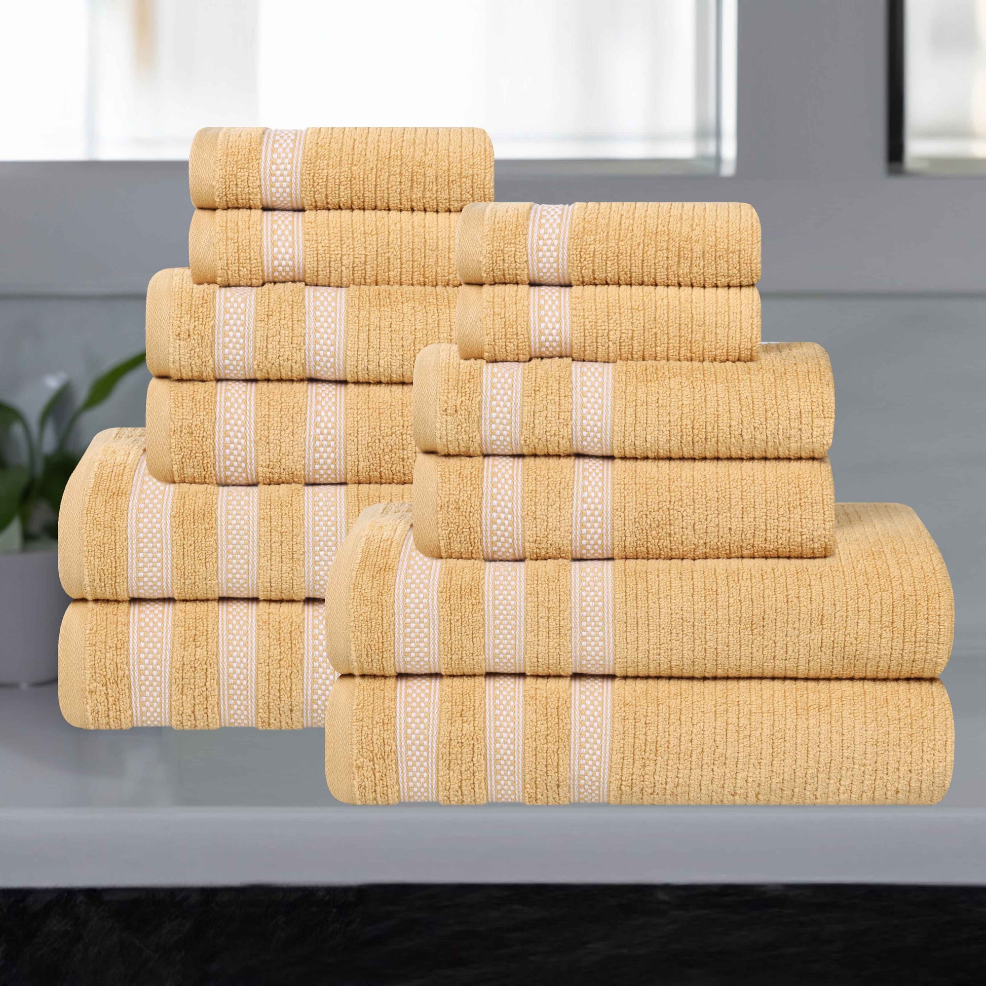 Take your bathing experience to extraordinary heights of comfort and luxury with our Brea 12 Piece Towel Set. These naturally fluffy cotton towels are crafted with a zero twist technique for a softer and more absorbent towel. Featuring an absorbent ribbed texture and delicate geometric border, bring unique style to you guest or master bathroom with this bundle. Each towel is finished with secure hemmed edges to avoid fraying and a durable single-ply to withstand countless washes. Comfortable and durable, seamlessly update your bathing essentials with this versatile set.