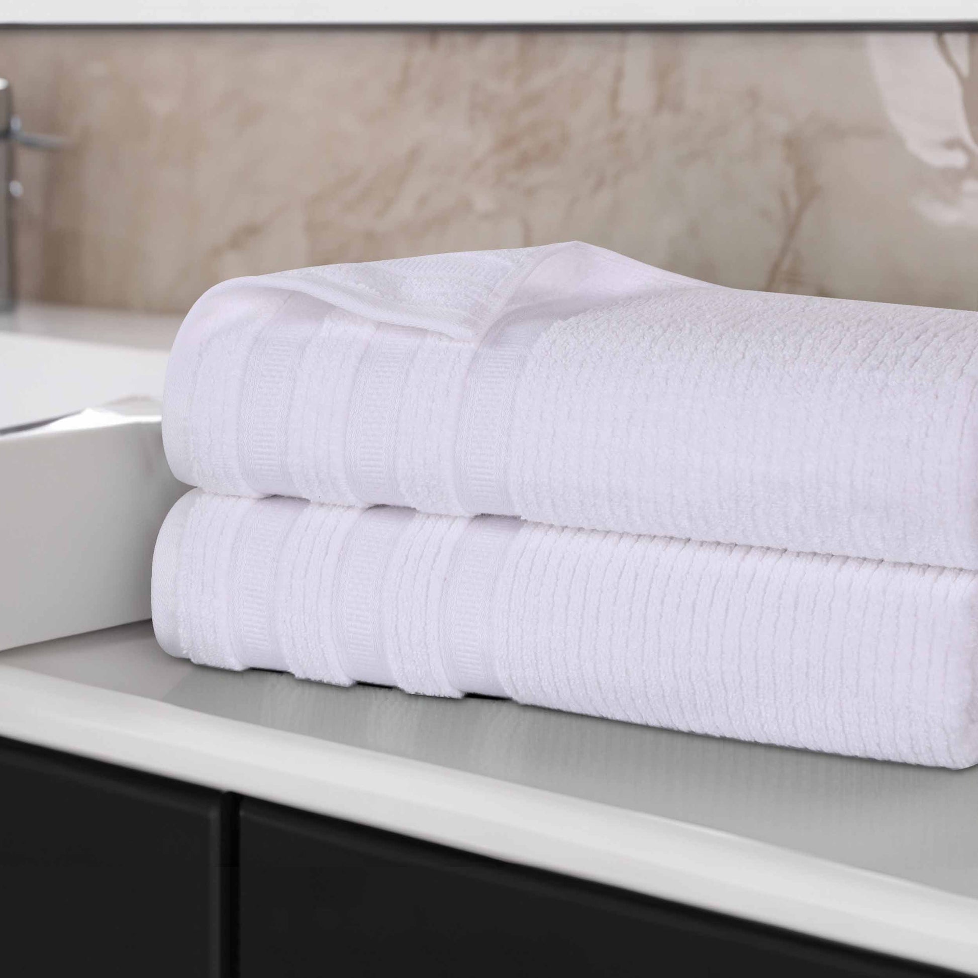 Surrender to the luxurious embrace of our Brea Bath Sheet Set. These naturally fluffy cotton towels are crafted with a zero twist technique for a softer and more absorbent towel. Featuring an absorbent ribbed texture and delicate geometric border, bring unique style to you guest or master bathroom with this bundle. Each towel is finished with secure hemmed edges to avoid fraying and a durable single-ply to withstand countless washes. Comfortable and durable, seamlessly update your bathing essentials with this versatile set.