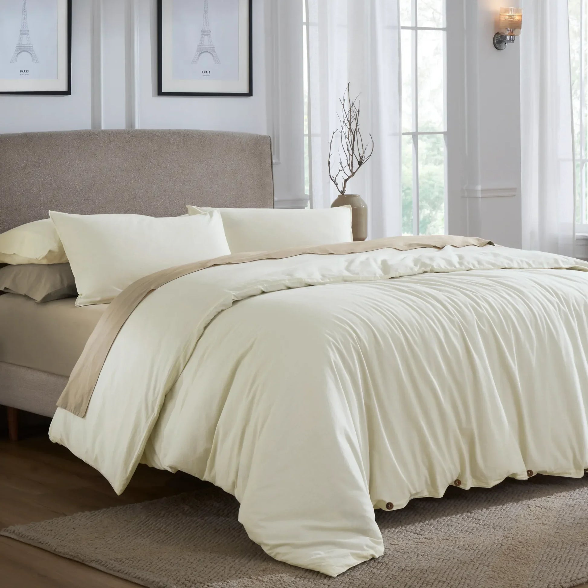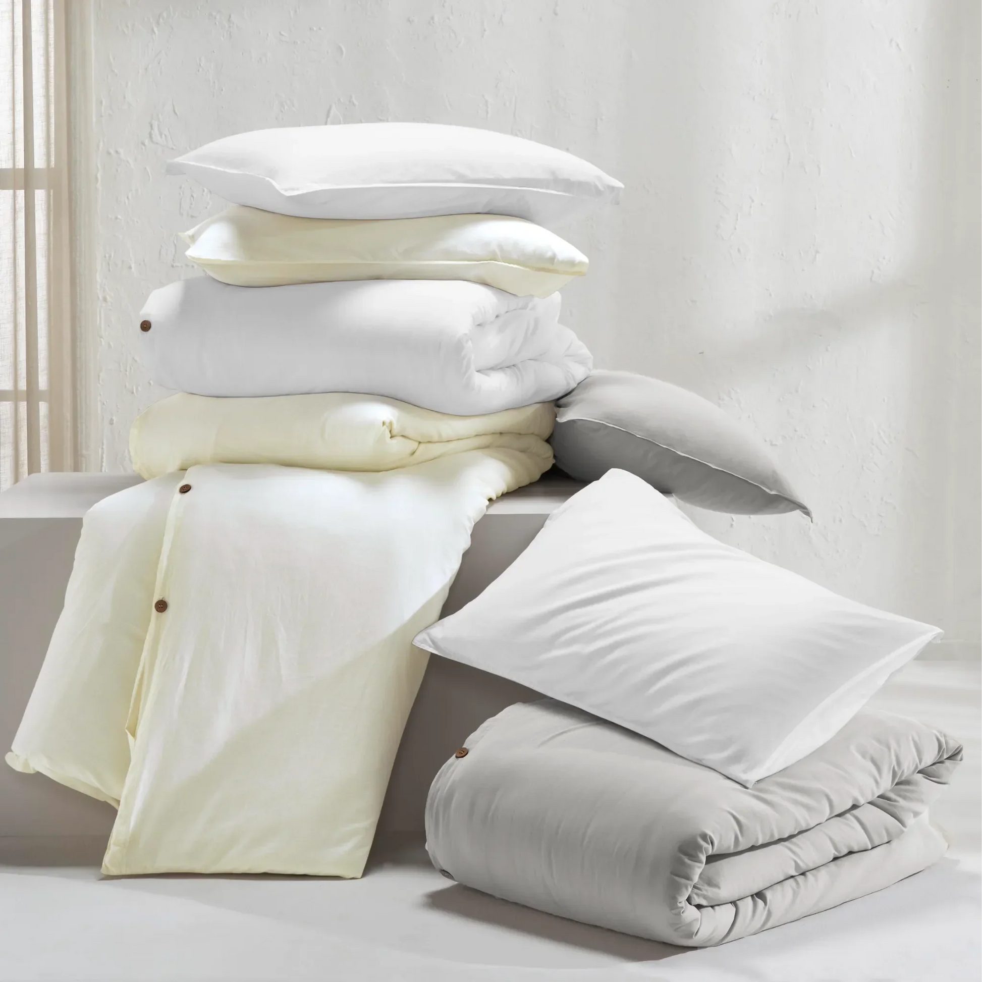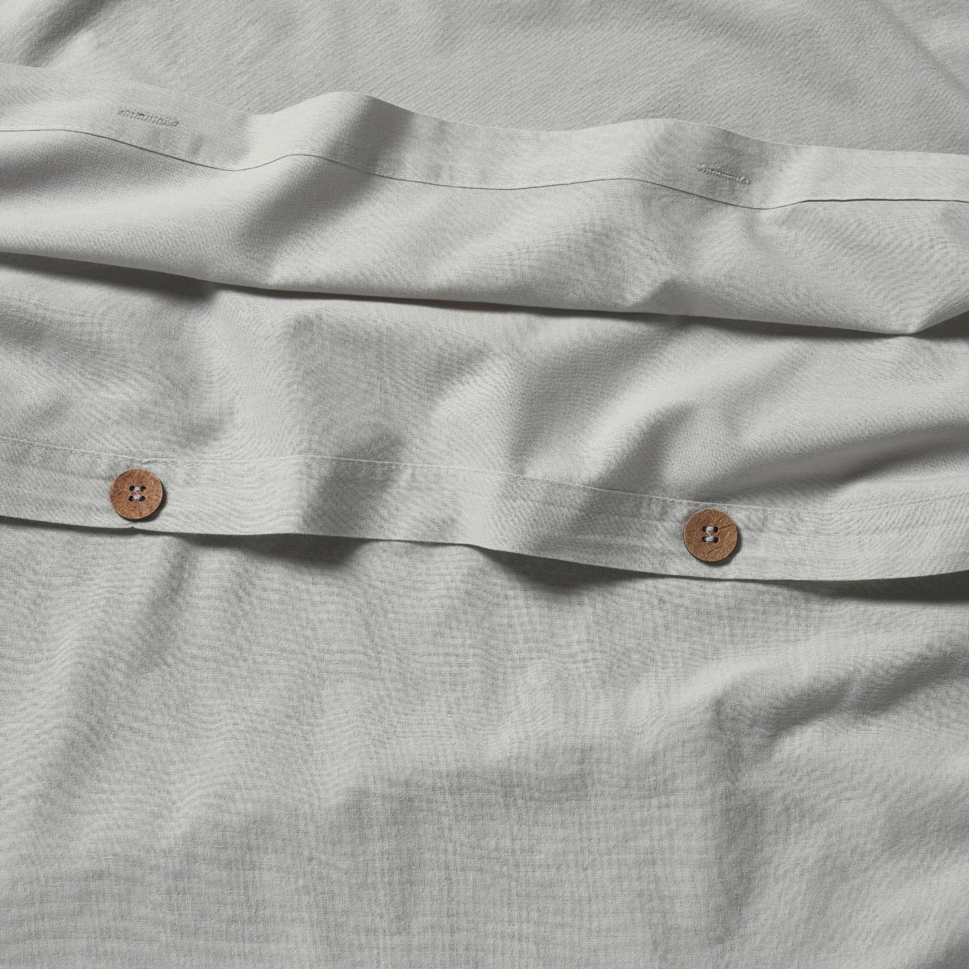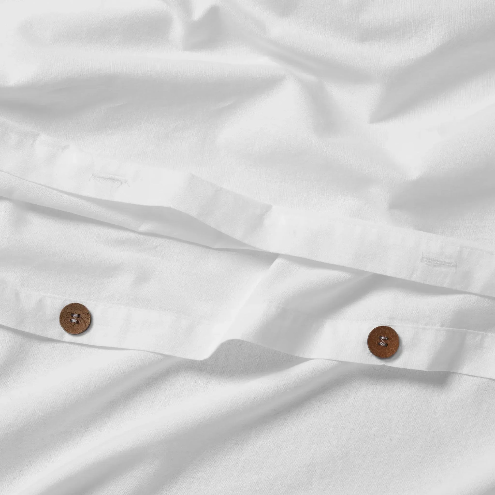 Bring casual refinement to your bedroom with the Carmen Duvet Cover Set. Woven from lightweight cotton percale and softened through vintage washing, this set delivers a breezy linen-like feel with a cooling touch. Designed with natural coconut shell buttons, internal corner ties, and envelope-closure shams, it’s an artful blend of organic texture and effortless function.
