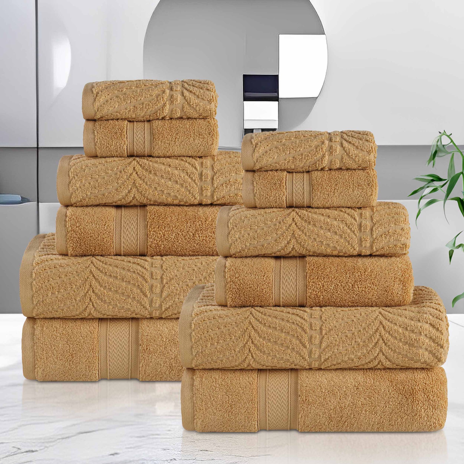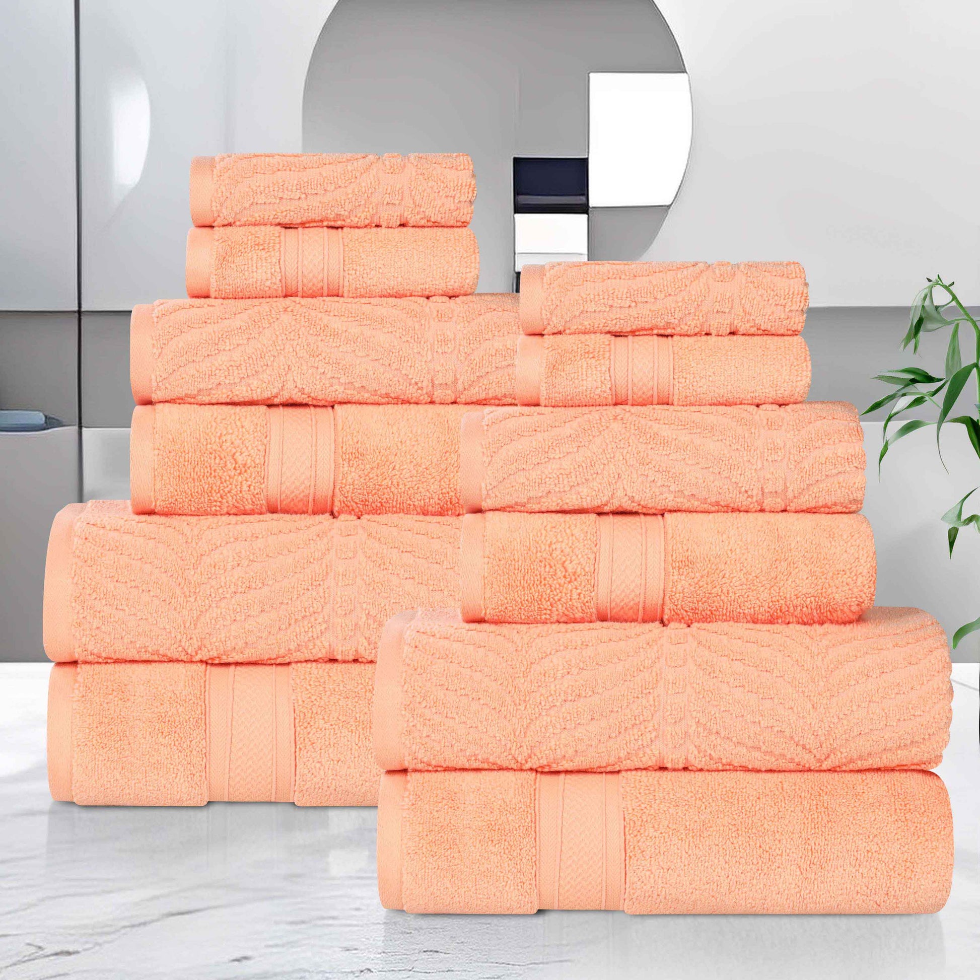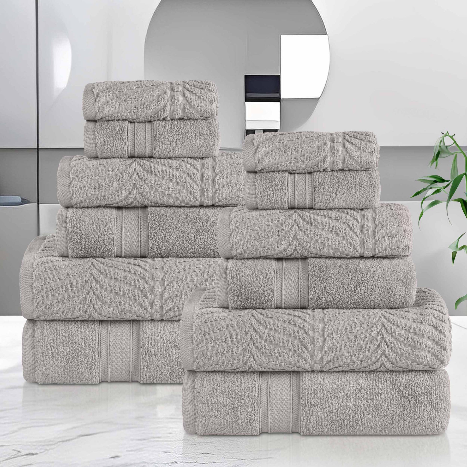 Transform your bathroom into a tranquil resort with our Chevron Solid and Jacquard 12 Piece Towel Set. Our fluffy cotton towels have a luxuriously soft feel and the zero twist weave is plush, and highly-absorbent to get you dry quickly. The medium weight thickness of each towel is versatile and perfect for the bath, poolside, or at the beach. Boasting both solid and jacquard, chevron designs, bring unique style to your guest or master bathroom with this bundle. Each towel is finished with secure hemmed edges to avoid fraying and a durable single-ply to withstand countless washes and last you years to come. Featuring a hanging loop on each piece, enjoy both convenience and comfort with this versatile set.