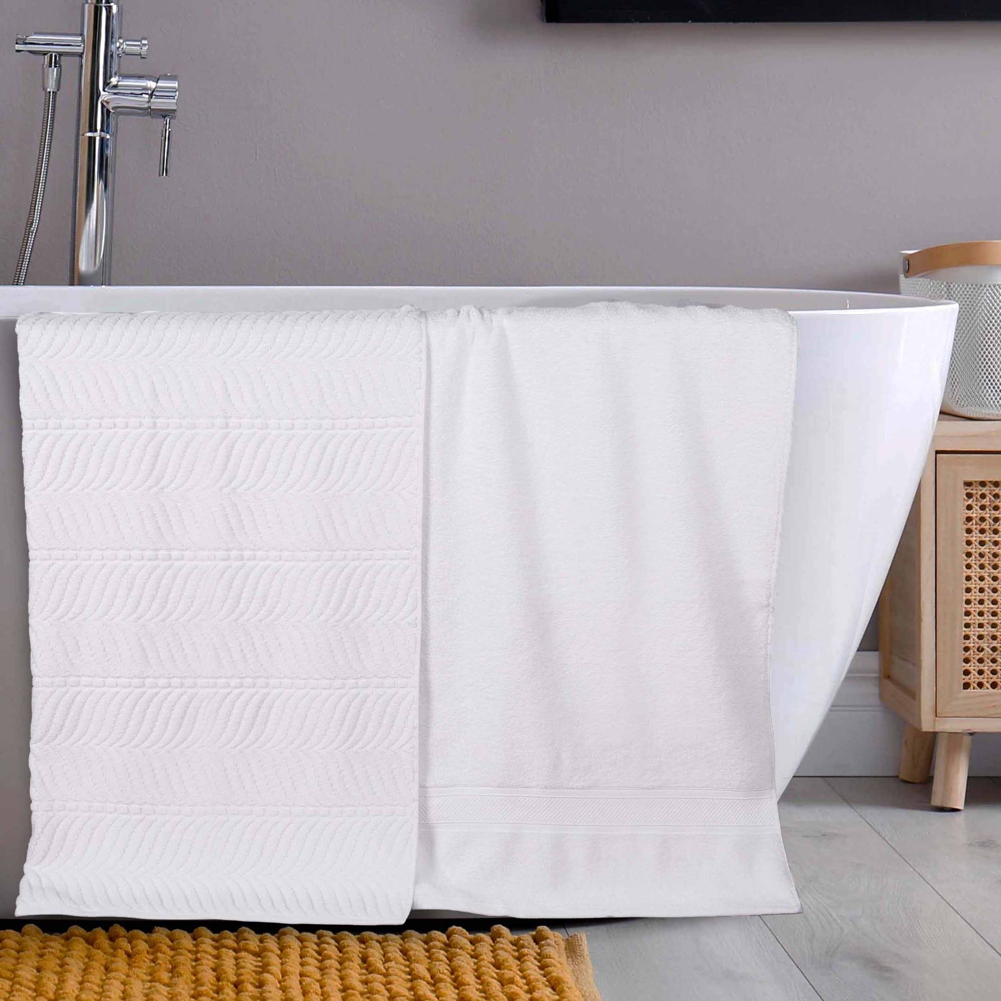Wrap yourself in the lavish comfort of our Chevron Solid and Jacquard Bath Sheet Set. Our fluffy cotton bath sheets have a luxuriously soft feel and the zero twist weave is plush, and highly-absorbent to get you dry quickly. The medium weight thickness of each oversized towel is versatile and perfect for the bath, poolside, or at the beach. Boasting both solid and jacquard, chevron designs, bring unique style to your guest or master bathroom with this duo. Each bath sheet is finished with secure hemmed edges to avoid fraying and a durable single-ply to withstand countless washes and last you years to come. Featuring a hanging loop on each piece, enjoy both convenience and comfort with this versatile set.