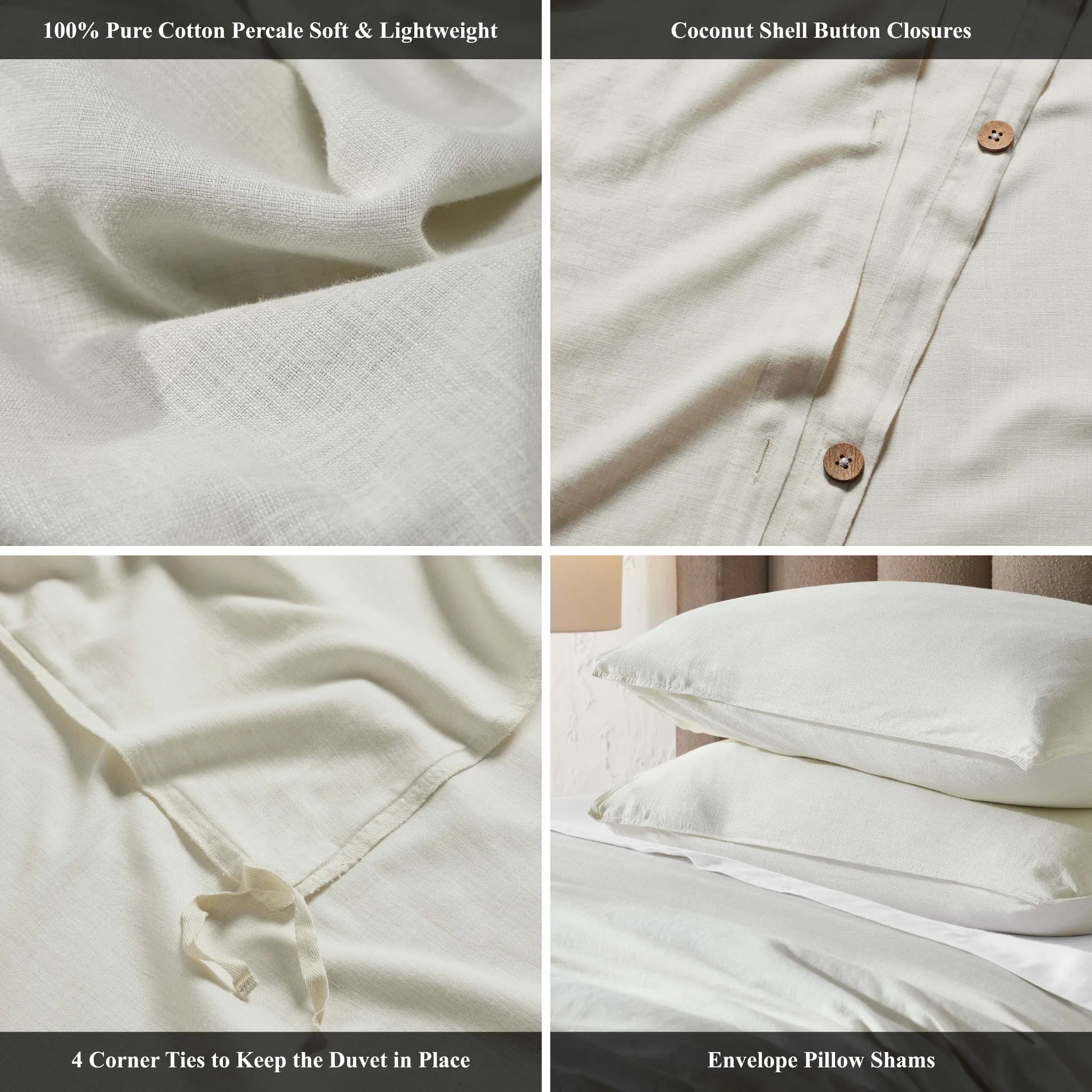 Breezy, beautiful, and effortlessly refined—the Chloe Duvet Cover Set blends crisp cotton percale with a soft, garment-washed finish. Thoughtfully designed with coconut shell buttons, corner ties, and envelope shams, it's a perfect balance of rustic charm and modern ease.