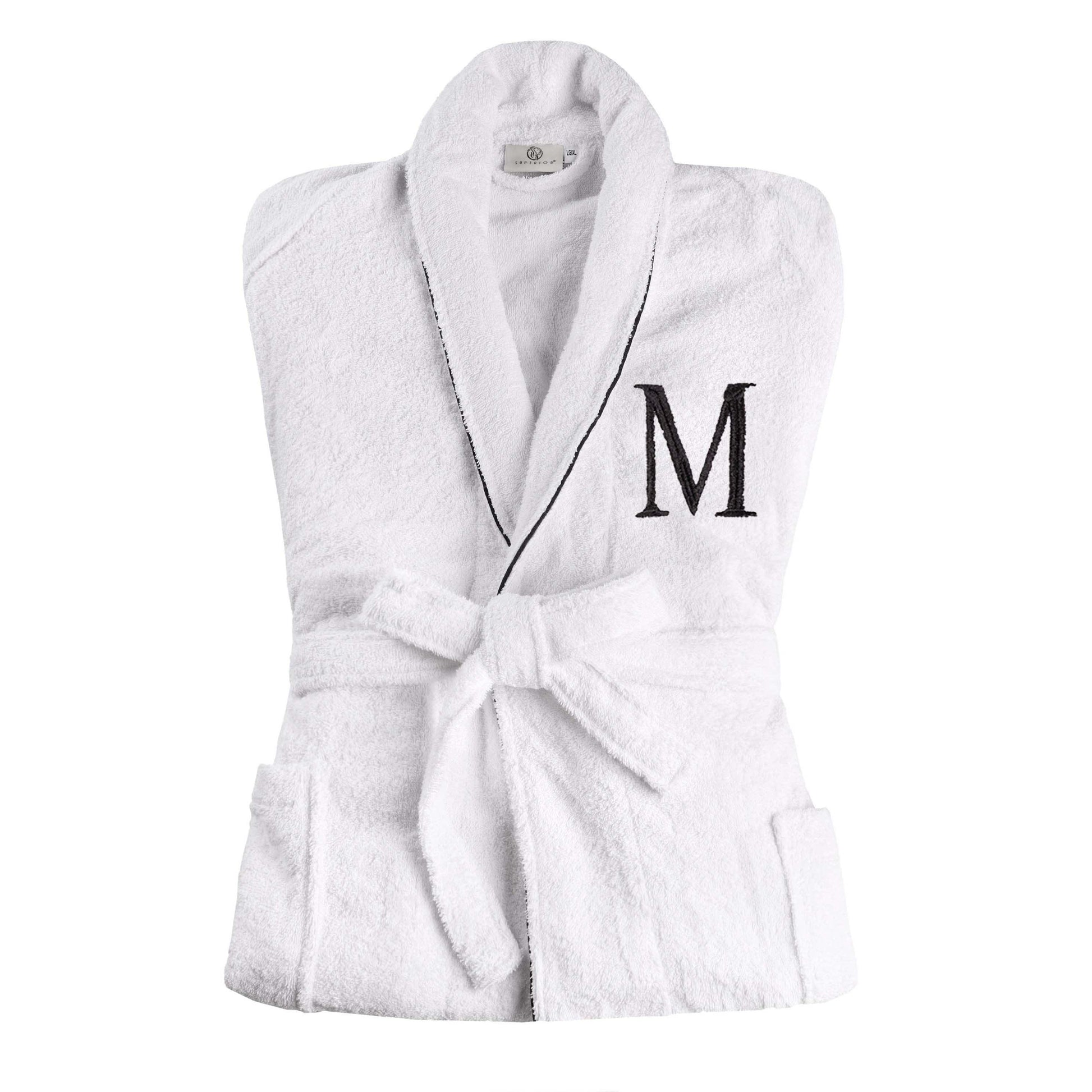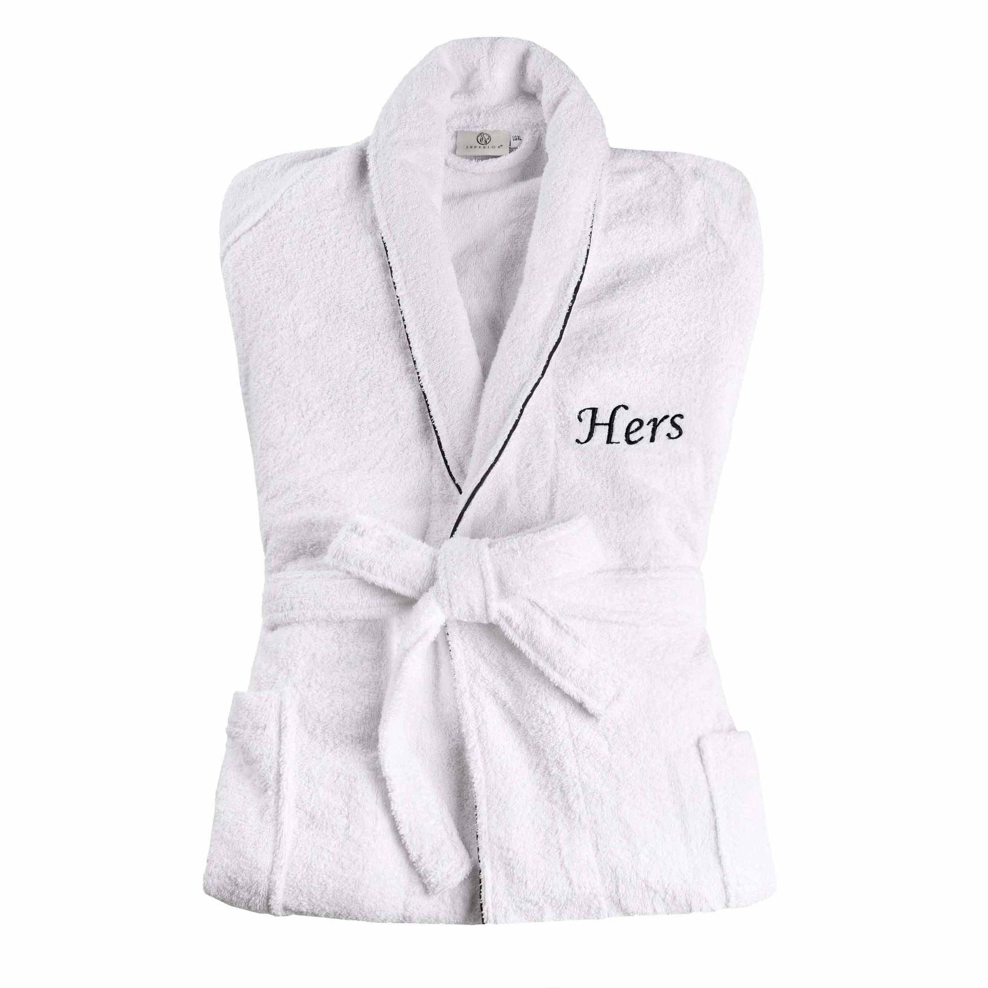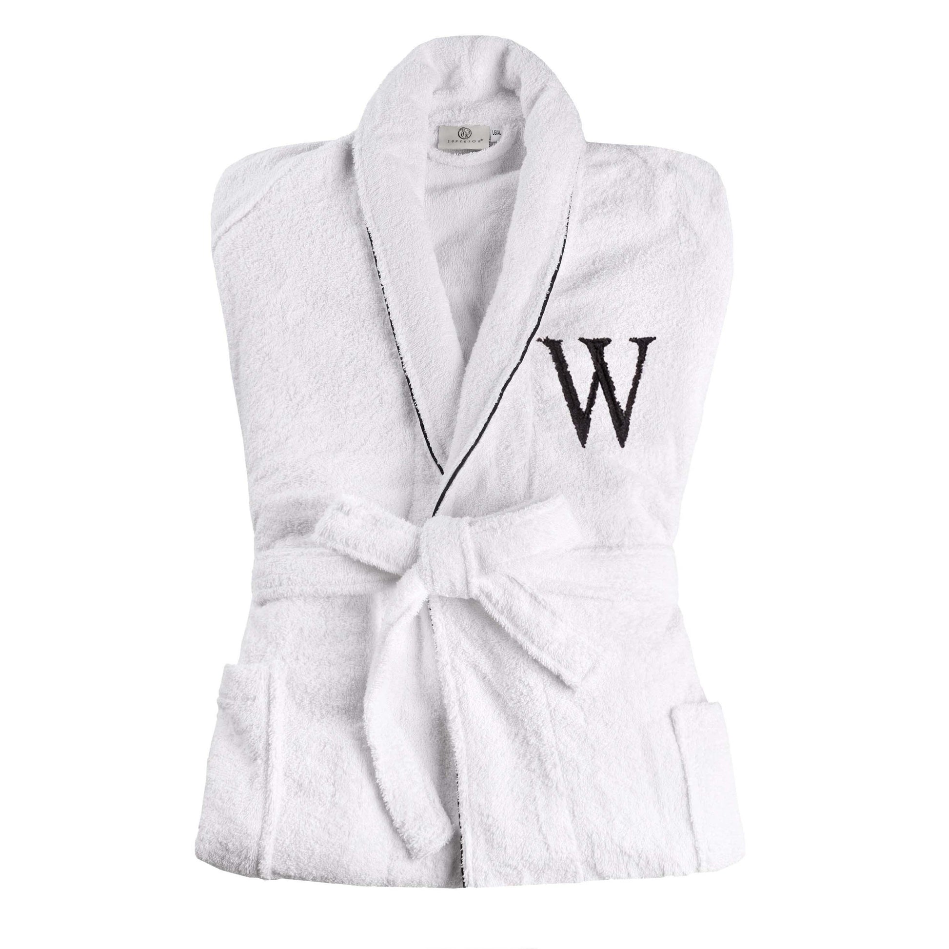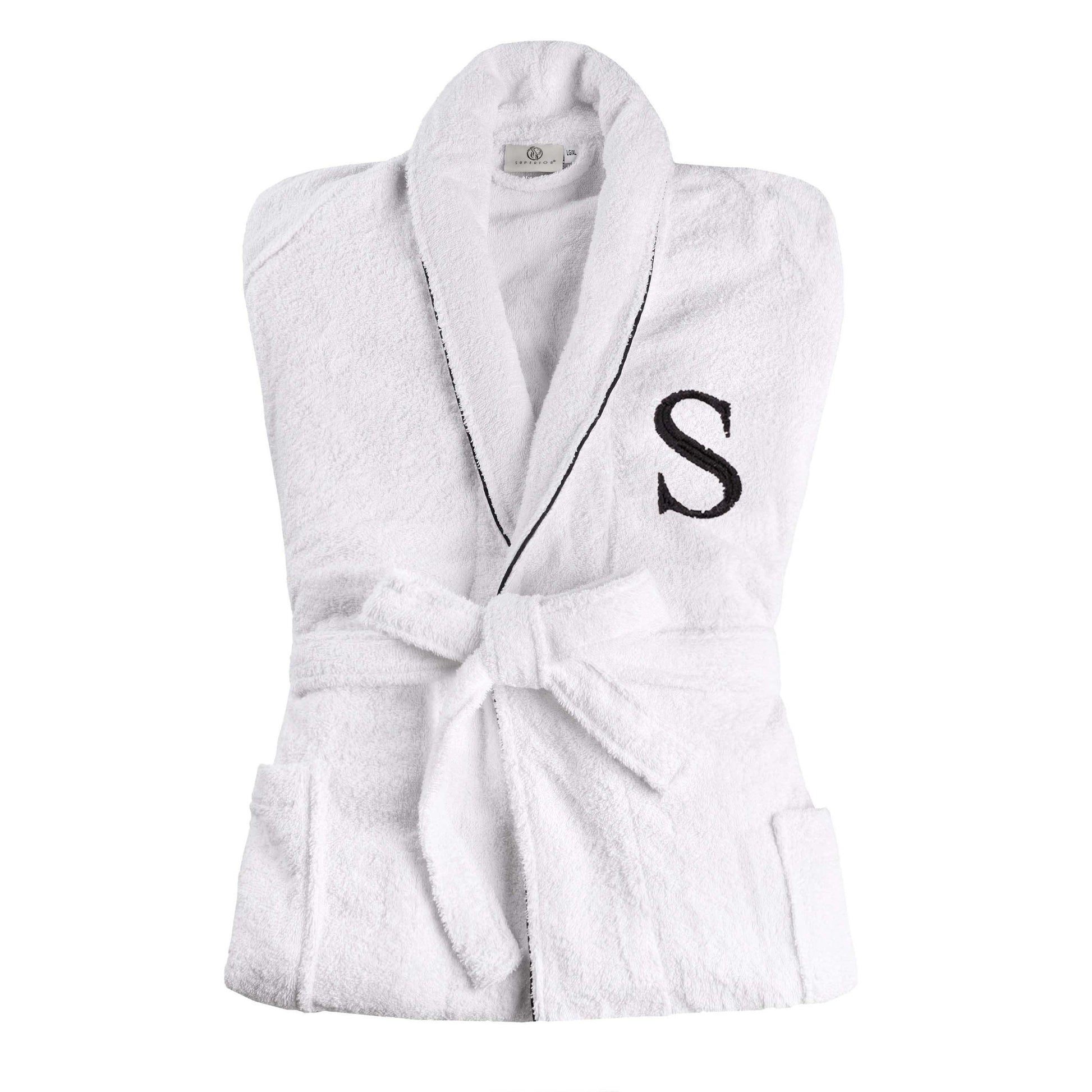 - Design Details: Solid white bathrobe with black piping and your choice of monogram: alphabet, His/Hers, Superior logo, or no monogram.