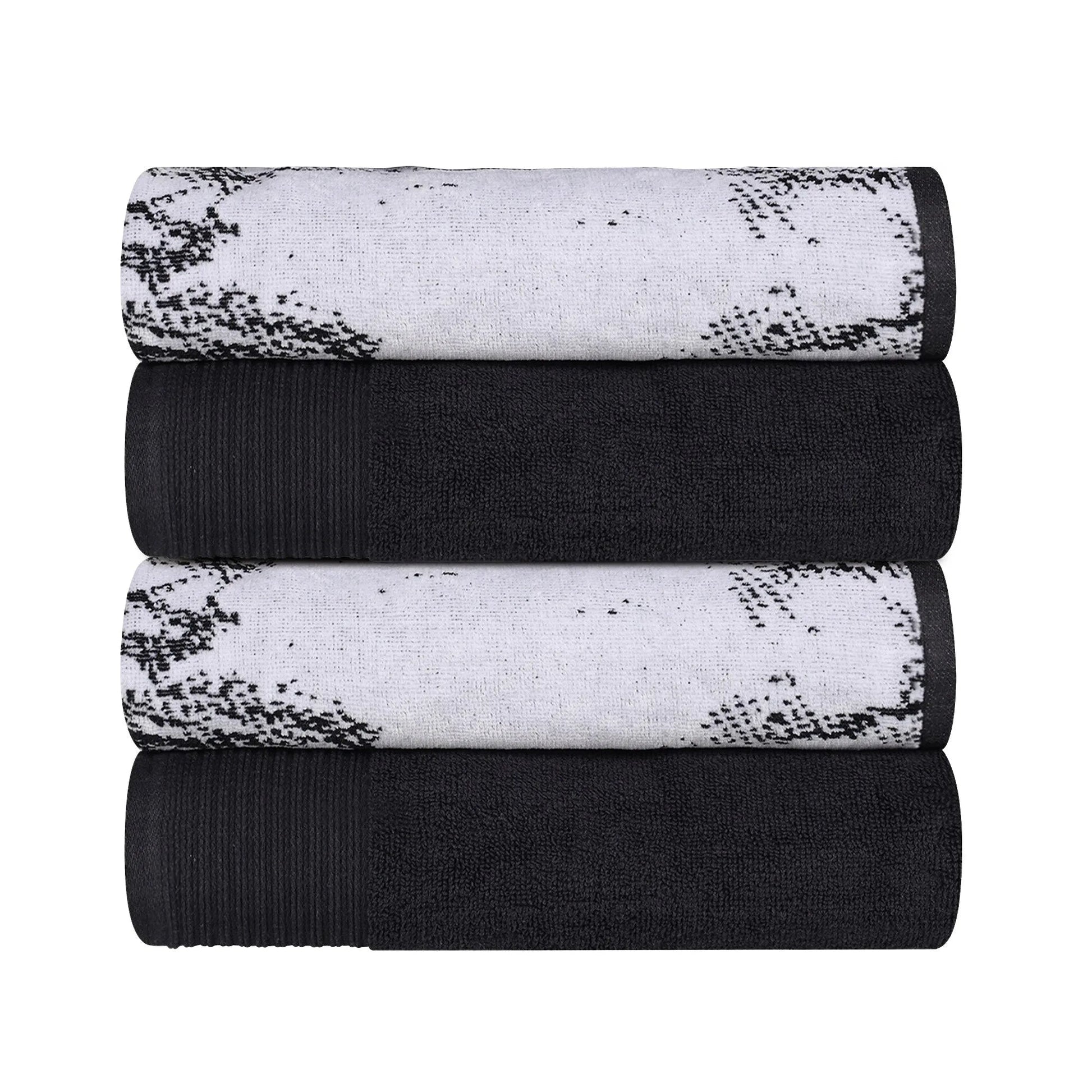 The towel bundle includes four full-size bath towels in two distinct styles: a sophisticated solid towel with a rope-style jacquard border and a stylish marble-effect design.