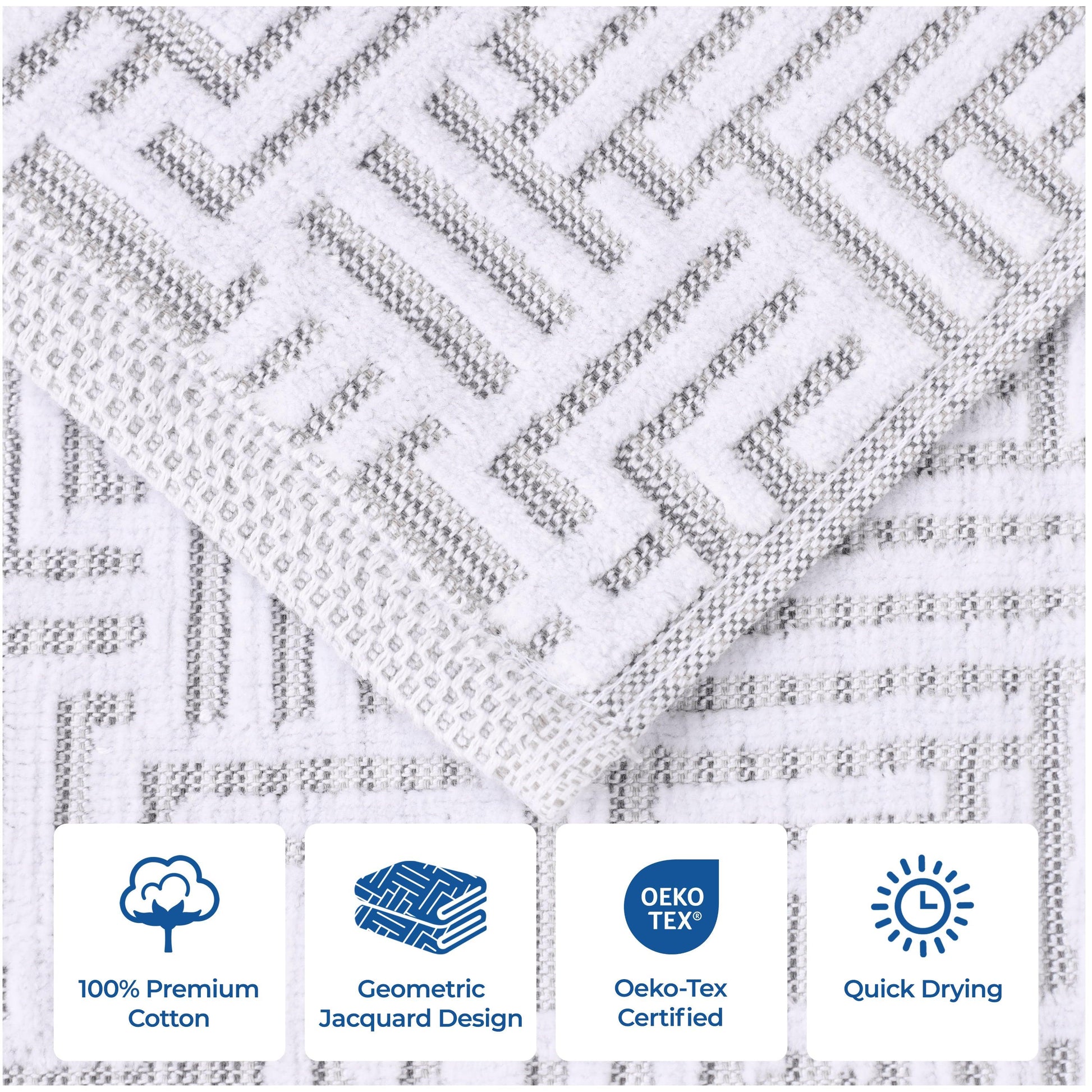 Elevate your home essentials to new levels of luxury with the Superior Cotton Modern Geometric Jacquard Plush Soft Absorbent 9-Piece Towel Set. These 100% Cotton towels are crafted for a soft, absorbent, and luxurious experience. Boasting a textured geometric jacquard pattern, bring unique style to you guest or master bathroom with this bundle. Each towel is finished with secure hemmed edges to avoid fraying and a durable single-ply to withstand countless washes and last you years to come. Featuring a hanging loop on each piece, enjoy both convenience and comfort with this versatile set.