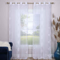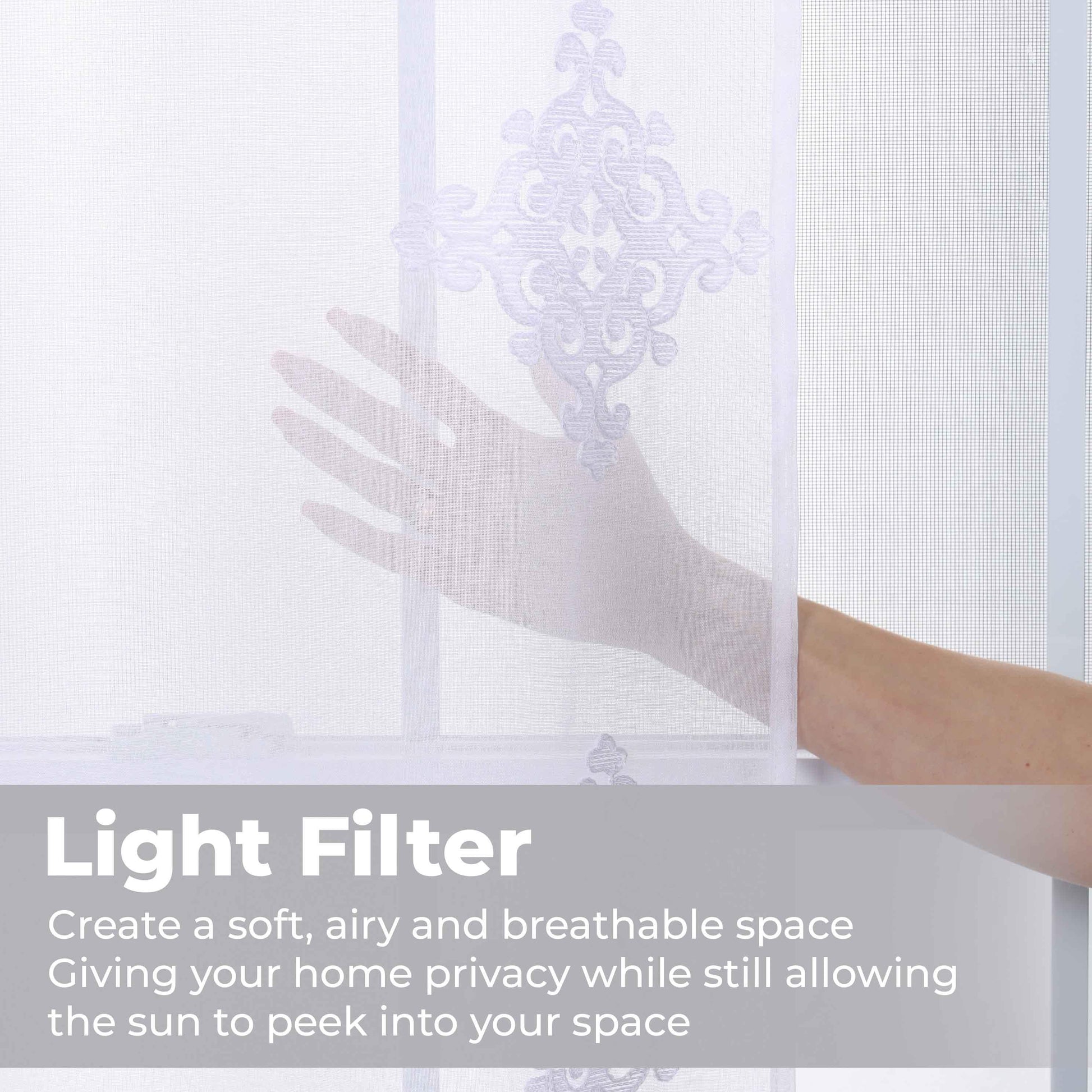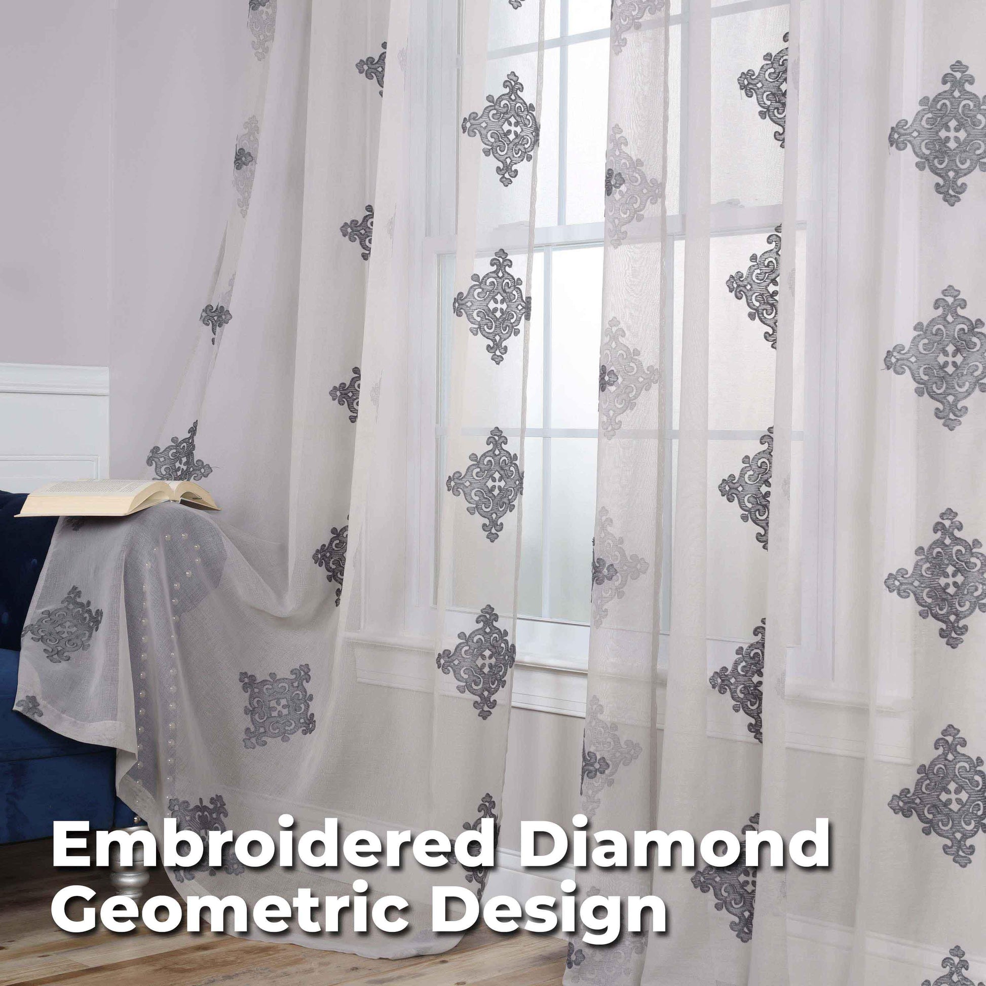 Create a warm and inviting space with the Sheer Traditional Embroidered Damask Grommet Curtain Panel Set. These transparent curtains are crafted from 100 percent Polyester and showcase a beautiful damask diamond pattern that is sure to blend seamlessly with your surrounding décor. The lightweight material gives your room a romantic and charming feel while the stainless, polished grommet header brings a sophisticated and modern flourish to your windows. Available in 4 different lengths ranging from 63†to 108â€, these gorgeous sheers add the perfect finishing touch while instantly transforming your space.