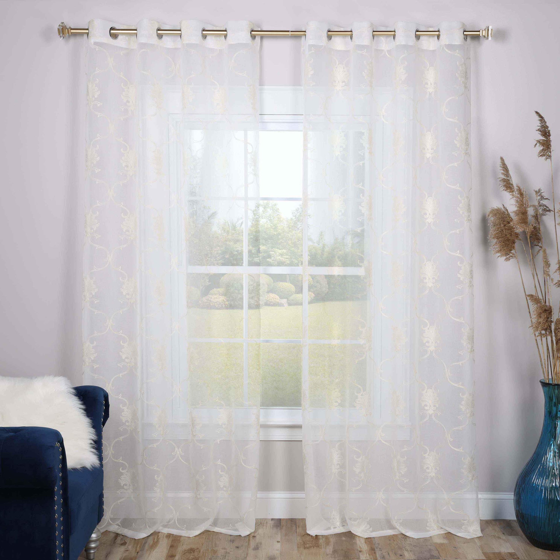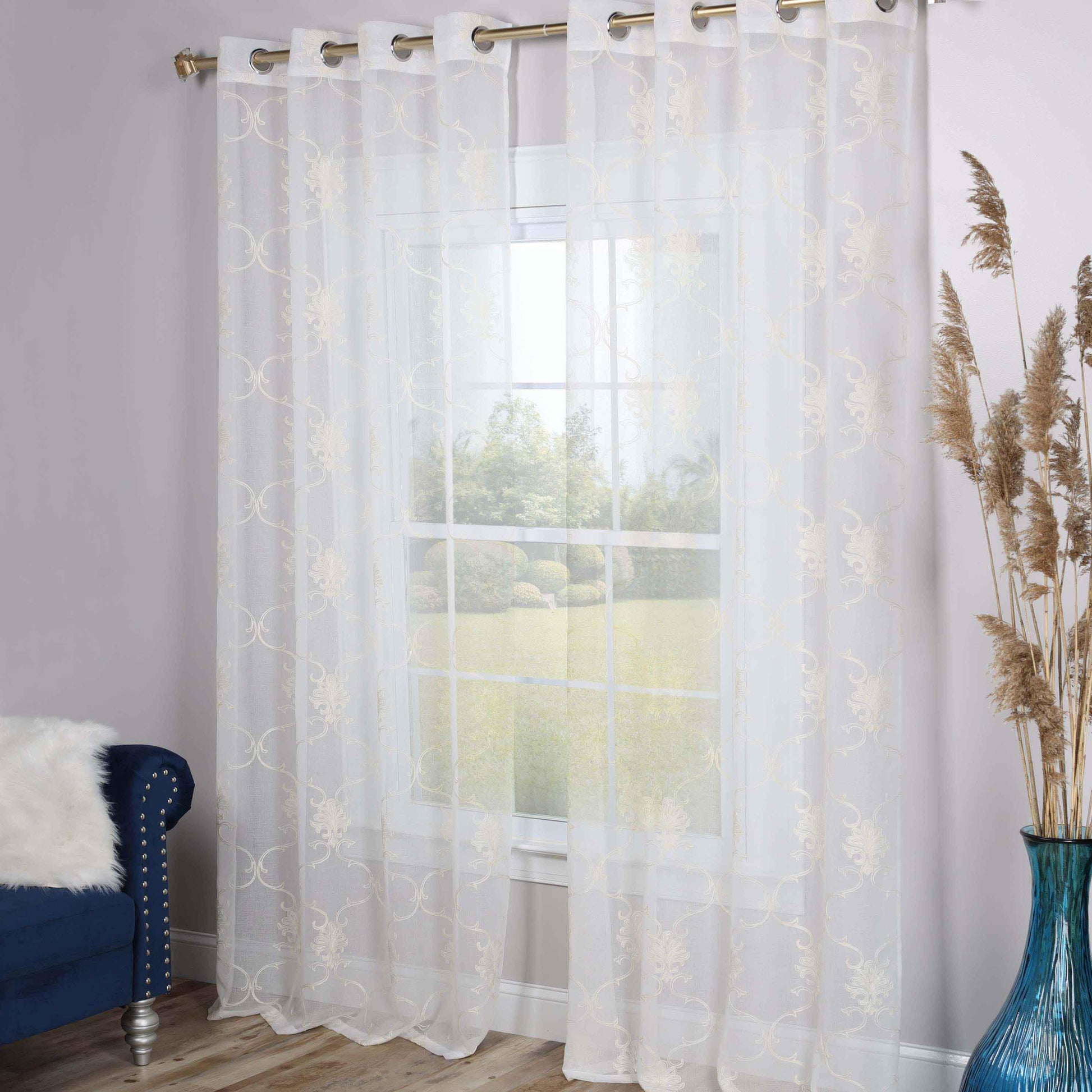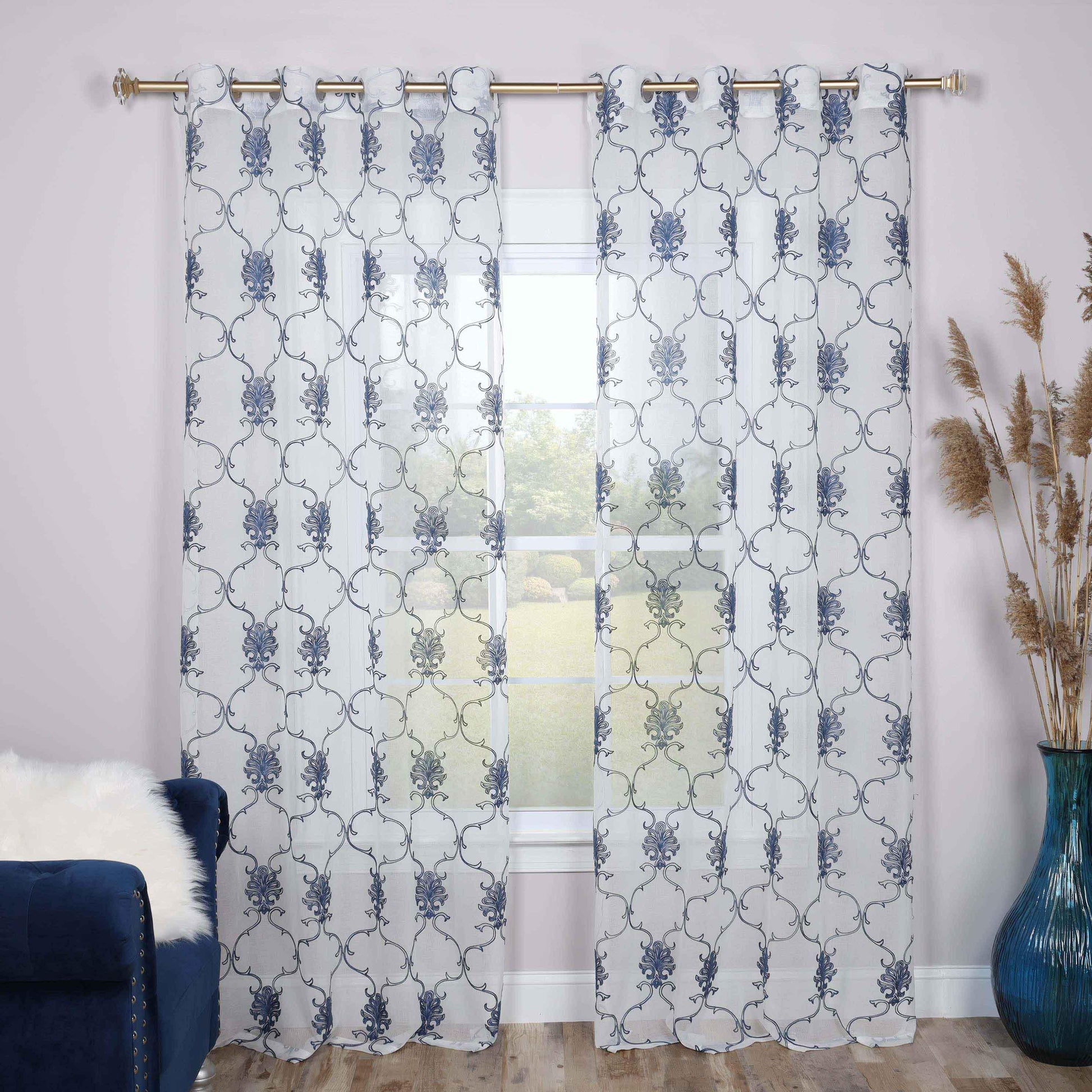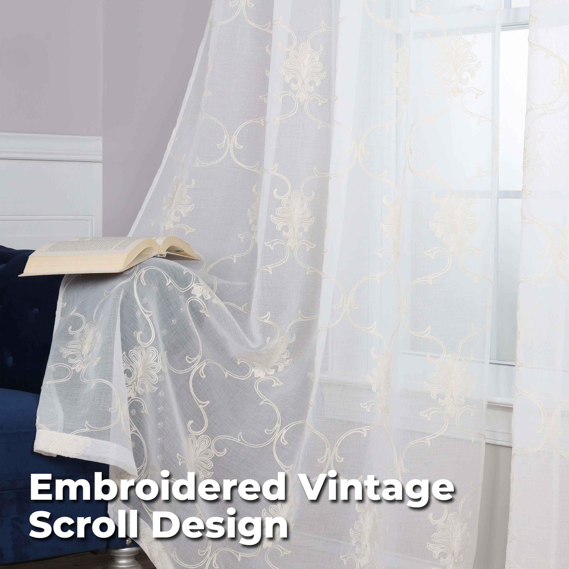 Embroidered Elegant Scroll Sheer Grommet Curtain Panel Set