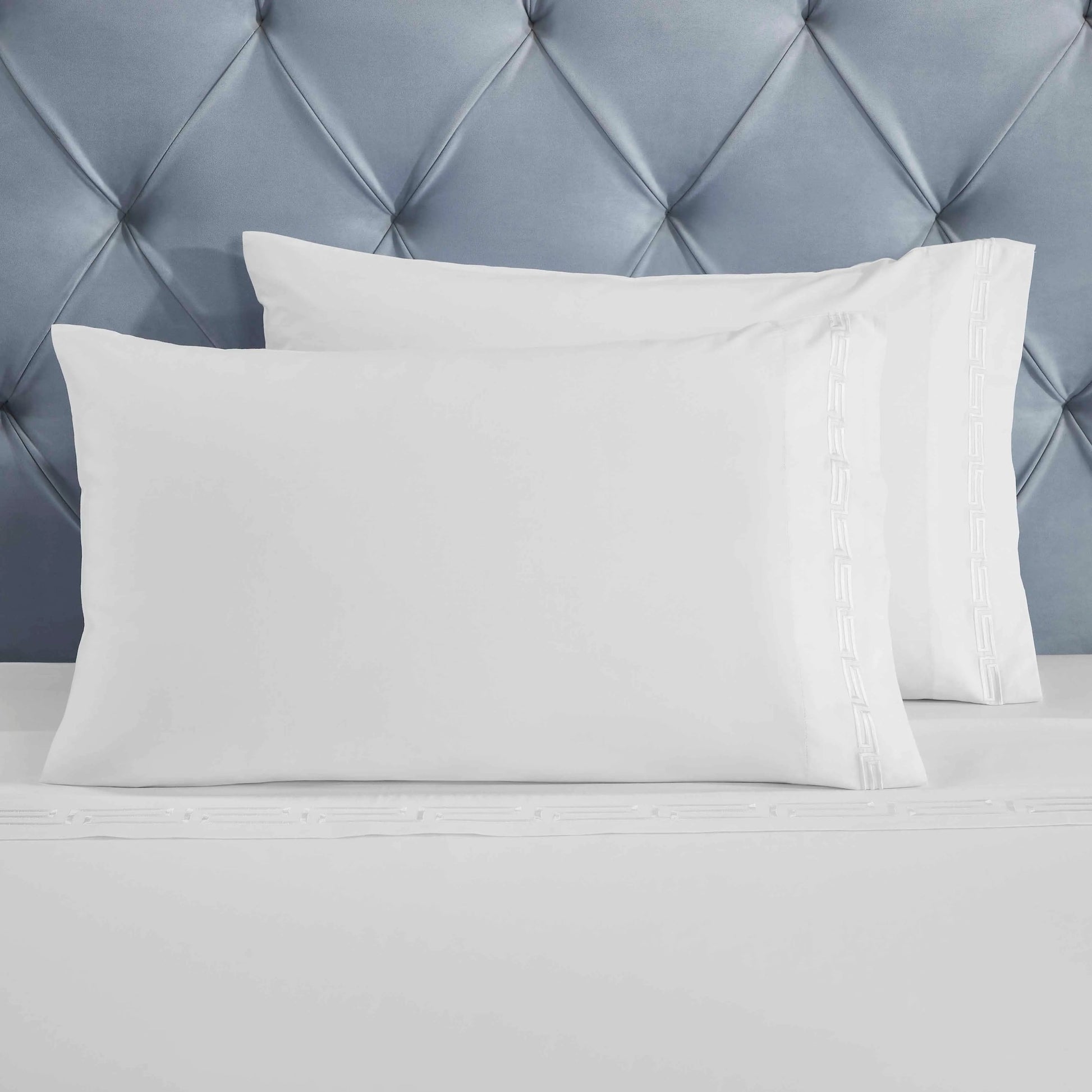 Featuring a modern Greek Key embroidery design and a subtle shimmer from the sateen weave, this sheet set creates a luxurious atmosphere perfect for any bedroom style.