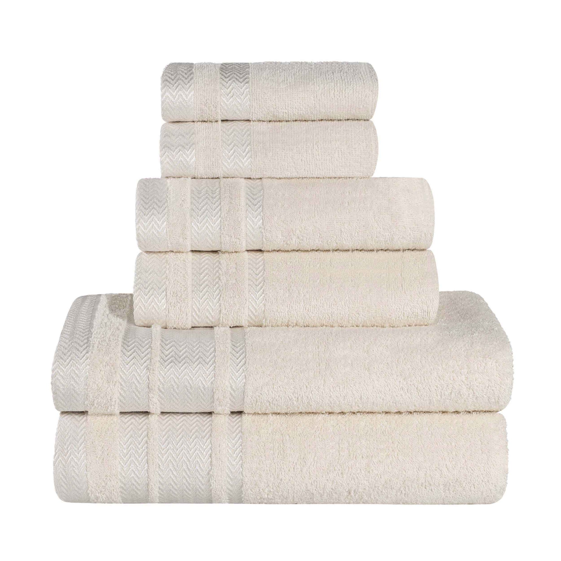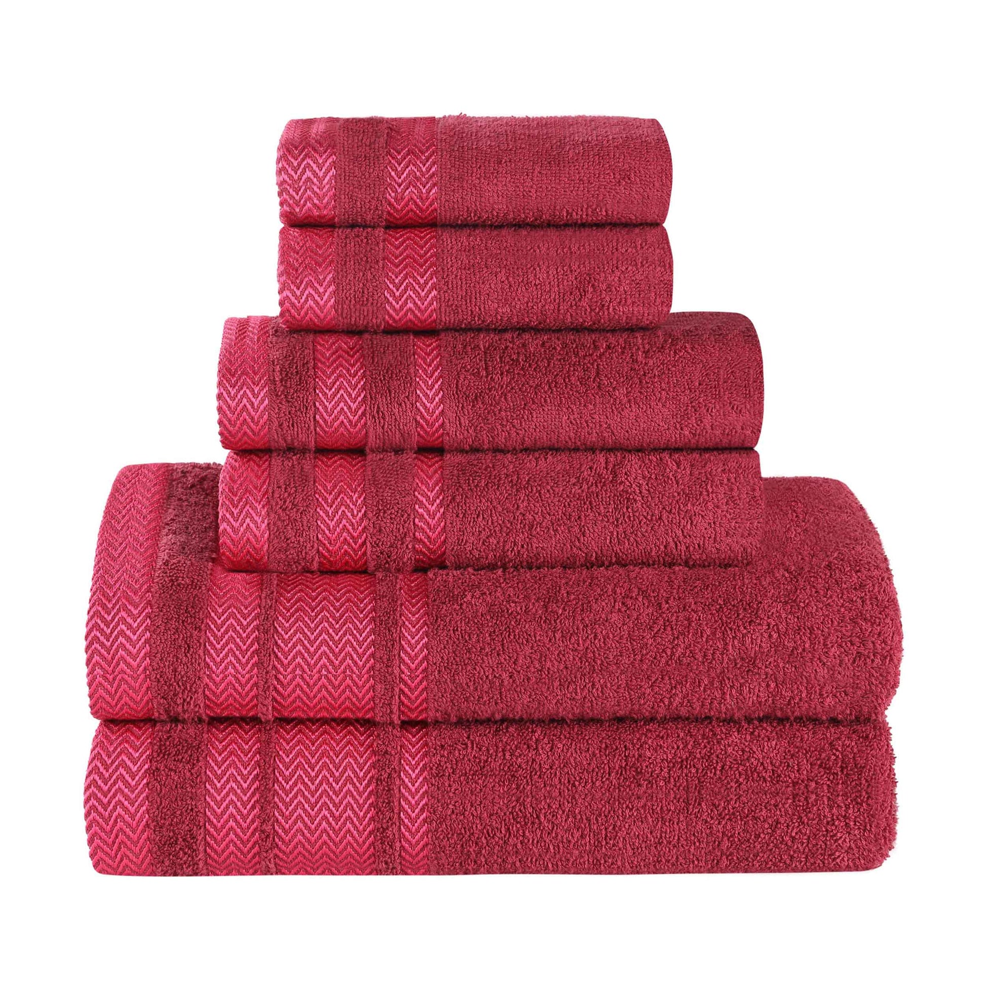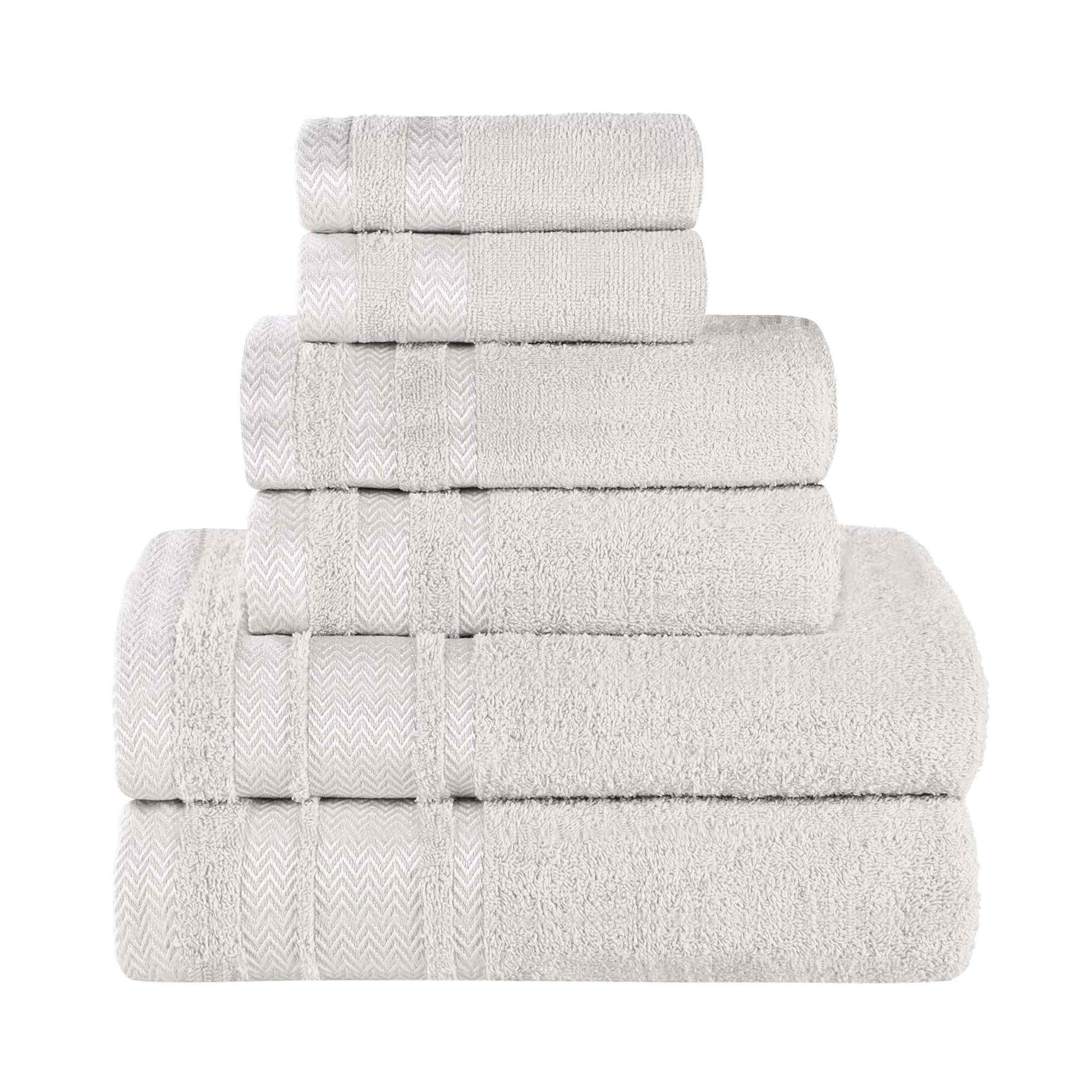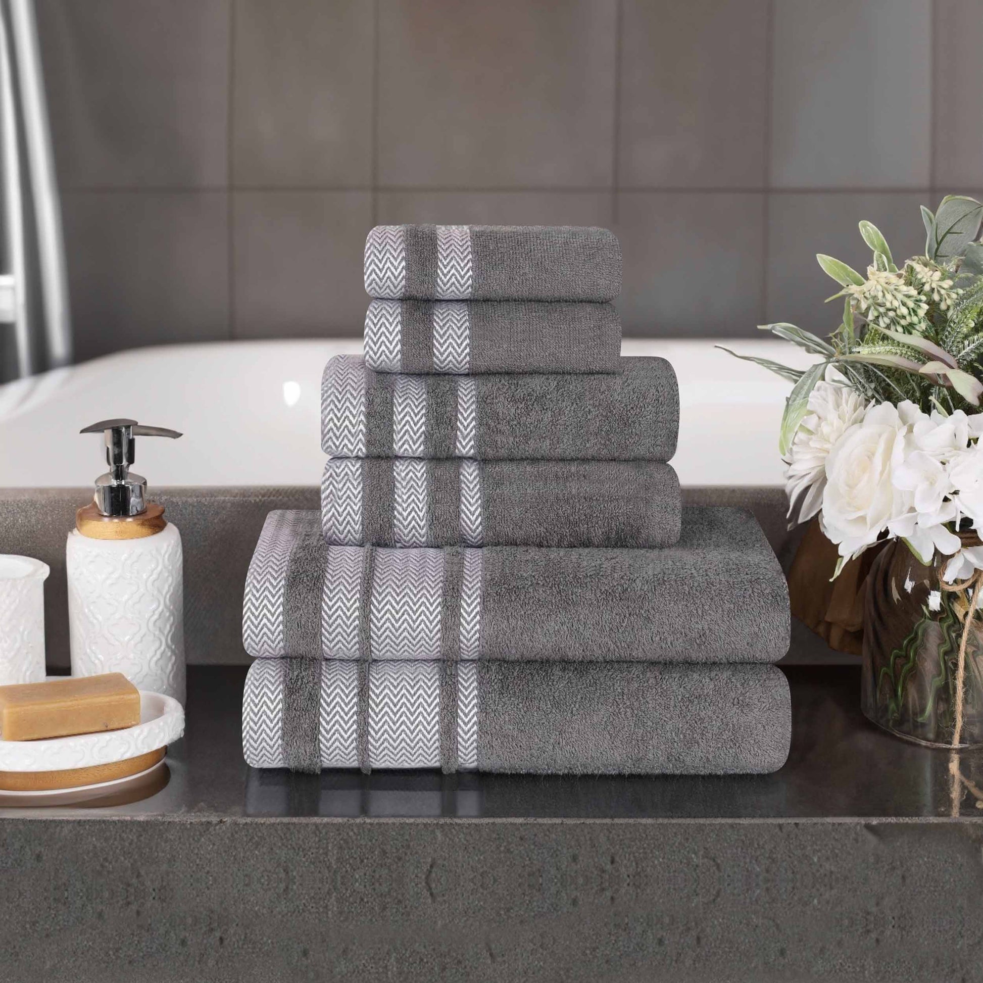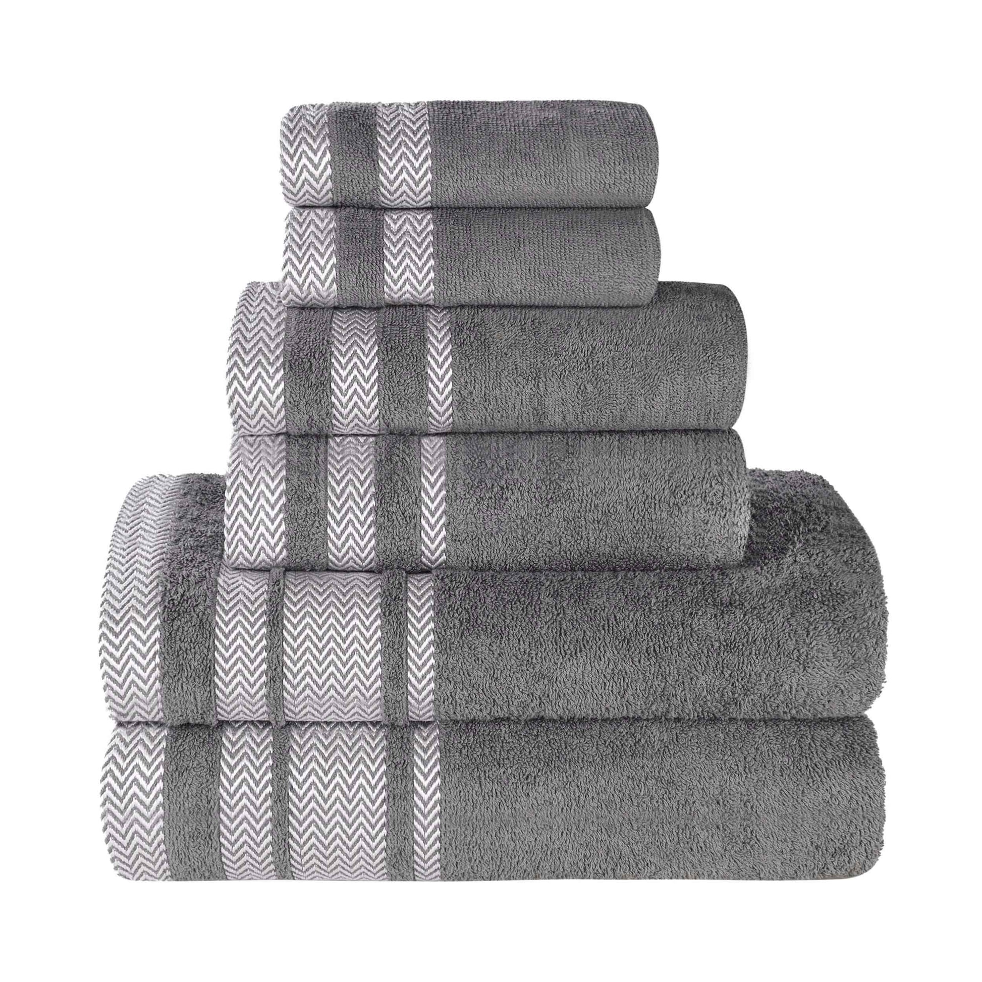 Add a stylish touch to your bathroom decor with our Hays 6 Piece Towel Set. Each piece in this versatile set boasts a whimsical, shiny dobby border and hemmed edges for unparalleled style and durability. These 100% cotton towels are crafted with a terry loop weave for a softer, more absorbent, and luxurious towel. Available in an assortment of classic colors, these towels also feature a convenient hanging loop to lend a tailored finish to your bathroom decor.