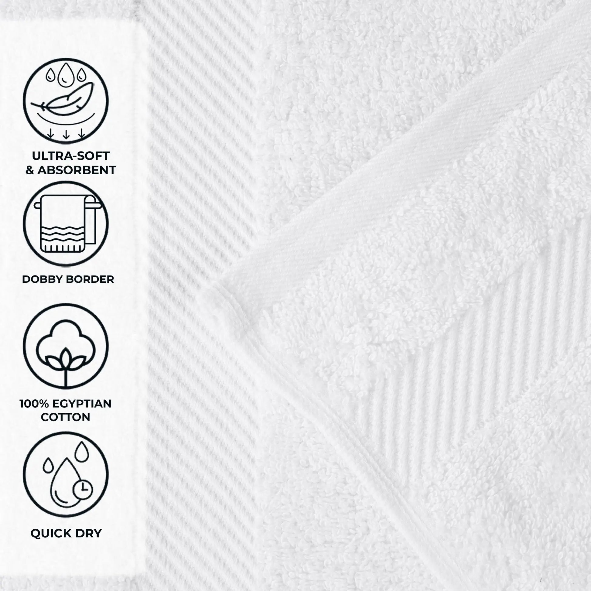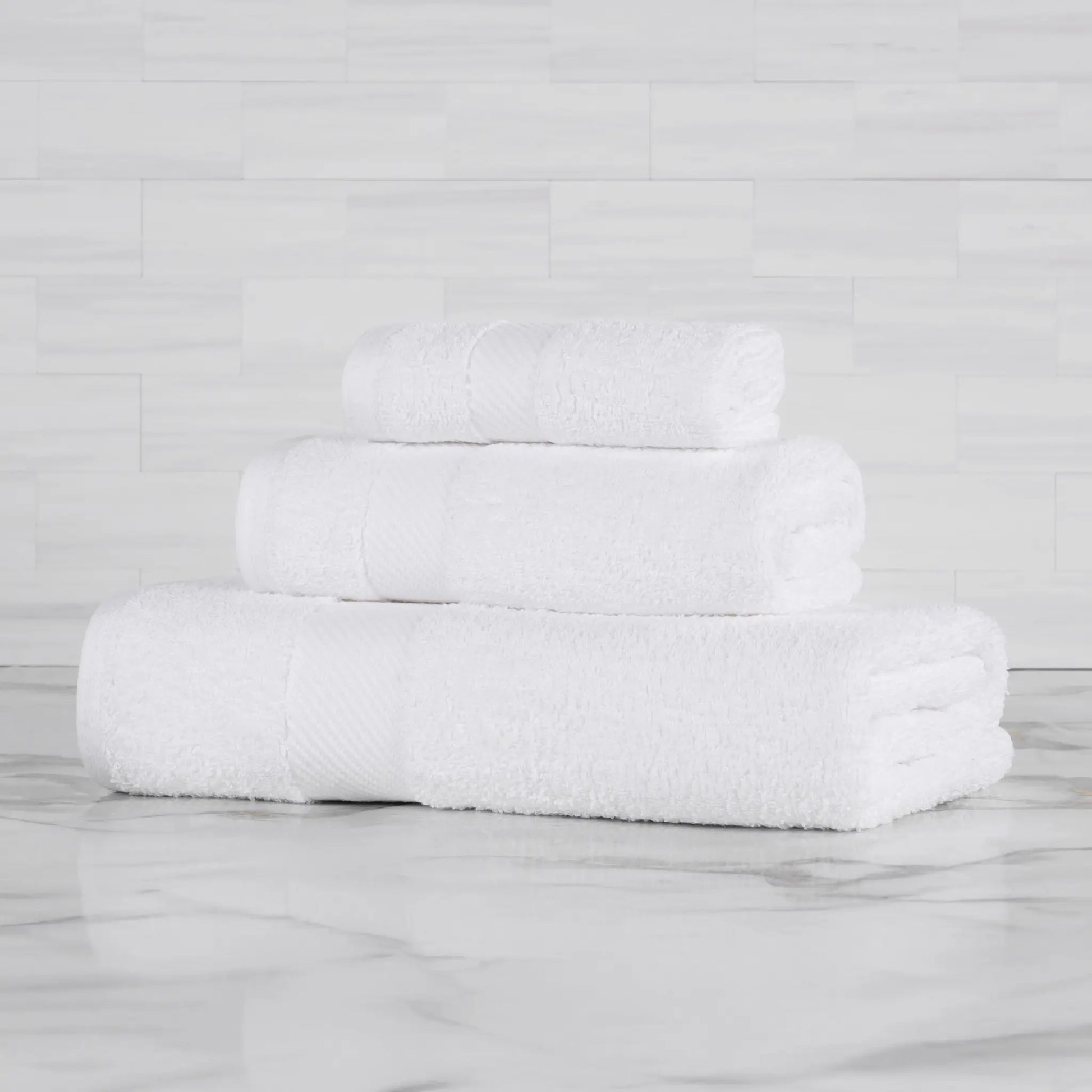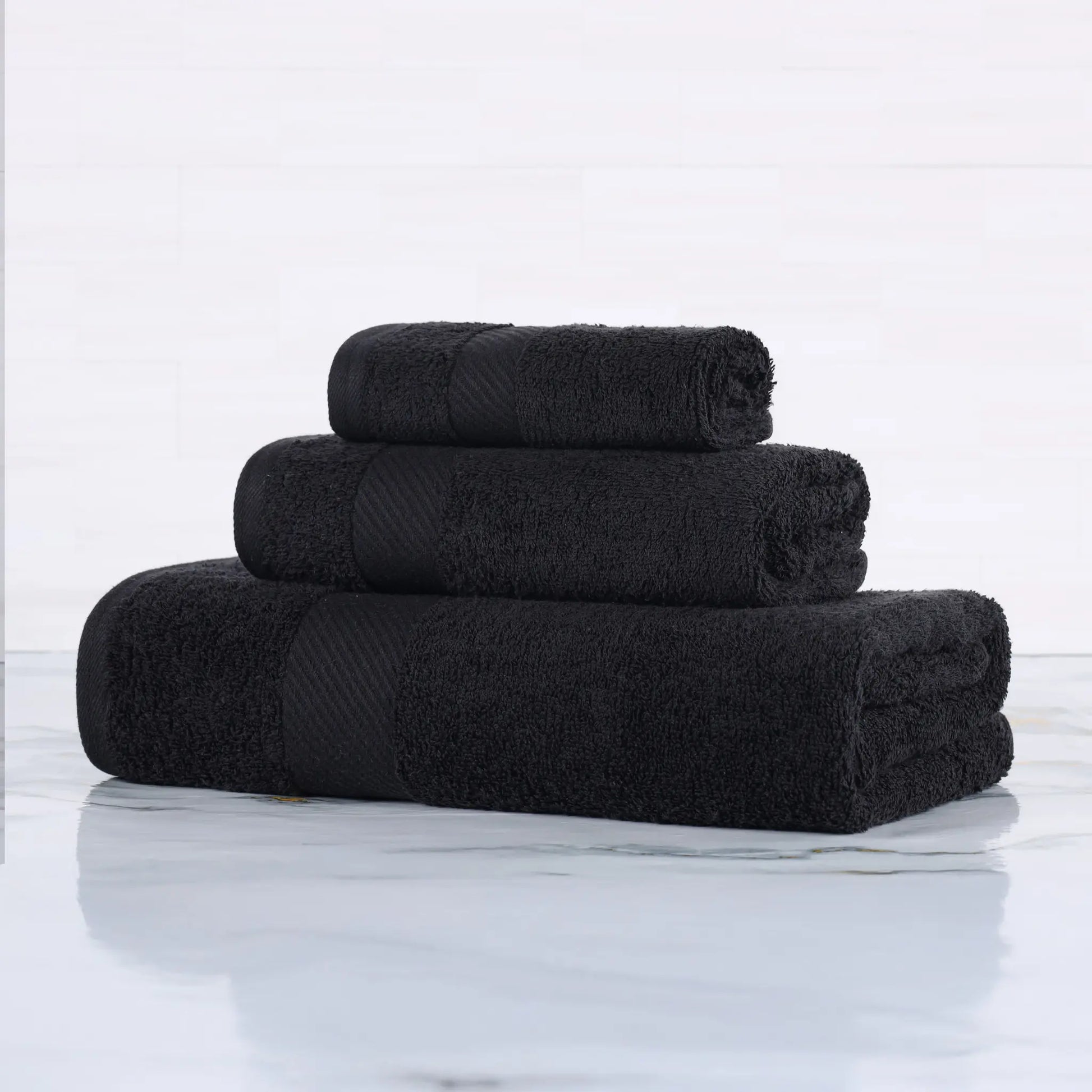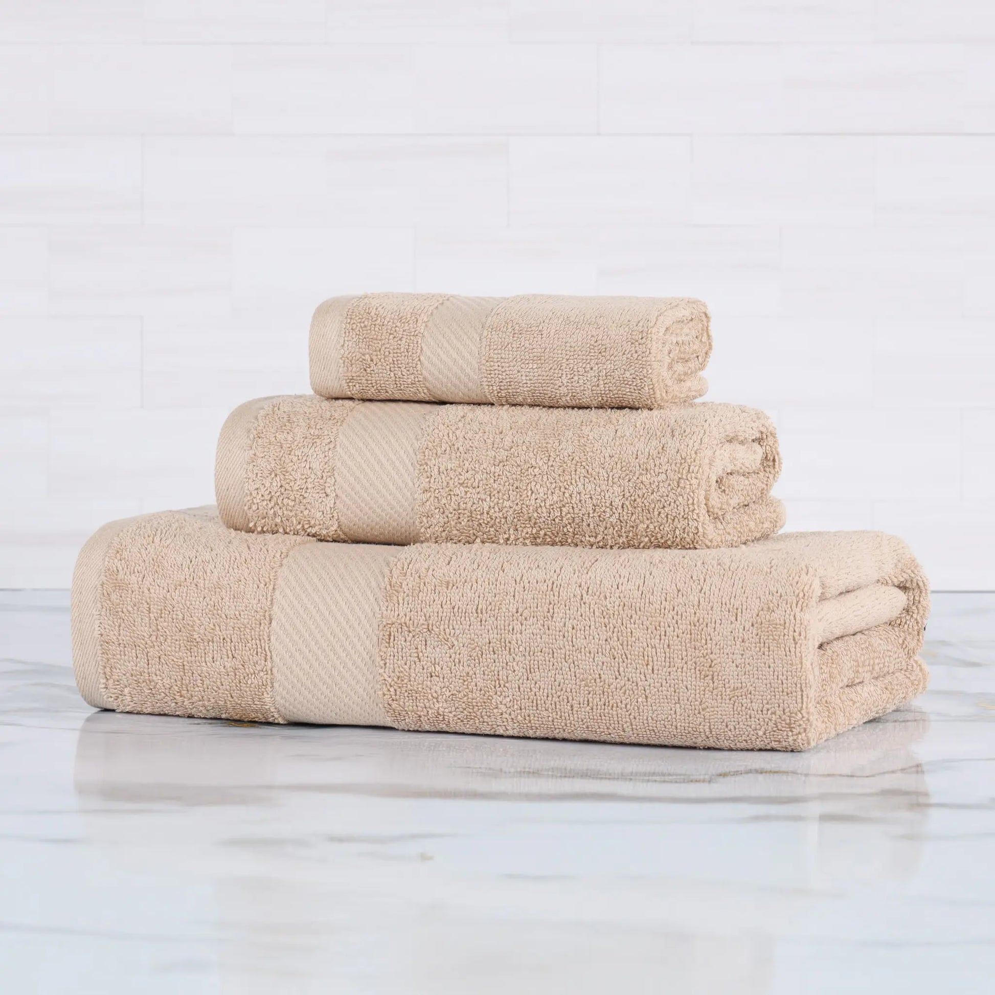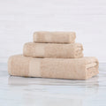 This bath and hand towel set includes one soft face towel, one medium-weight hand towel, and one plush cotton bath towel, each crafted from premium Egyptian cotton for balance between softness and absorbency.