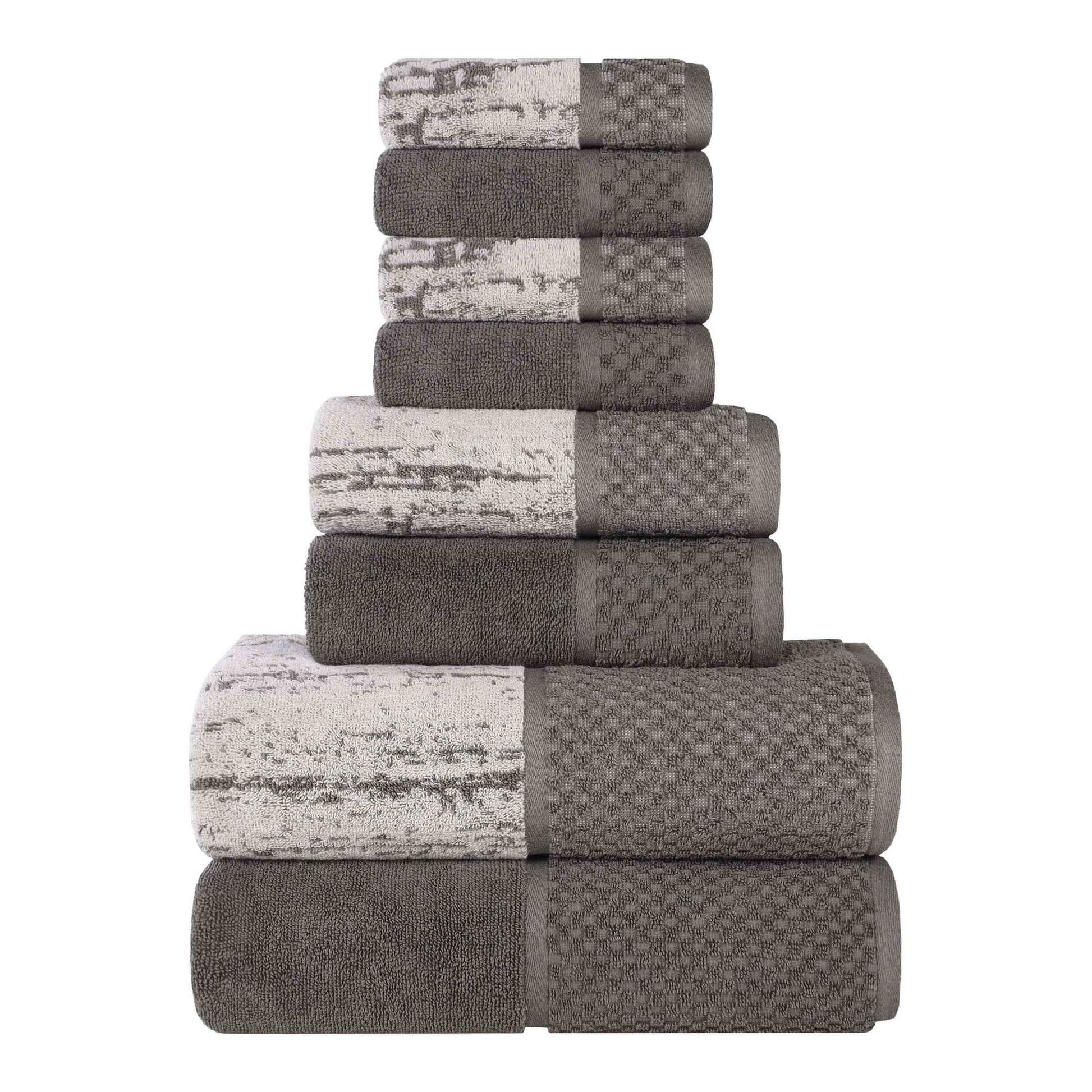 Leave a lasting impression on your guests with the impressive style of our Lodie Cotton Jacquard Two-Toned 8 Piece Towel Set. These cotton towels are crafted for a soft, absorbent, and luxurious experience. Featuring an assortment of jacquard solid and fashionable two-toned designs, bring unique style to your guest or master bathroom with this bundle. Each towel is finished with secure hemmed edges to avoid fraying and a durable single-ply to withstand countless washes. Finished with a hanging loop on each piece, enjoy both convenience and comfort with this versatile set.