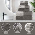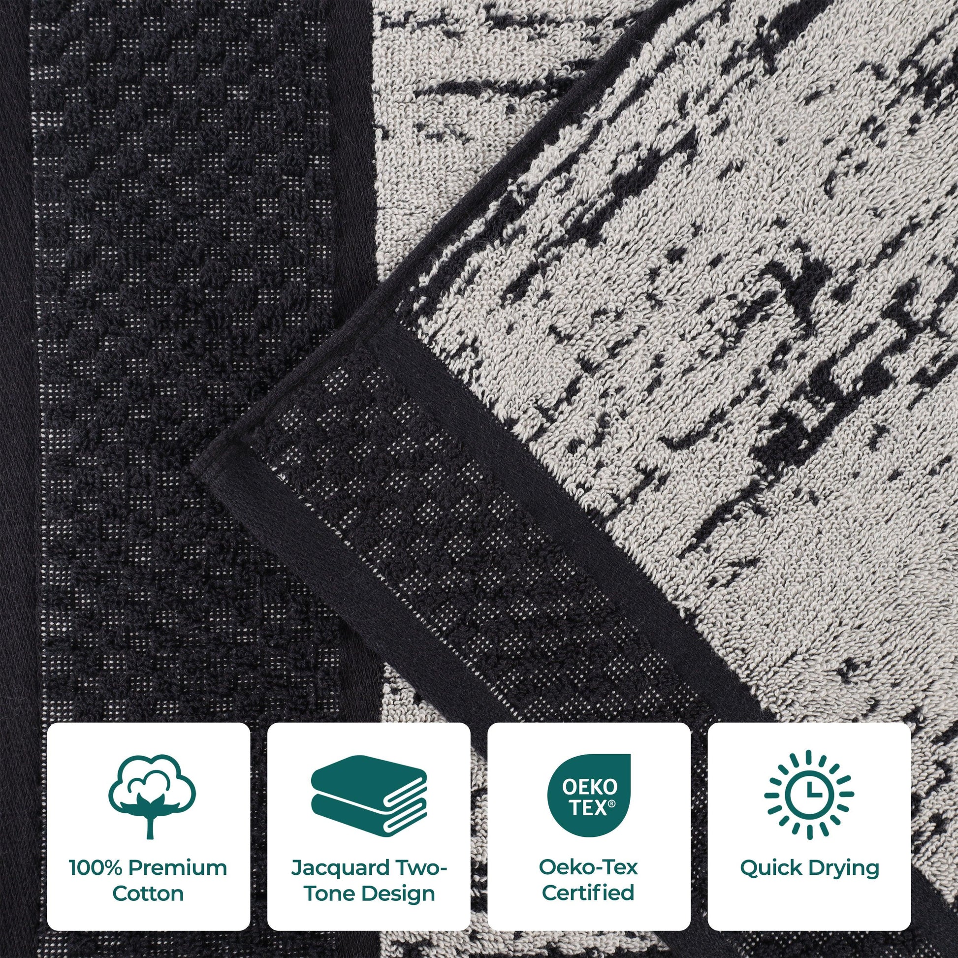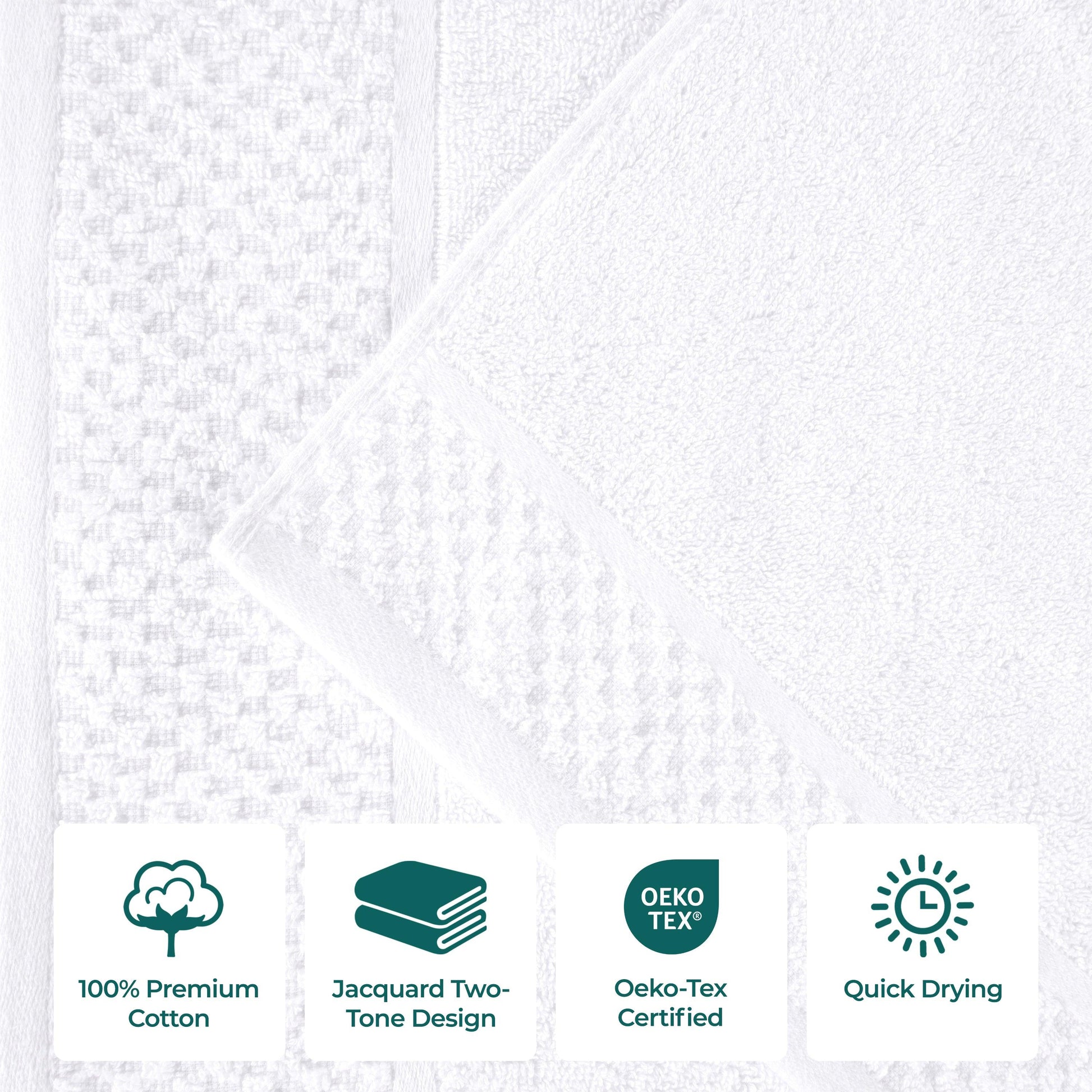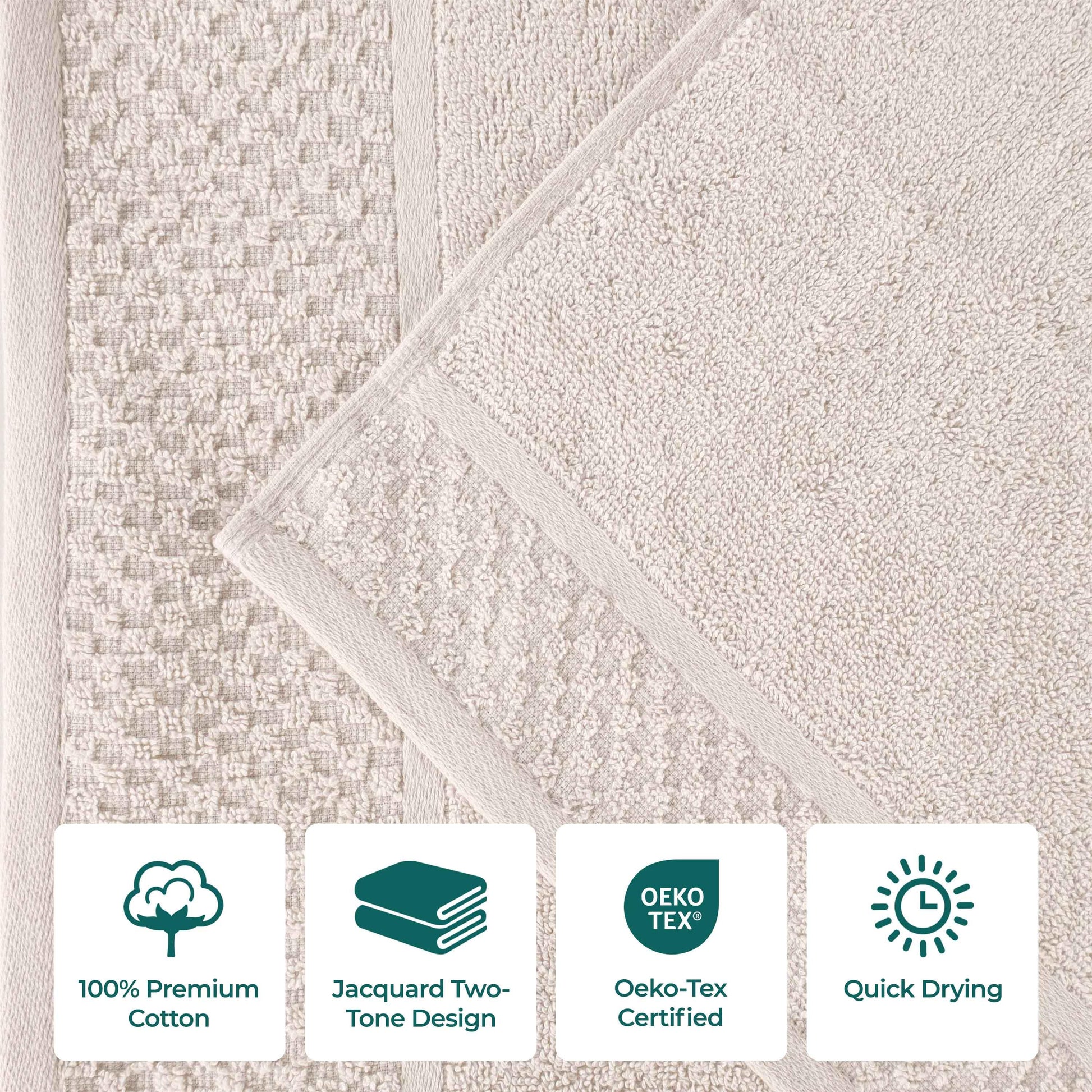 Instantly revitalize your bathroom with the fresh elegance of the Lodie Cotton Jacquard Two-Toned 9 Piece Towel Set. These cotton towels are crafted for a soft, absorbent, and luxurious experience. Featuring an assortment of jacquard solid and fashionable two-toned designs, bring unique style to your guest or master bathroom with this bundle. Each towel is finished with secure hemmed edges to avoid fraying and a durable single-ply to withstand countless washes. Finished with a hanging loop on each piece, enjoy both convenience and comfort with this versatile set.