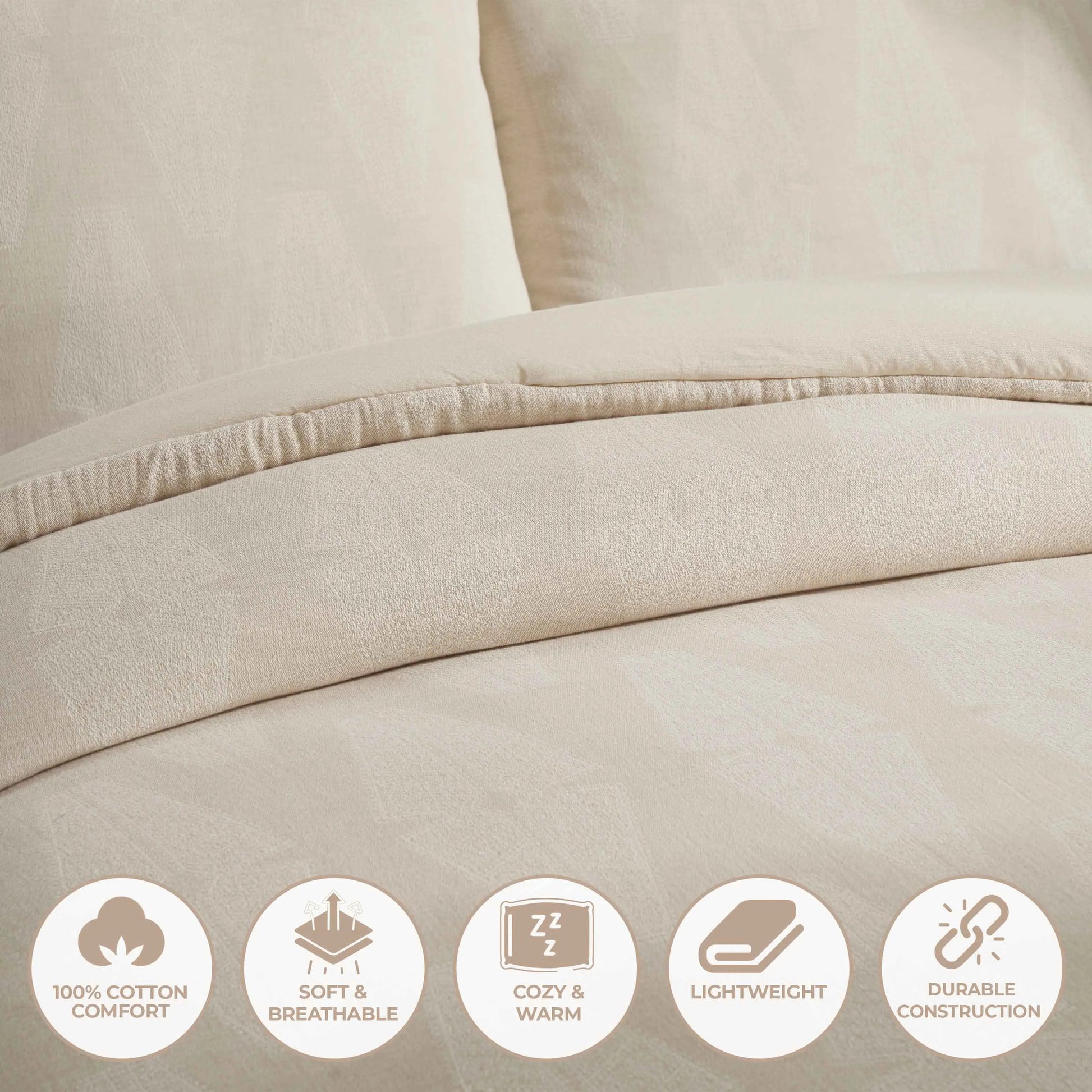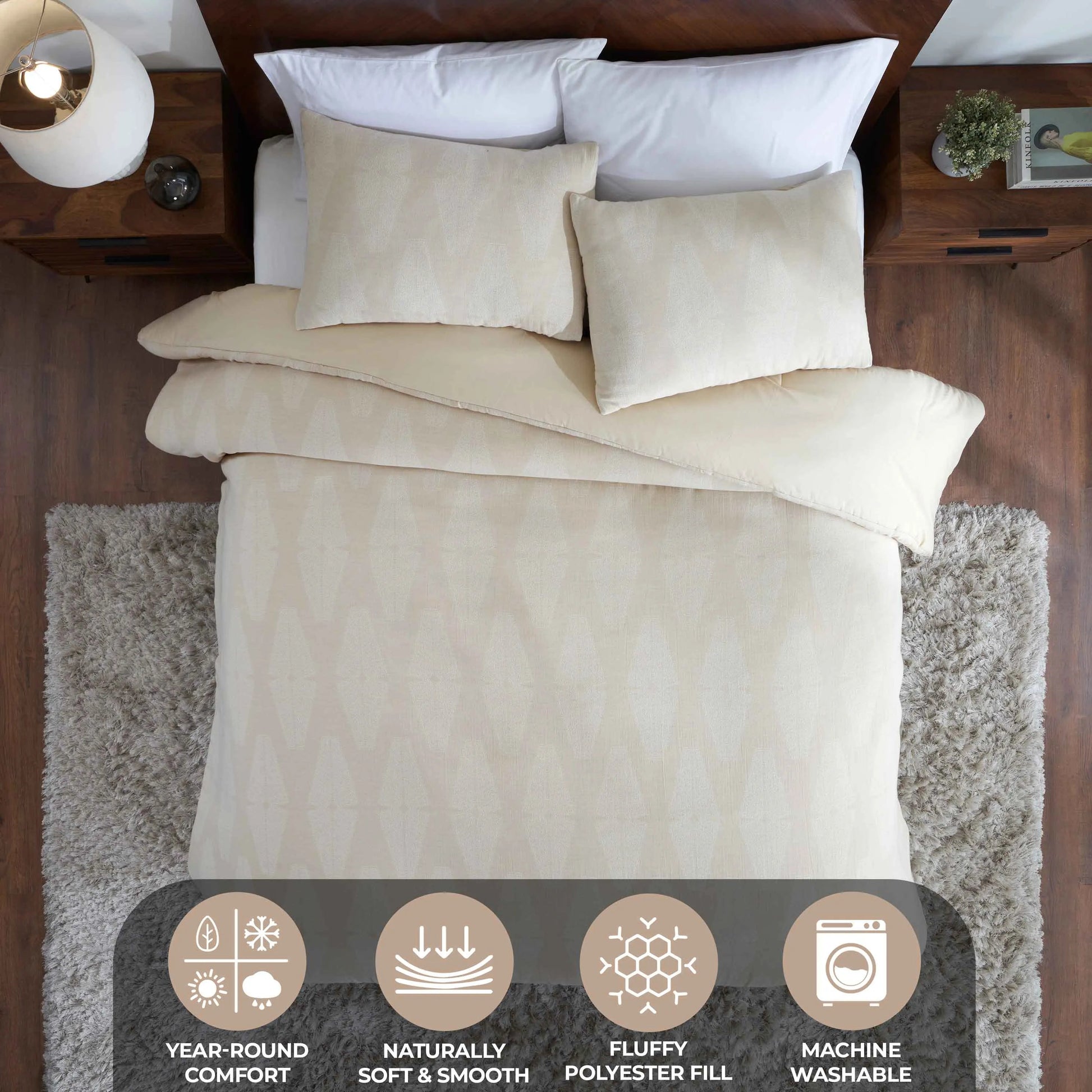 Discover the perfect blend of modern style and comfort with our Manali Woven Cotton Comforter Set. Made with naturally soft and smooth cotton and a fluffy filling, this comforter set is durable and provides year-round warmth. Displaying a beautiful geometric diamond lattice design, this woven comforter adds dimension to your bed. Matching pillow shams are included for a polished and coordinating look. Available in soothing sage, grey, and beige color options, this bedding set easily matches with modern or traditional bedroom decor styles. Designed to be breathable and cozy for all seasons, elevate your bedroom decor with this luxurious comforter set.