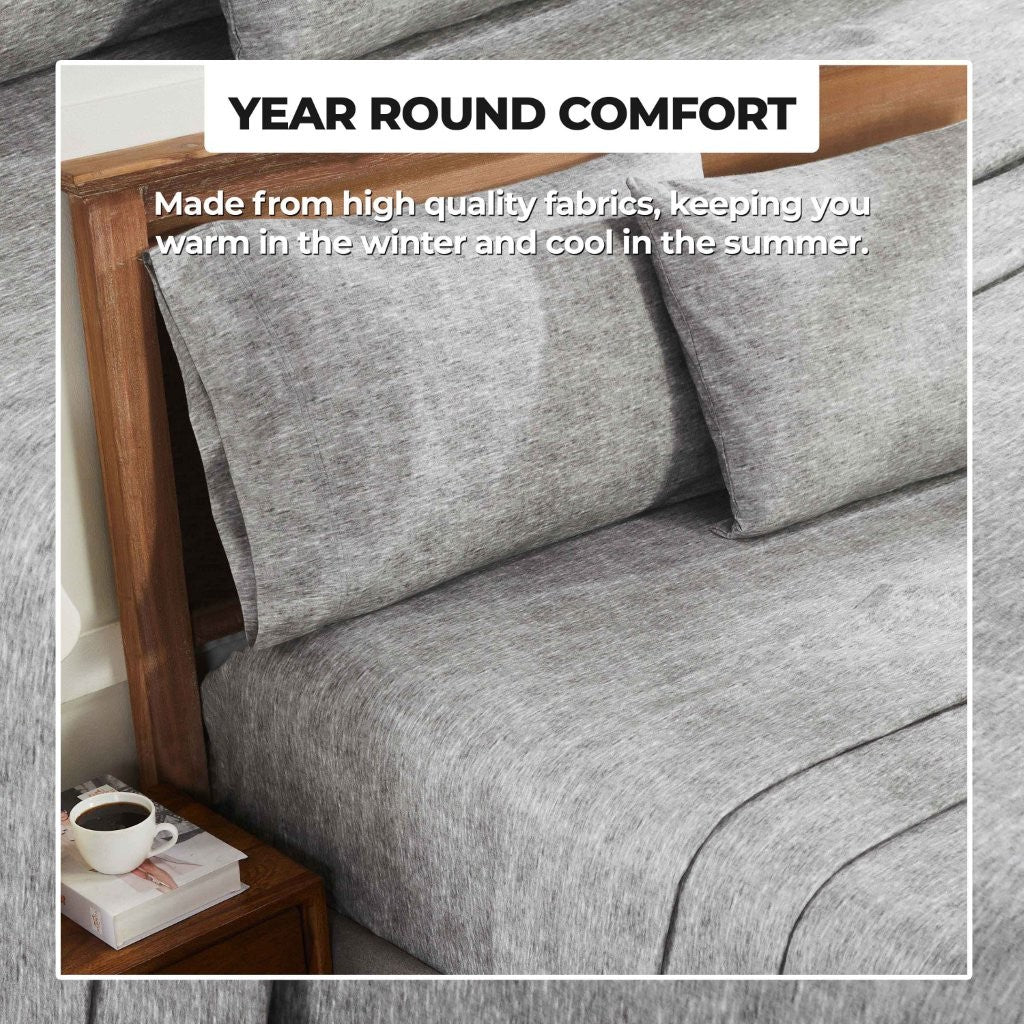 The rich two-tone melange fabric adds subtle visual texture, enhancing your bedroom decor. This set includes one flat sheet, one fitted sheet, and two pillowcases (one pillowcase for Twin and Twin XL sizes), all with oversized deep pockets to fit thick mattresses easily.