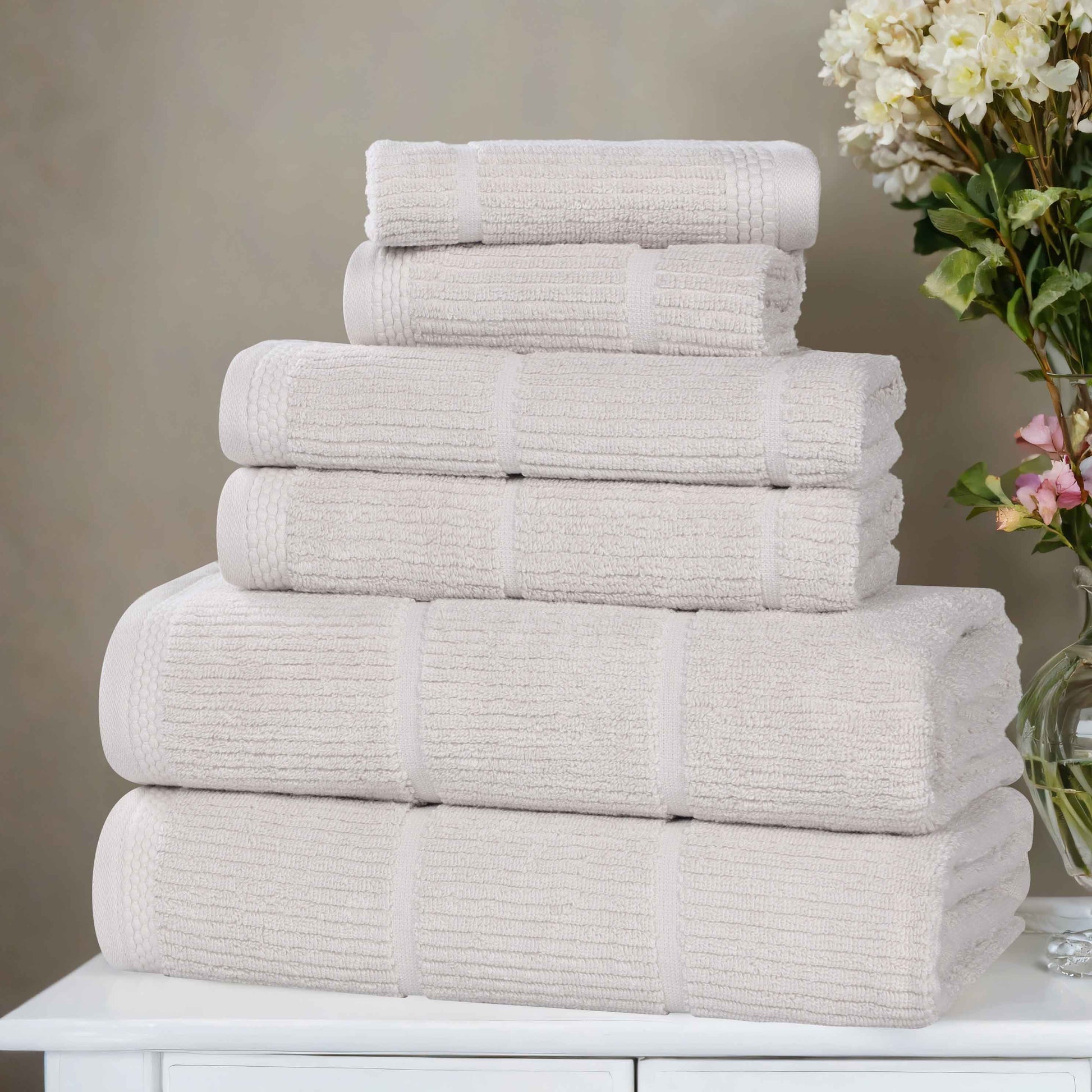 Transform your daily rituals into moments of pure indulgence. Our Milo Smart Twist Viscose Cotton Blend 6 Piece Towel Set, meticulously woven from the finest viscose cotton blend, redefines softness and absorbency. Its unique low-twist technique creates a haven of plush comfort, while the elegant ribbed design adds a touch of understated luxury to your bathroom sanctuary.