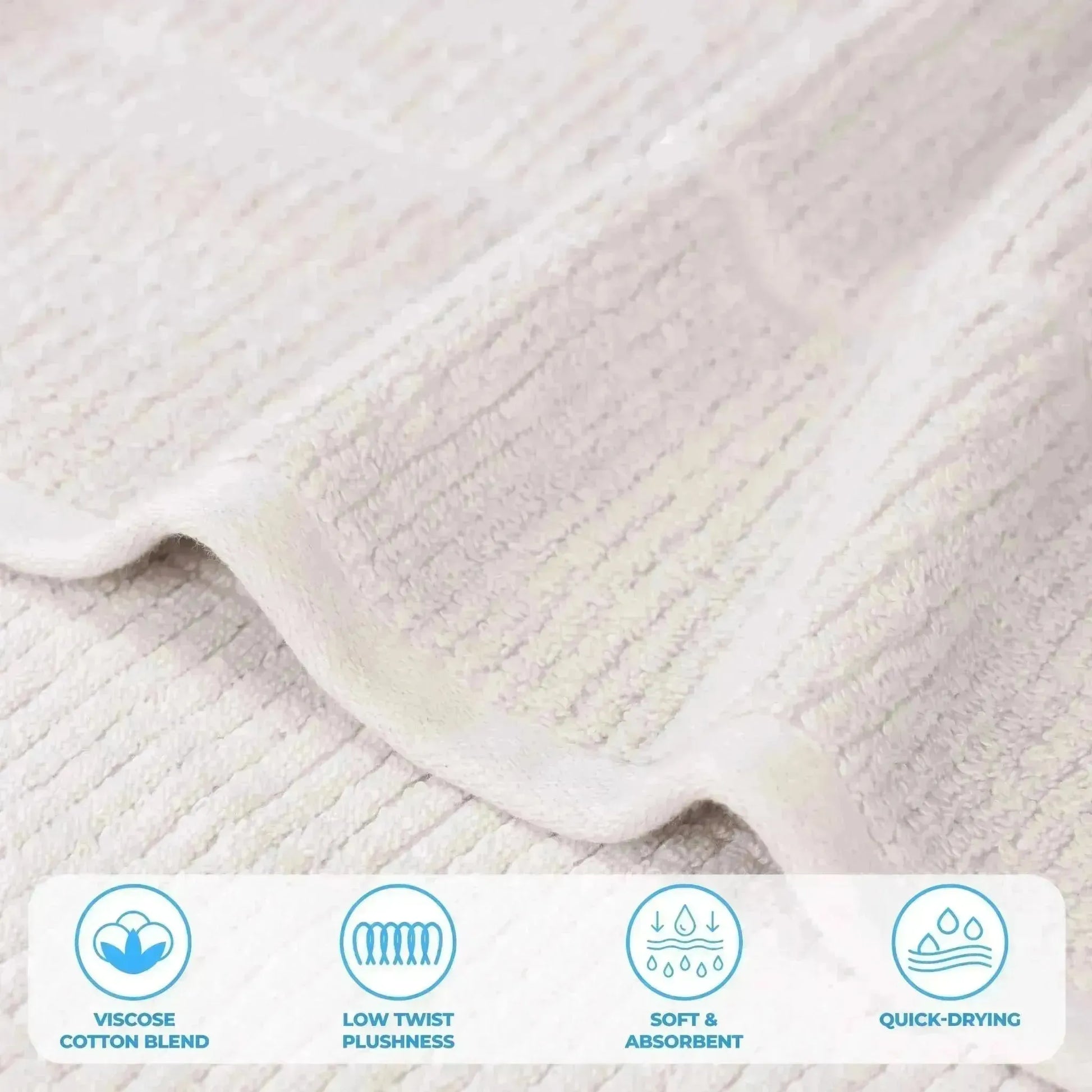 Experience the difference that meticulous craftsmanship makes. Our Milo Smart Twist Viscose Cotton Blend 9 Piece Towel Set, woven from a premium viscose cotton blend, delivers exceptional softness and absorbency, transforming your everyday routine into a spa-like experience. The elegant ribbed design and curated palette of colors allow you to personalize your space and create a haven of tranquility.