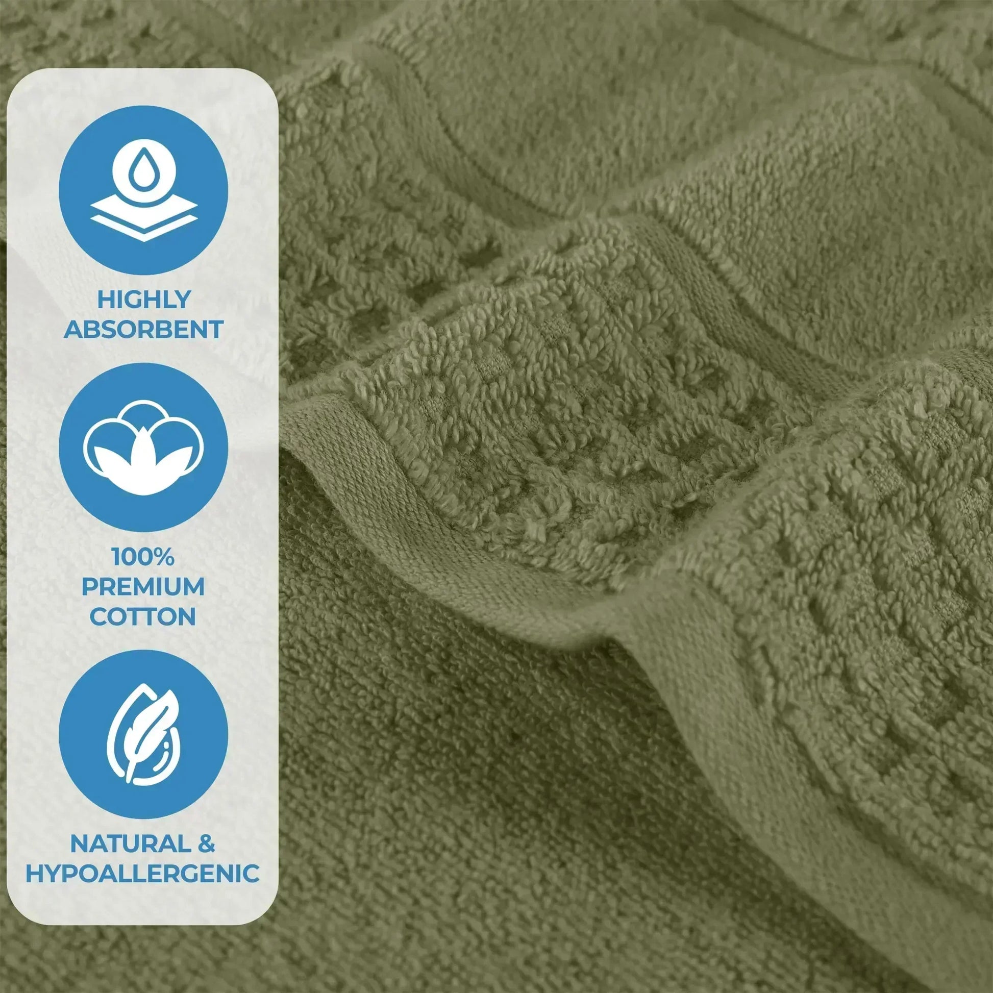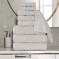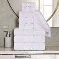 Uncover a realm of tranquility with the remarkable Napa 9 Piece Towel Set. These naturally soft cotton towels are crafted with a zero twist technique for a more absorbent and luxurious quality towel. Displaying a textured waffle honeycomb border, bring unique style to you guest or master bathroom with this set of bathroom essentials. Each towel is finished with secure hemmed edges to avoid fraying and a durable single-ply to withstand countless washes. Featuring a hanging loop on each piece, enjoy both convenience and comfort with this versatile set.