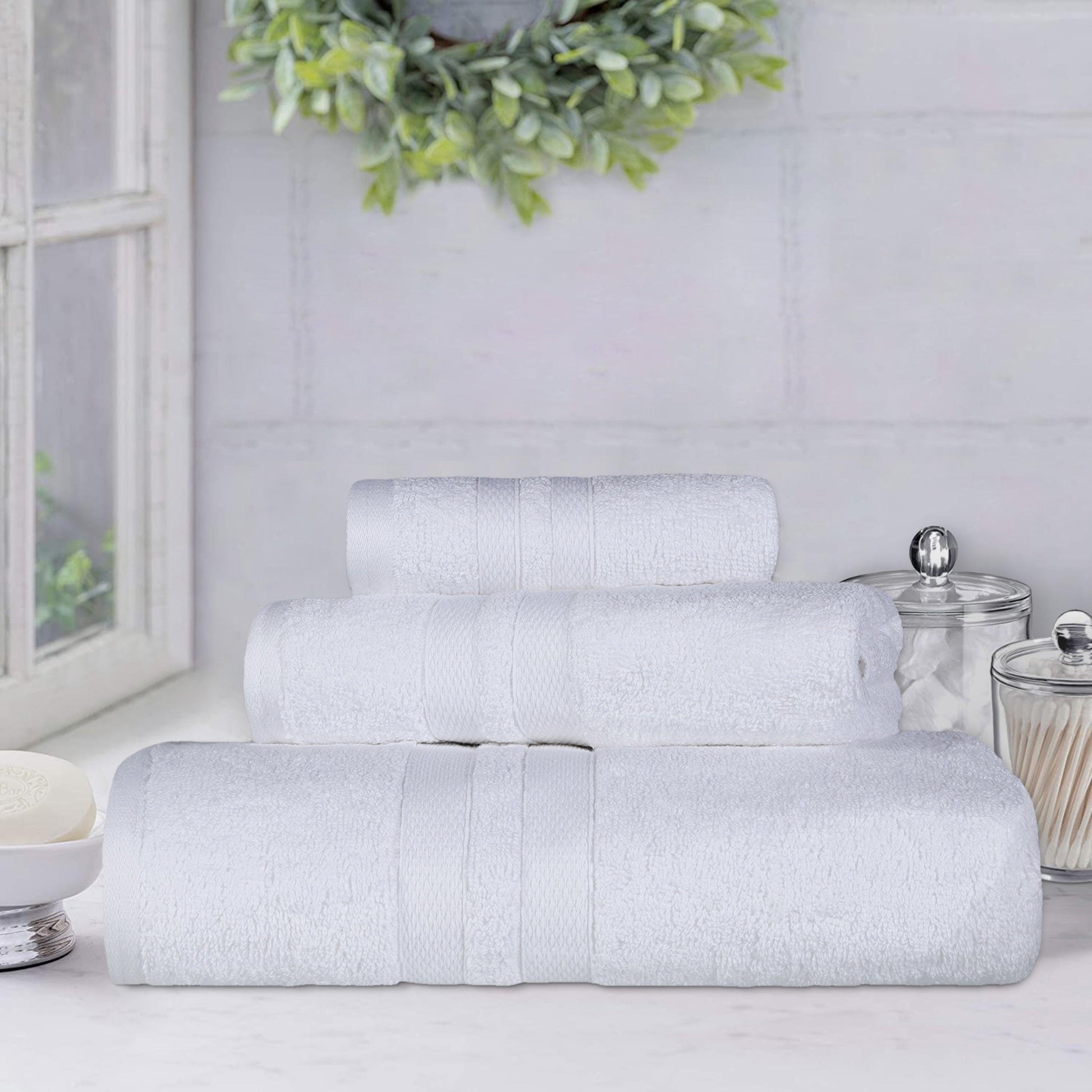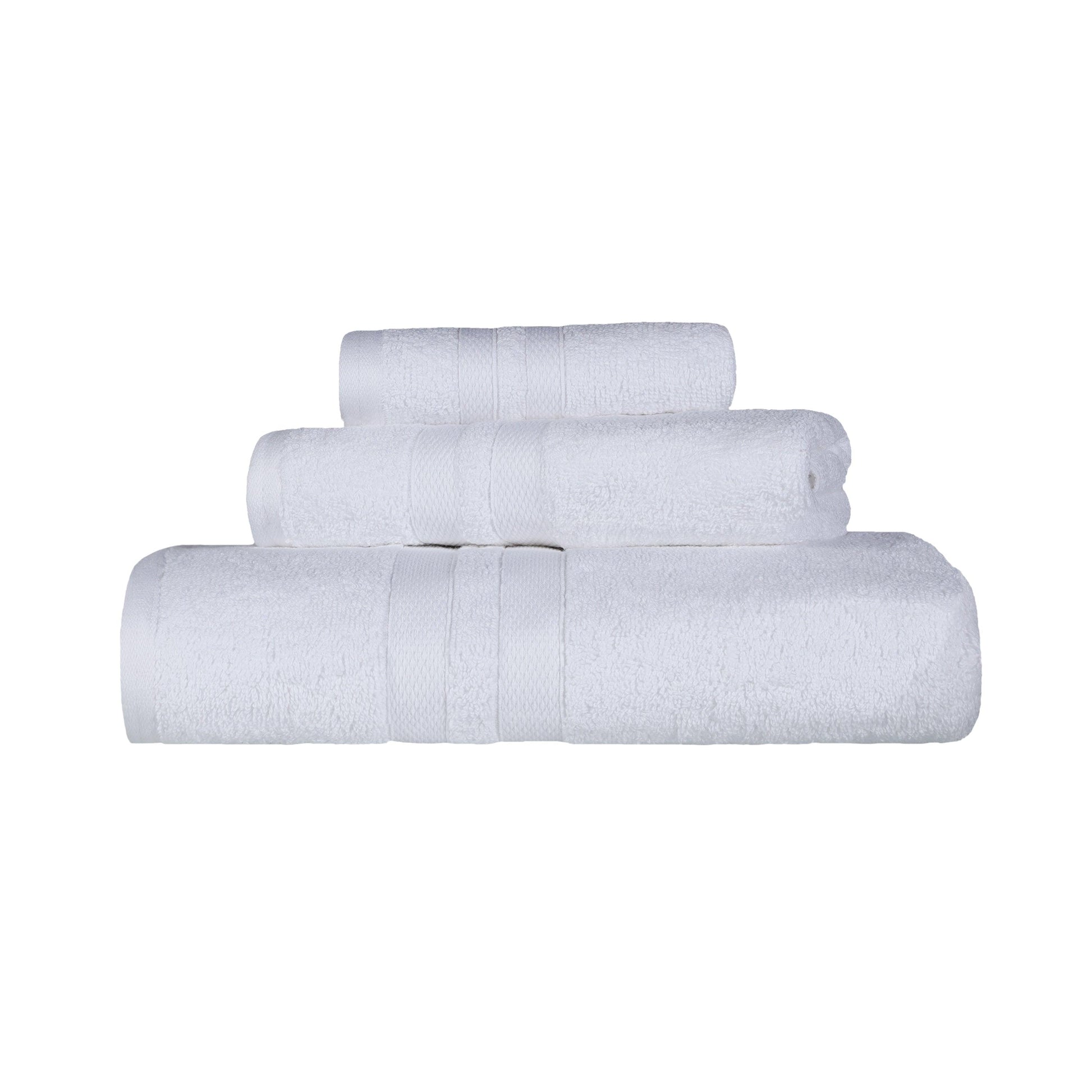 Bring the spa-vibe home with our amazingly soft and quick-drying Superior Ultra Soft Cotton Absorbent Solid Assorted 3-Piece Towel Set. Crafted from premium Cotton, each bath towel, hand towel, and washcloth feels incredibly gentle on your skin as soon as you step out of the shower or bath. In addition, the medium grams per square meter towel weight gives each towel its smooth and luxurious feel while absorbing water fast to help get you dry quickly. Adorning each towel is a delicate dobby border to bring a modern flourish to any master bath, powder room, or guest bath.