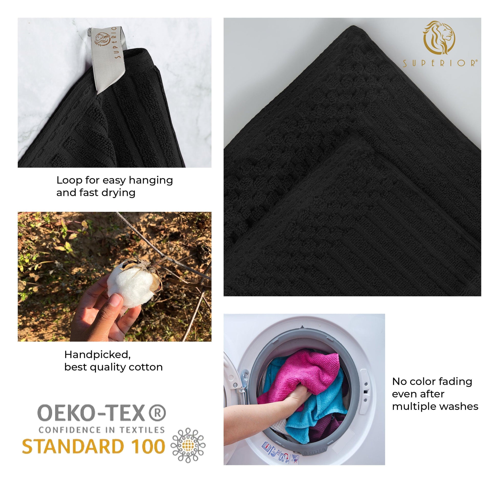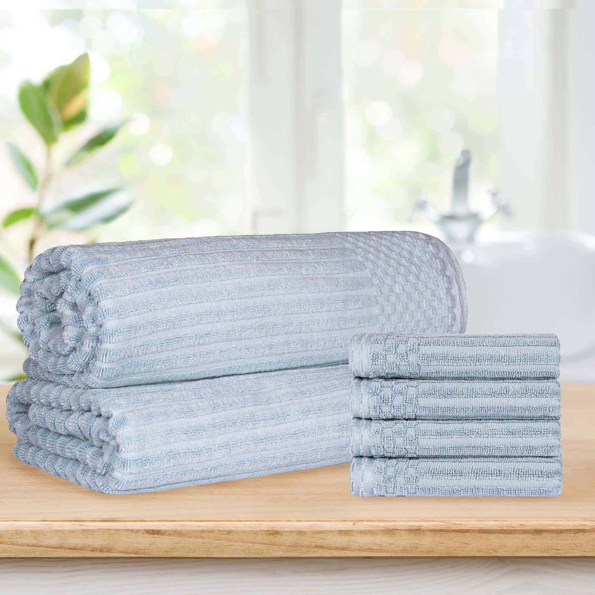 Decorating your bathroom space has never been easier with Superior Soho Ribbed Textured Cotton Ultra-Absorbent Hand and Bath Towel Set. The ribbed texture features a checkered pattern along the border of the towel that will effortlessly make a stylish statement and wow your guests. Each towel is made with a singly-ply construction to ensure that you will get dried quickly and comfortably after each use. The towel is crafted with premium quality Cotton which will withstand many washes. This incredibly soft towel set includes two bath towels and four hand towels in an assortment of solid colors to match any modern or transitional style.