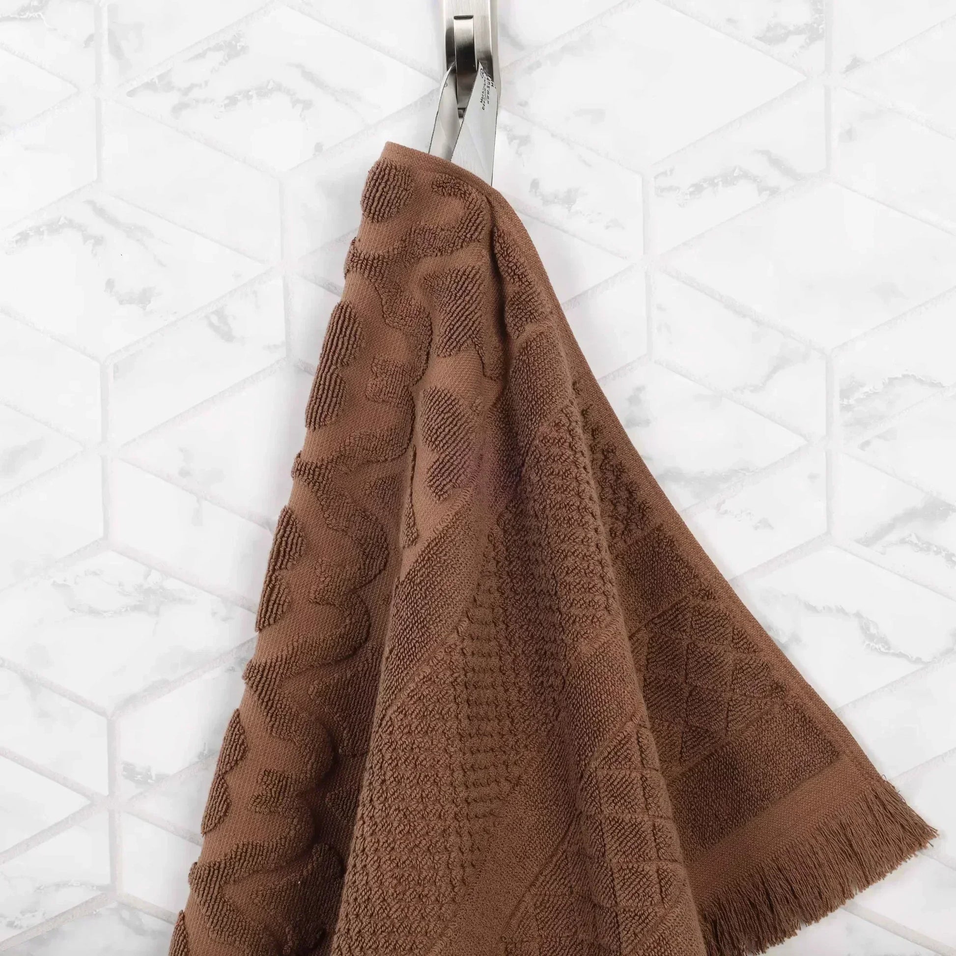 Fully stock your bathrooms with the timeless and indispensable Superior Rolla Cotton Geometric Jacquard Plush Soft Absorbent Face Towel Washcloth Set of 12. These Cotton towels are crafted for a soft, absorbent, and luxurious experience. Boasting a geometric pattern with frayed edges, bring unique style to your guest or master bathroom with this bundle. Each towel is finished with a durable single-ply to withstand countless washes and last you years to come. Featuring a hanging loop on each piece, enjoy both convenience and comfort with this versatile set.