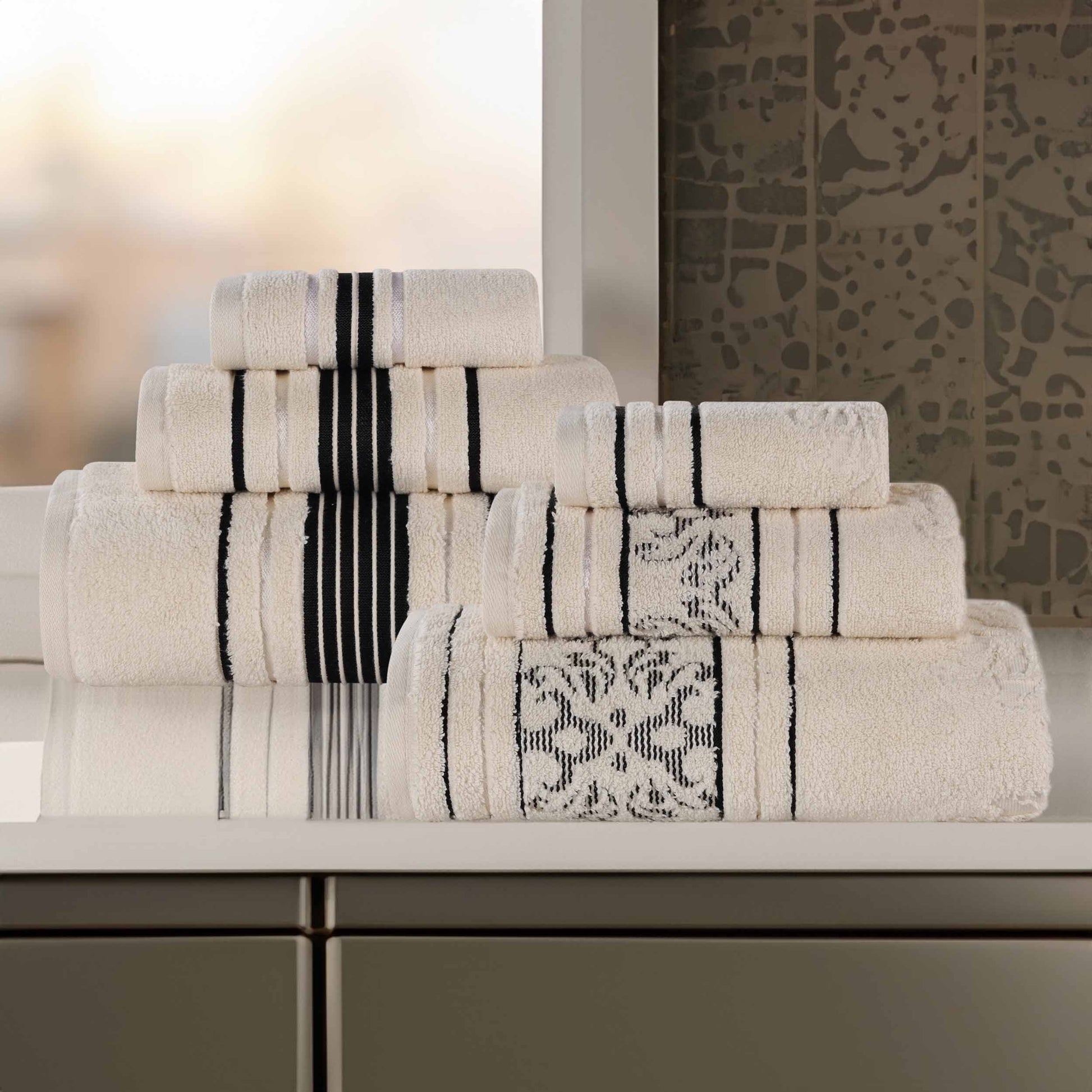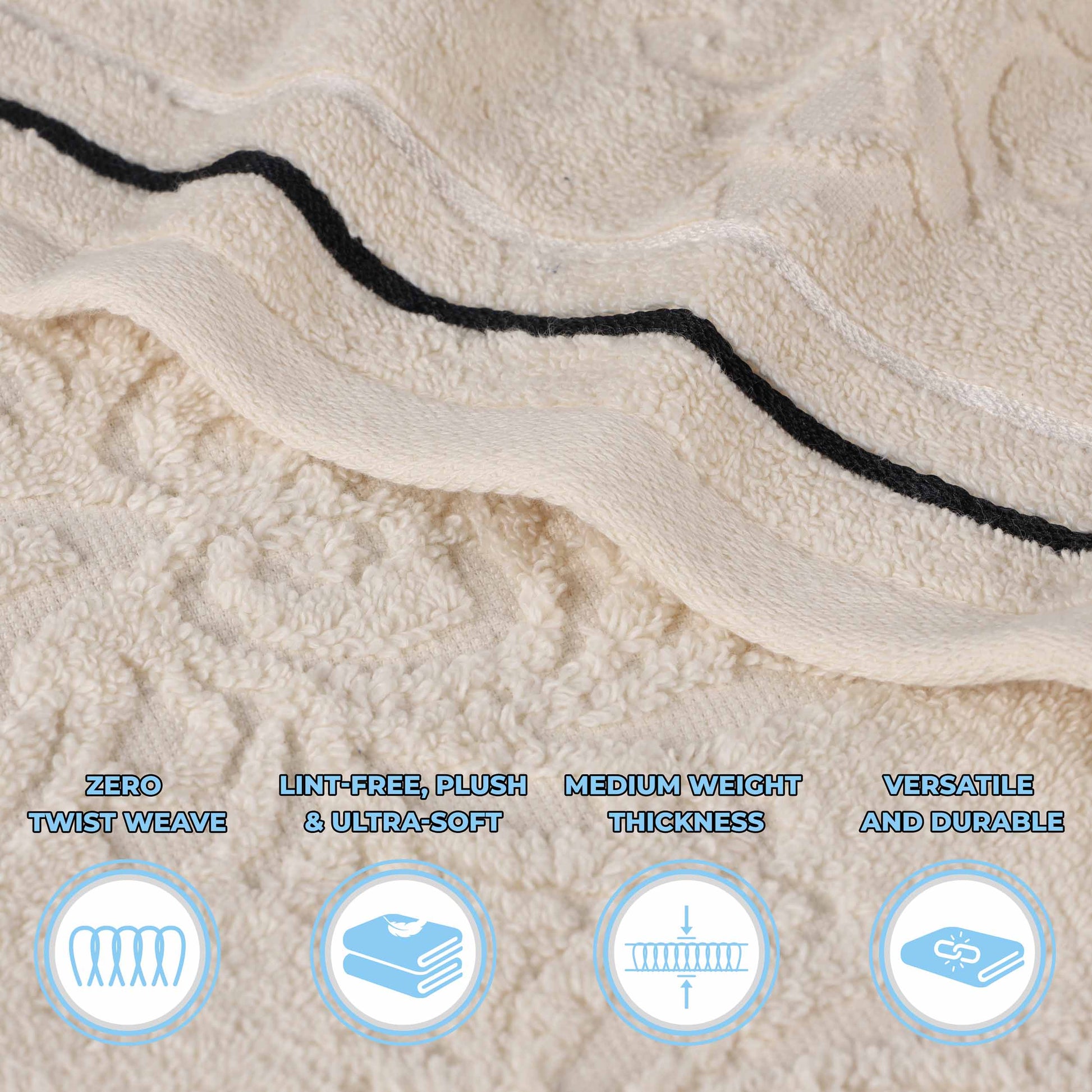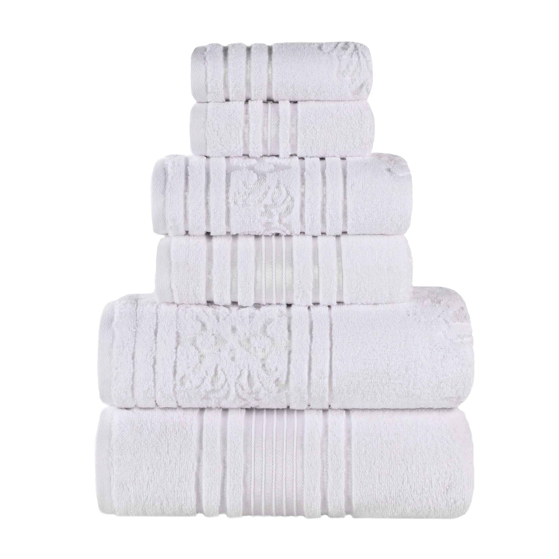 Elevate your bathroom space and bathing routine with our Sadie Zero Twist Cotton Floral Solid and Jacquard 6 Piece Towel Set. These 100% Cotton towels are crafted with a zero twist technique for a softer, more absorbent, and more luxurious towel those of regularly twisted towels. Featuring an assortment of solid and jacquard towels that boast an elegant floral motif, bring unique style to your guest or master bathroom with this bundle. Each towel is finished with secure hemmed edges to avoid fraying and a durable single-ply to withstand countless washes and last you years to come. Finished with a hanging loop on each piece, enjoy both convenience and comfort with this versatile set.
