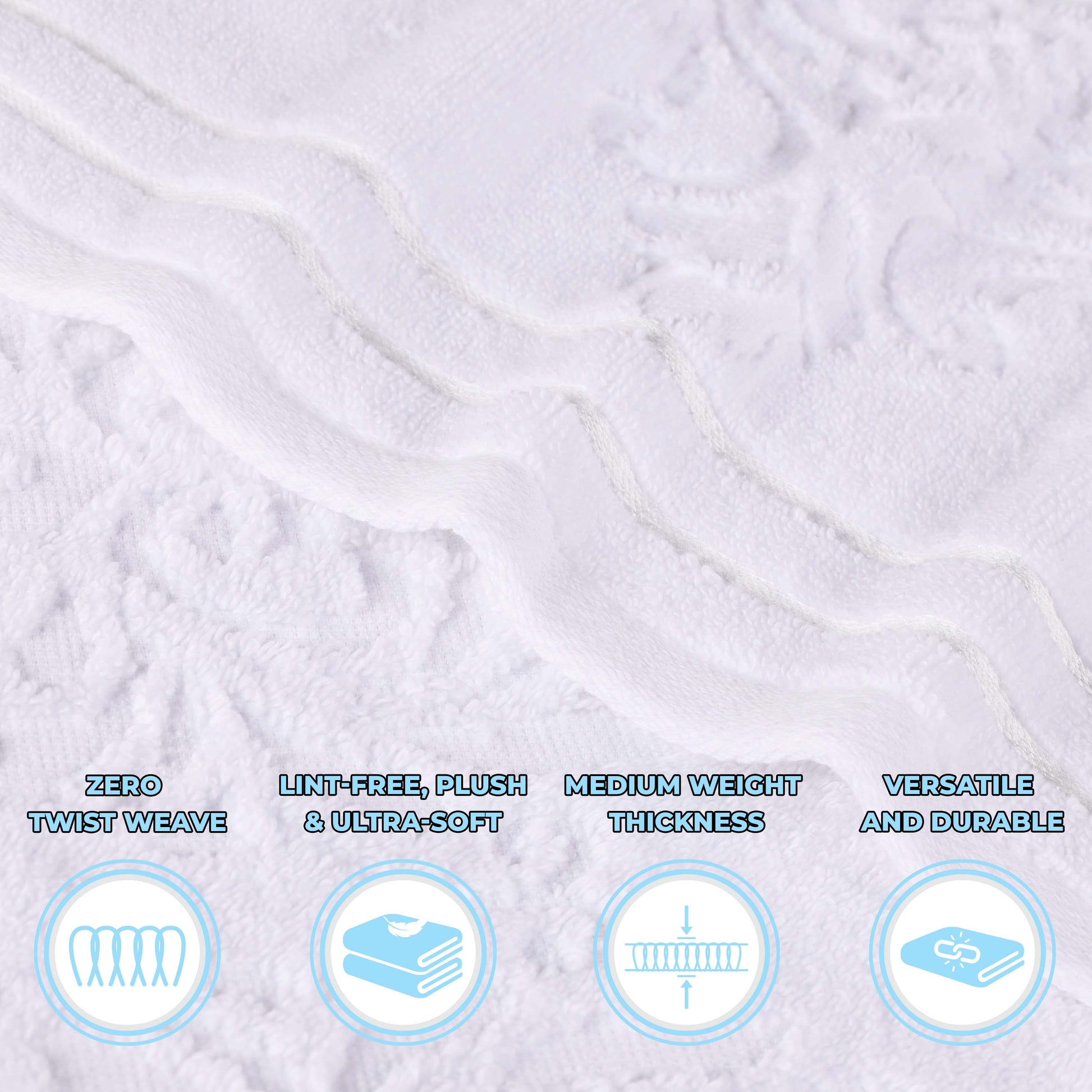 Indulge in exquisite relaxation and pamper yourself with our Sadie Zero Twist Cotton Floral Solid and Jacquard 8 Piece Towel Set. These 100% Cotton towels are crafted with a zero twist technique for a softer, more absorbent, and more luxurious towel those of regularly twisted towels. Featuring an assortment of solid and jacquard towels that boast an elegant floral motif, bring unique style to your guest or master bathroom with this bundle. Each towel is finished with secure hemmed edges to avoid fraying and a durable single-ply to withstand countless washes and last you years to come. Finished with a hanging loop on each piece, enjoy both convenience and comfort with this versatile set.