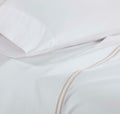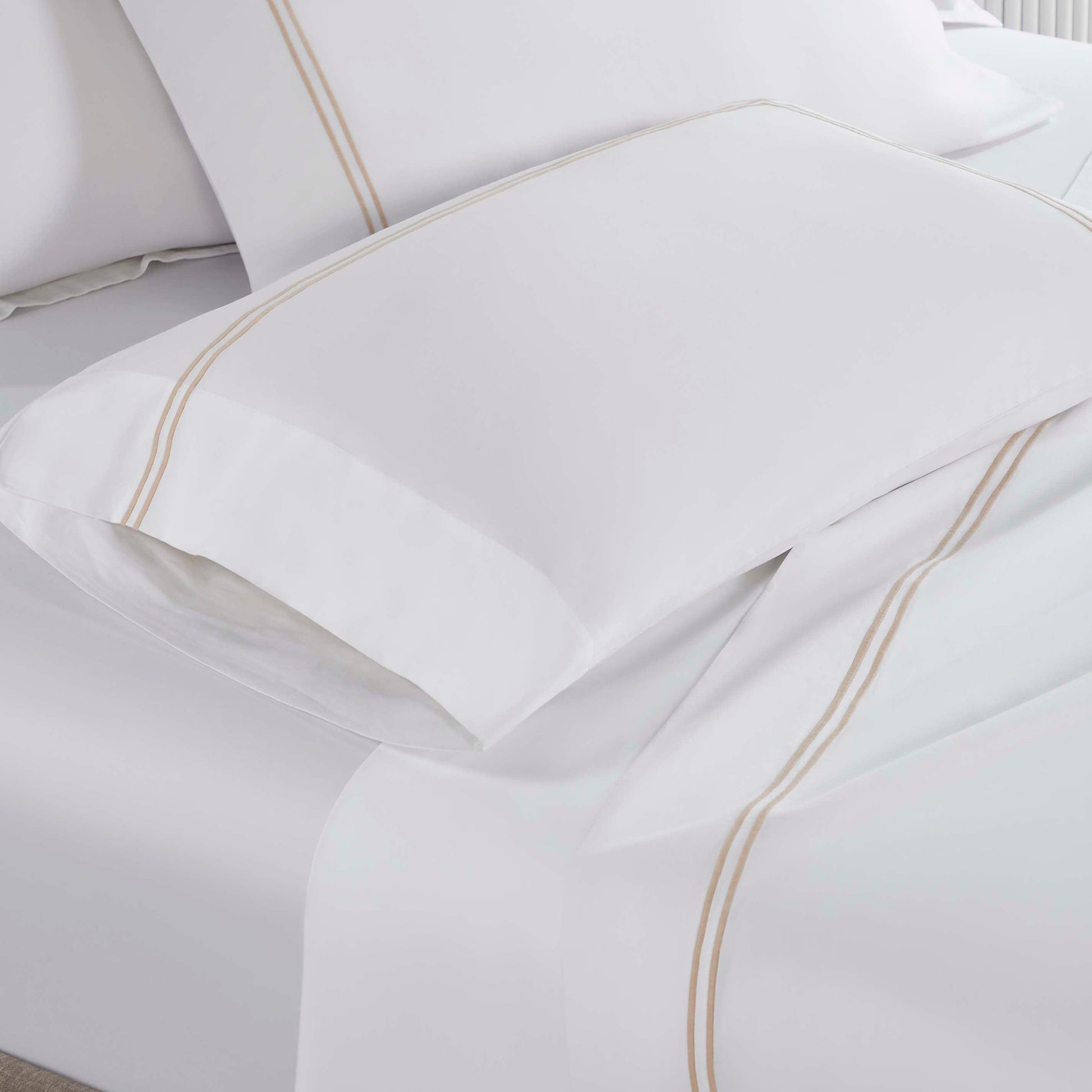 Made from soft, breathable cotton, this durable set offers long-lasting comfort and a crisp, cool feel that invites restful nights. The modern two-line embroidery detail adds subtle sophistication while the subtle shimmer of the fabric enriches its overall appeal.