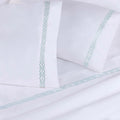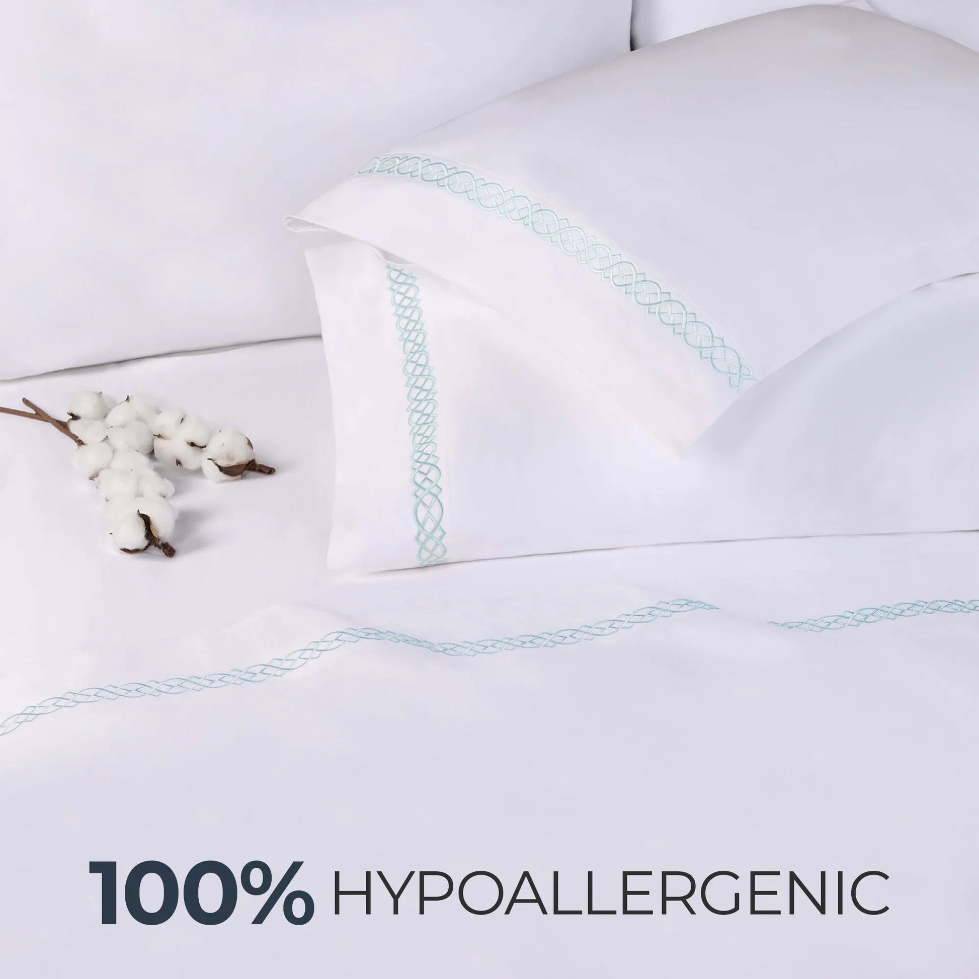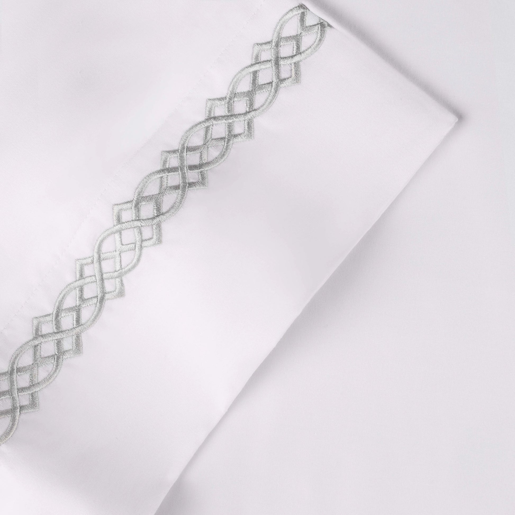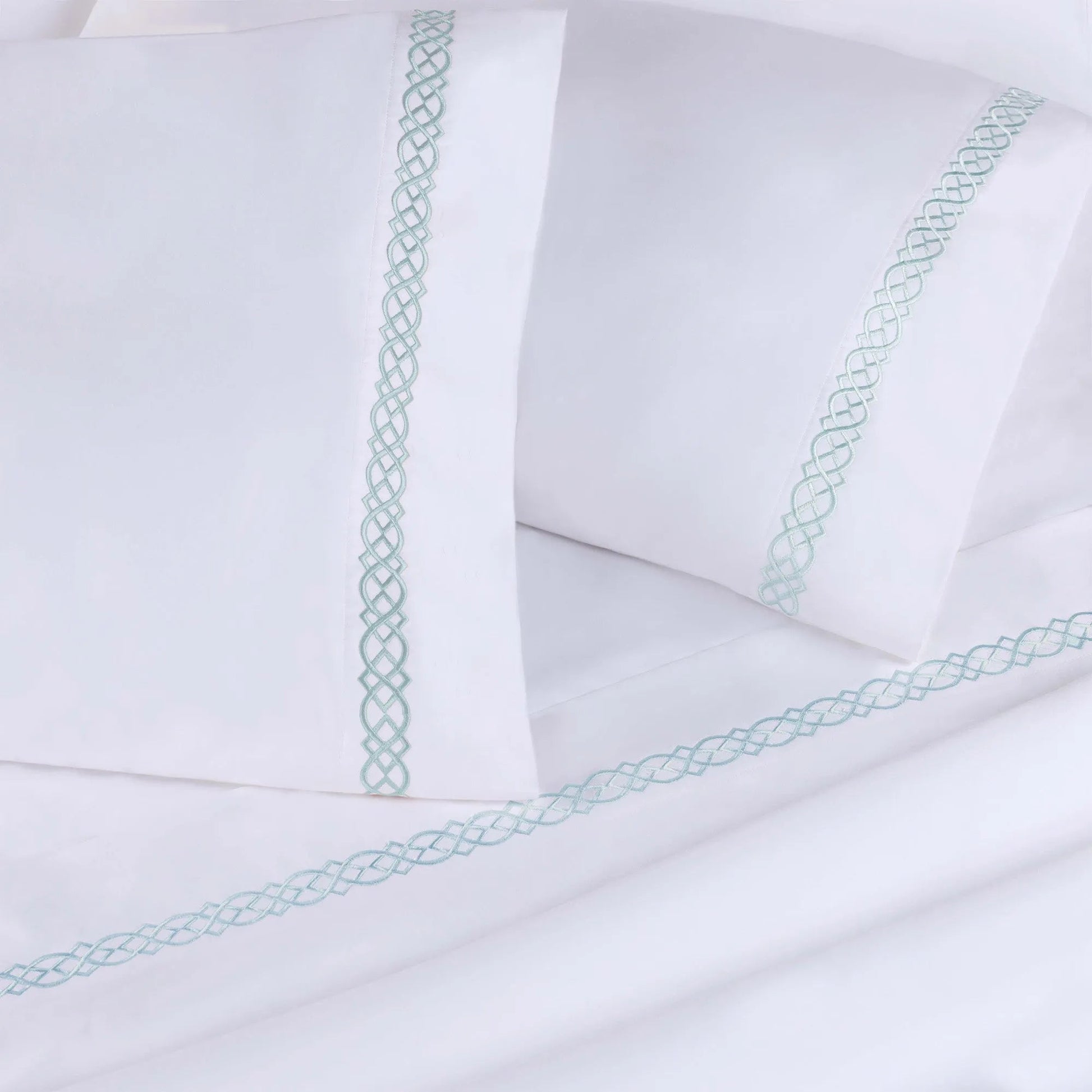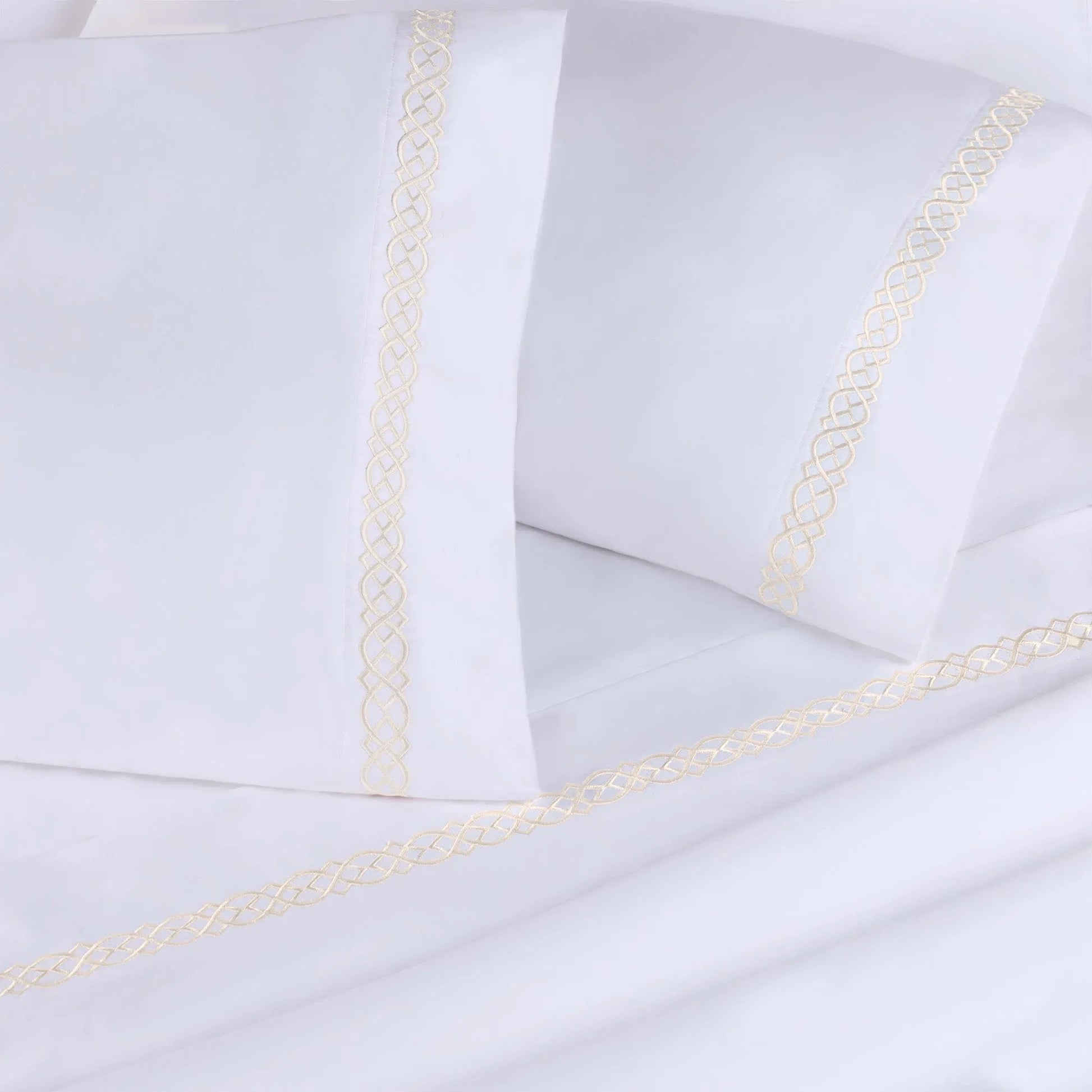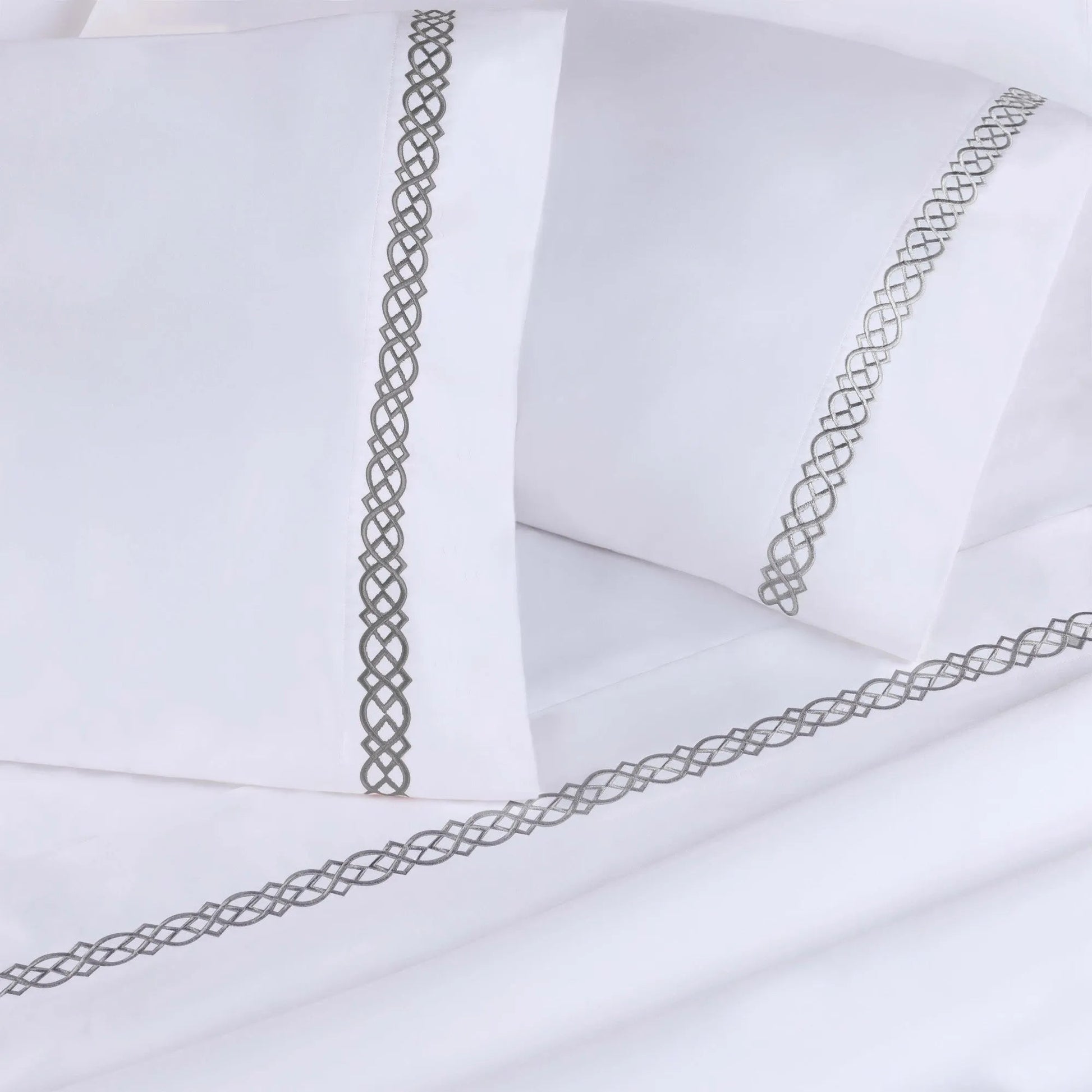 Woven with a sateen finish, this set includes a fitted sheet for mattresses up to 18” thick, a flat sheet, and two pillowcases. Infinity scroll embroidery adds a decorative flair, elevating your bedroom’s visual appeal.
