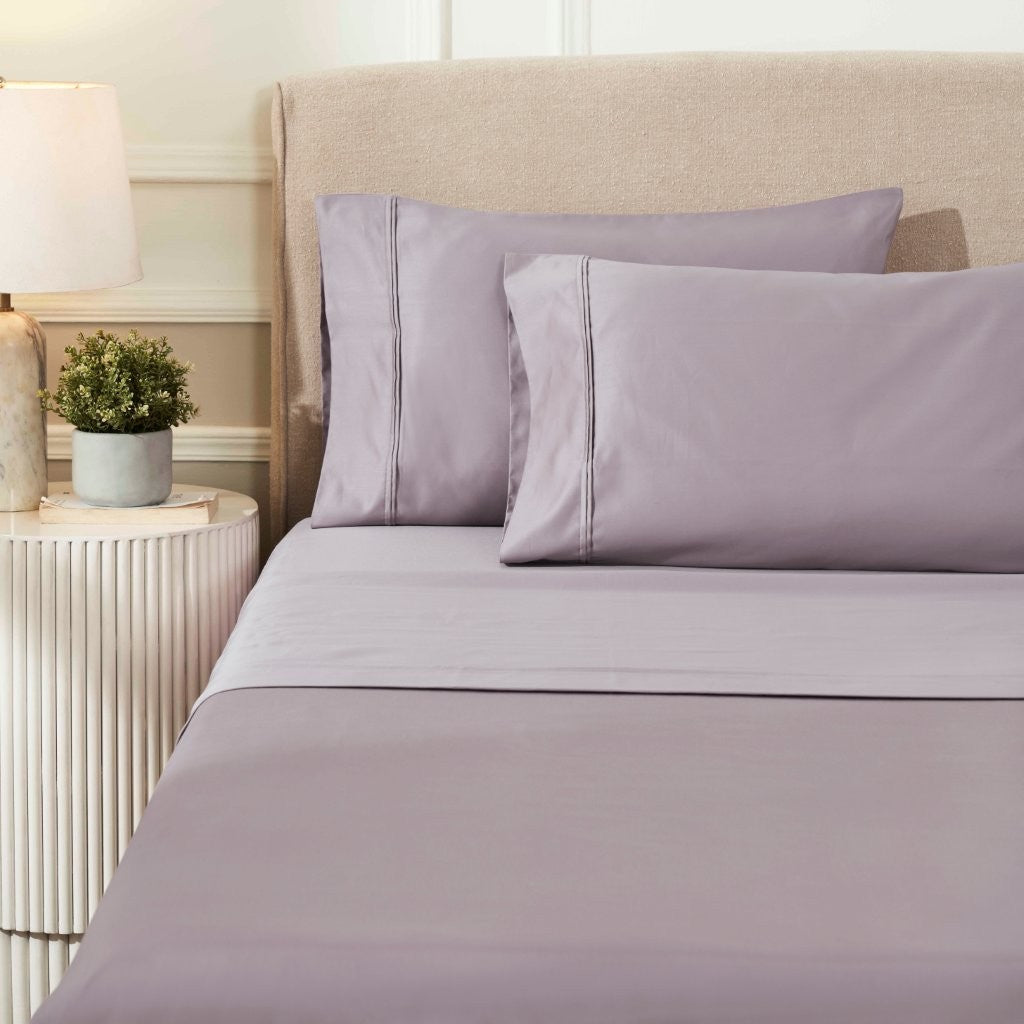 Made using extra-long staple Egyptian cotton, each sheet set includes a fitted sheet for mattresses up to 18” deep, a flat sheet, and two pillowcases with wide 4-inch hems. The sateen weave enhances the weight and gives a subtle sheen without compromising durability.