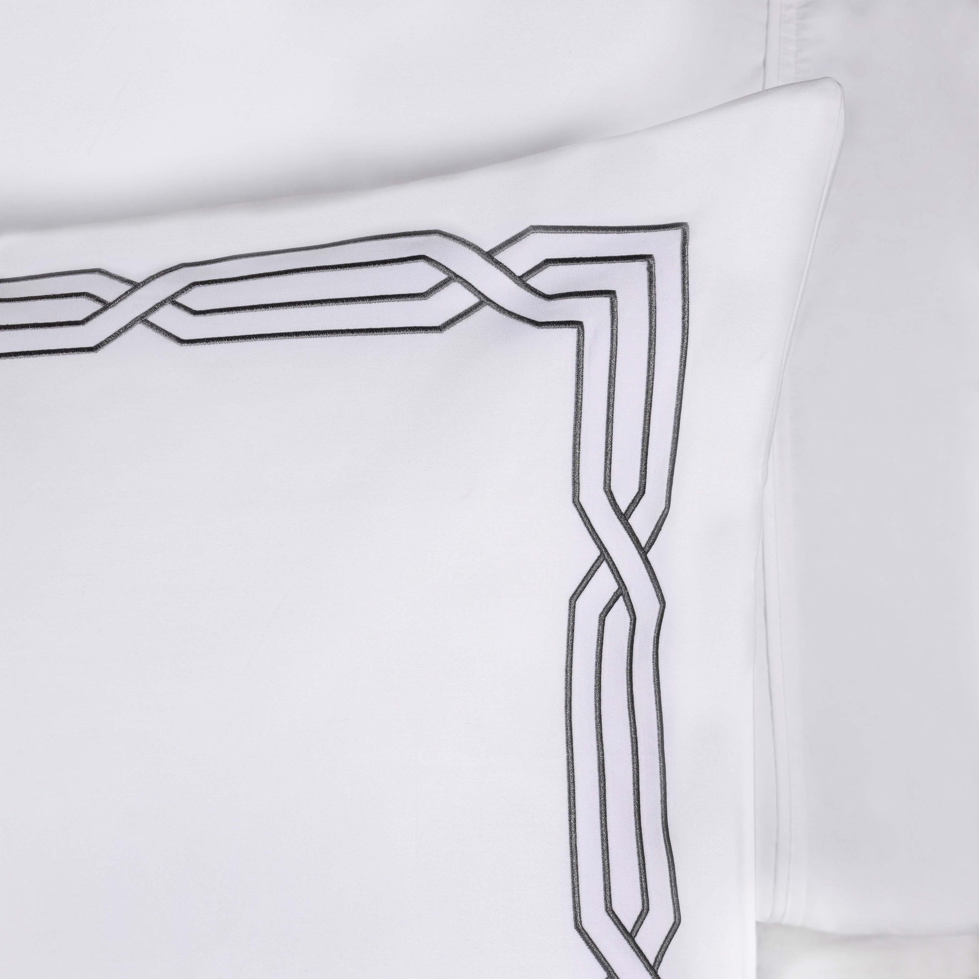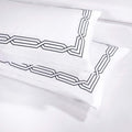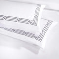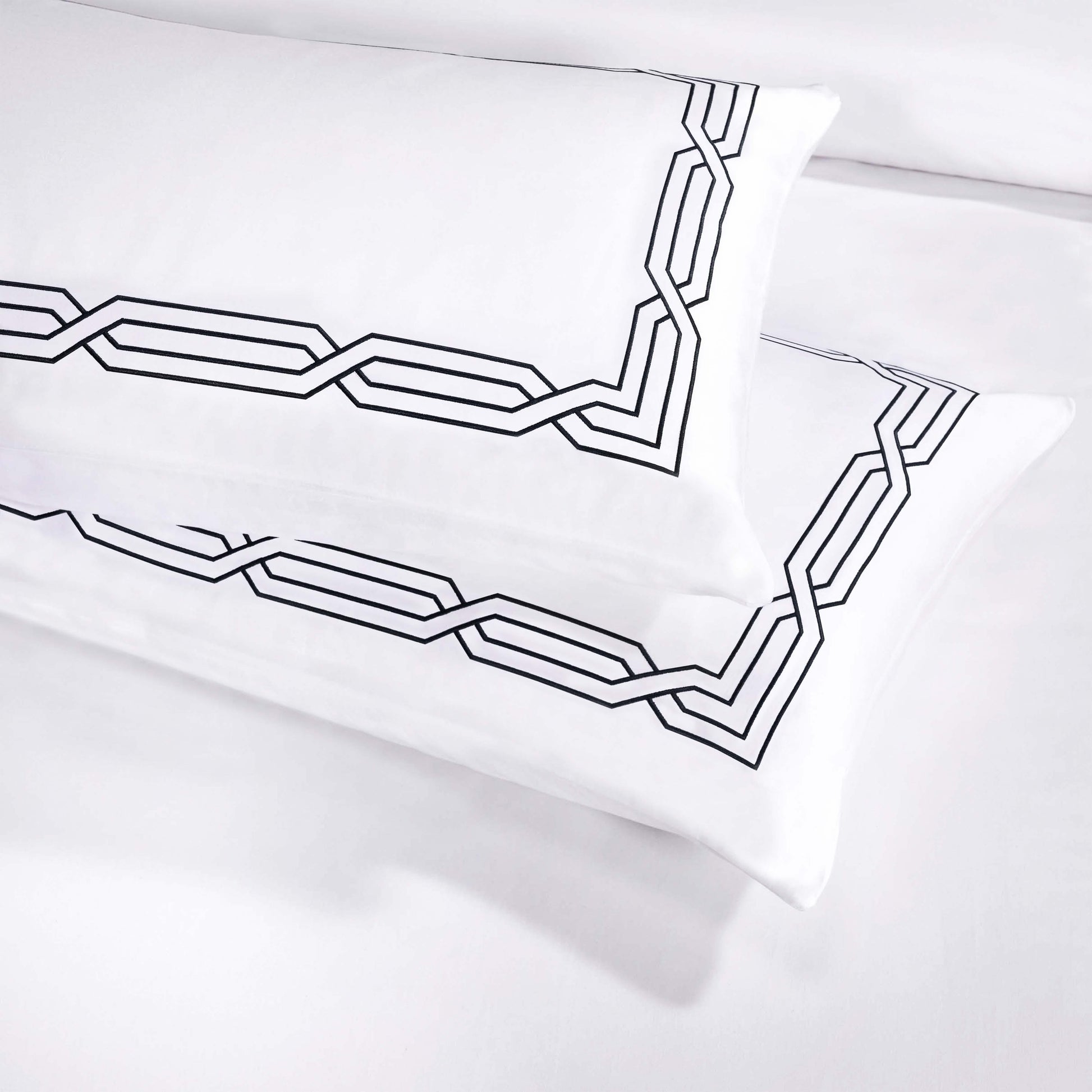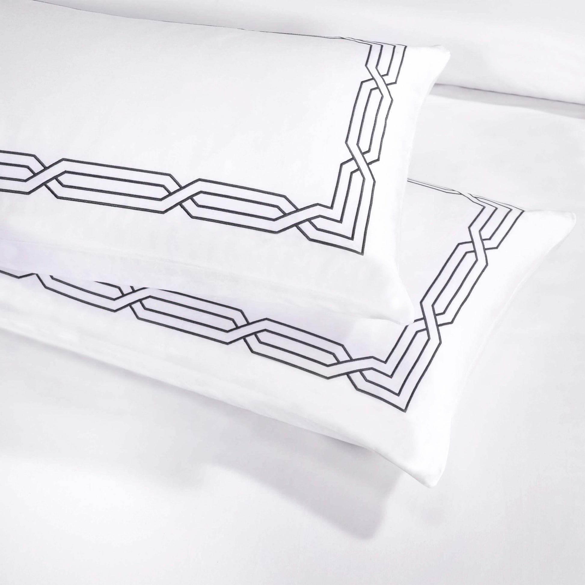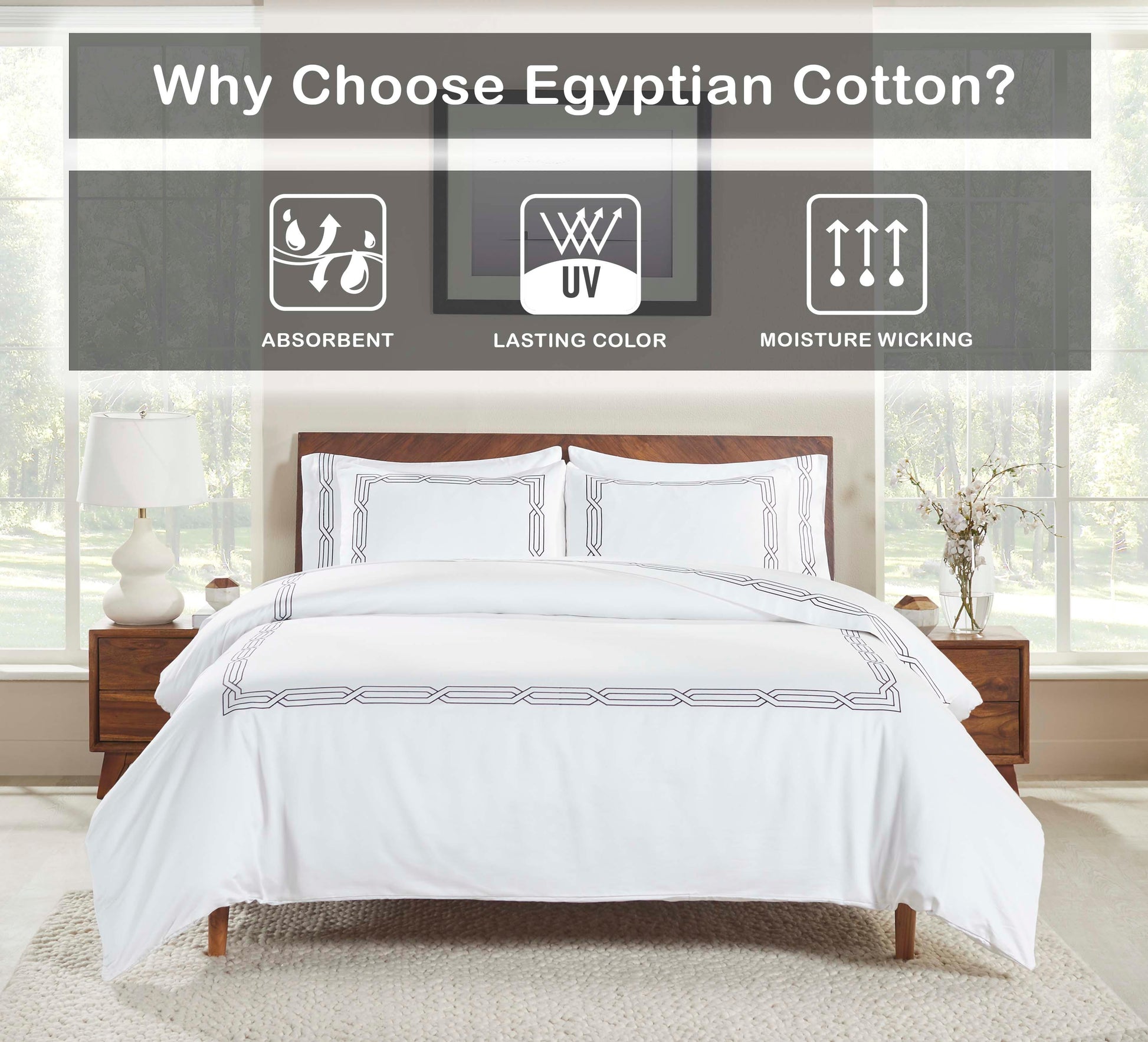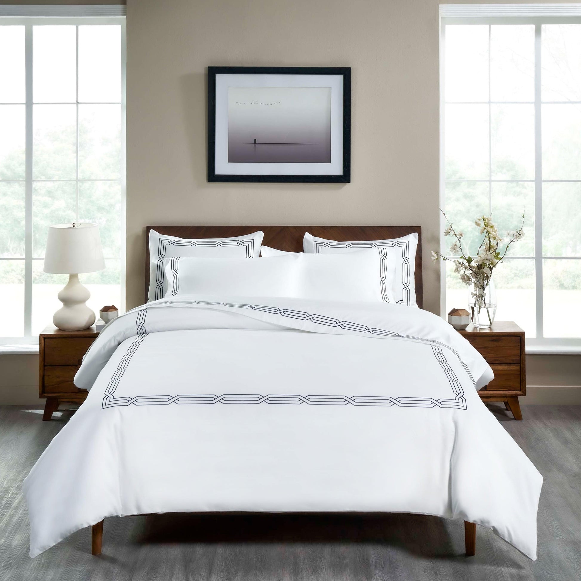 Crafted from 100% Egyptian Cotton, this premium set features a richly woven sateen finish with refined infinity scroll embroidery on both the duvet and pillow shams.