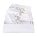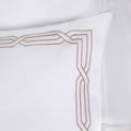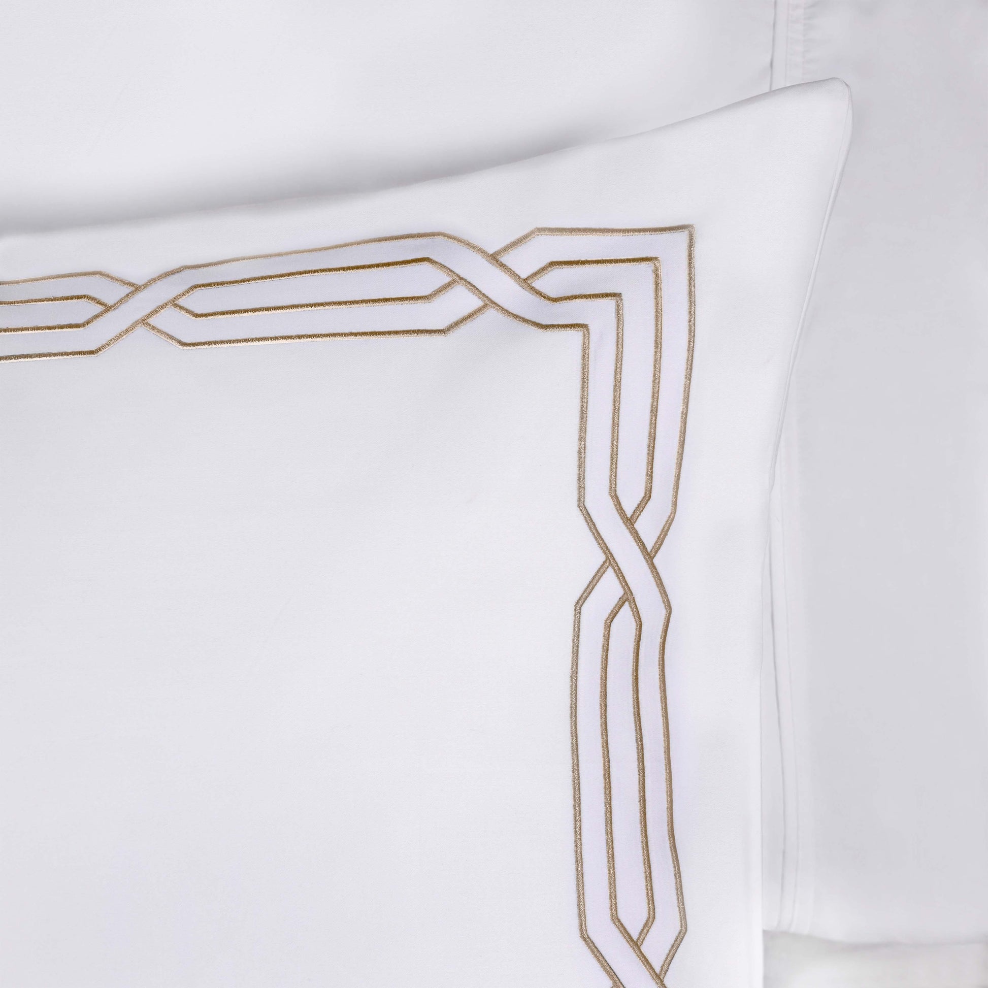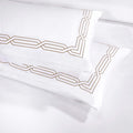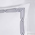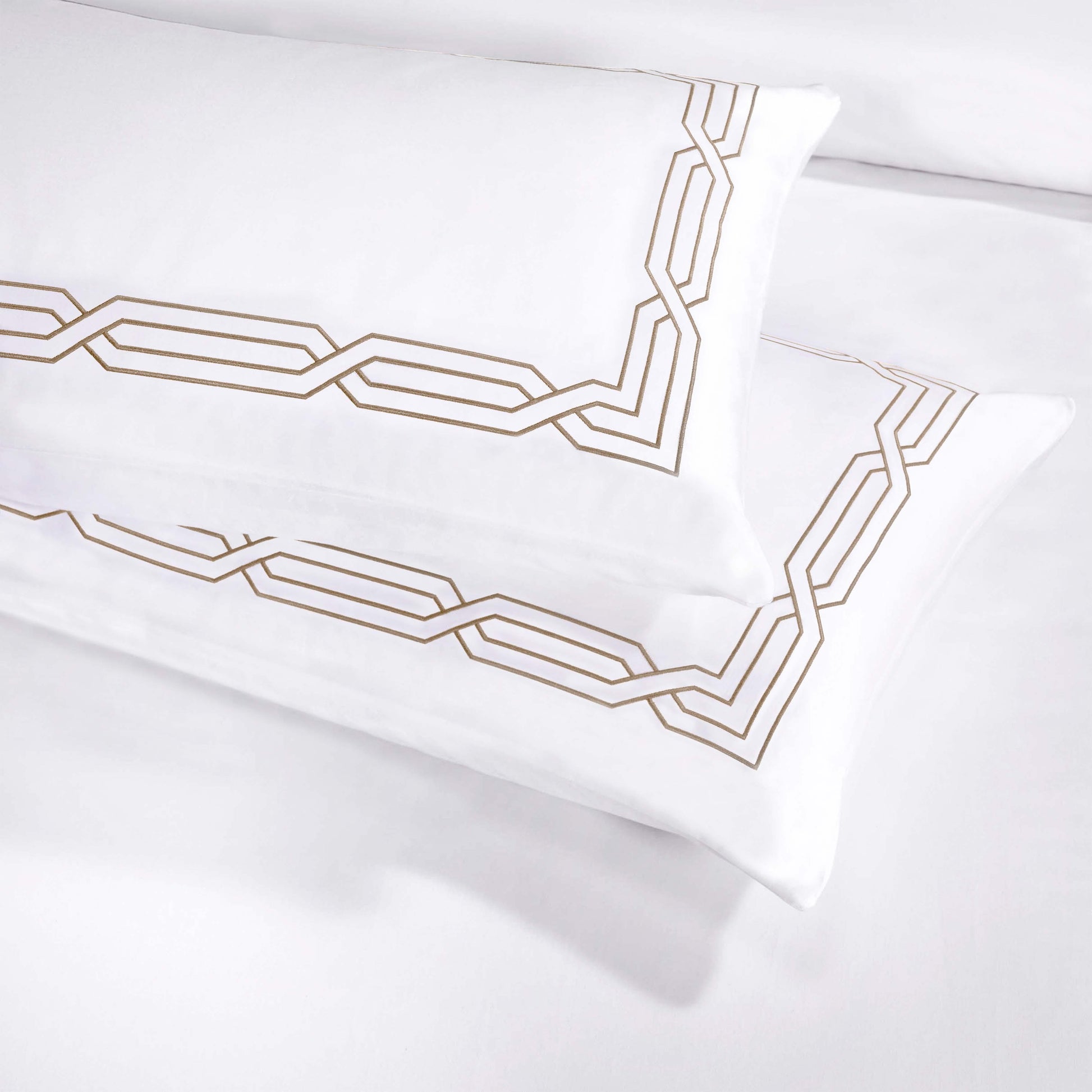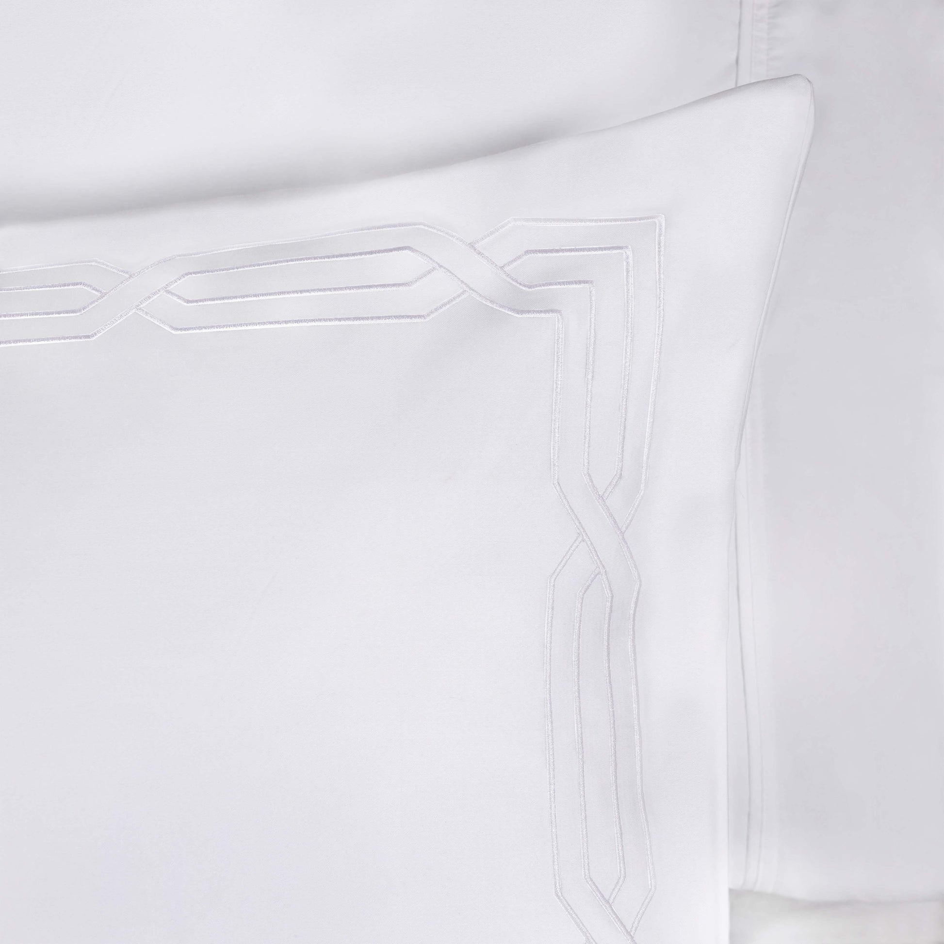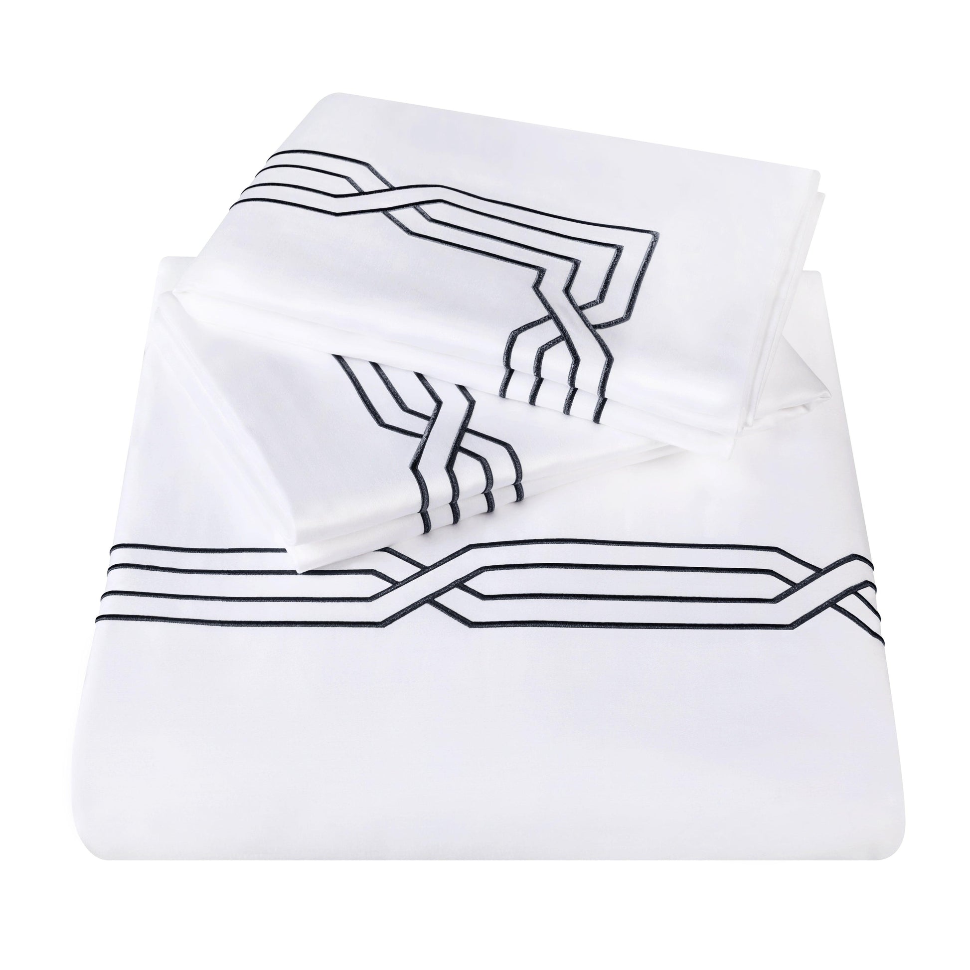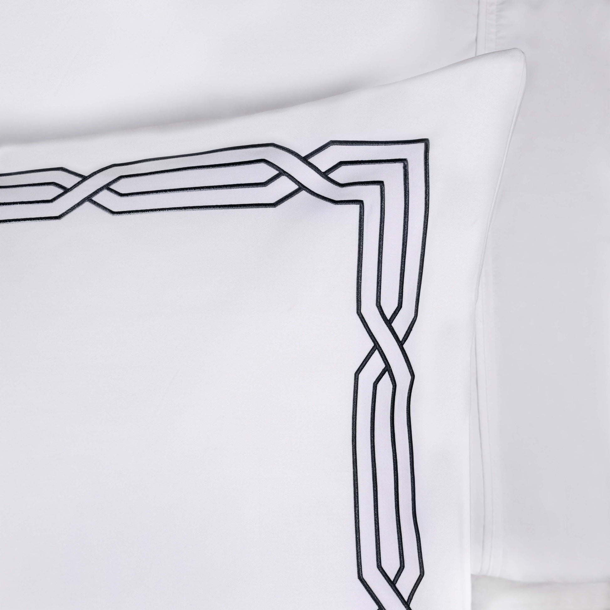 Crafted from 100% Egyptian Cotton, this premium set features a richly woven sateen finish with refined infinity scroll embroidery on both the duvet and pillow shams.