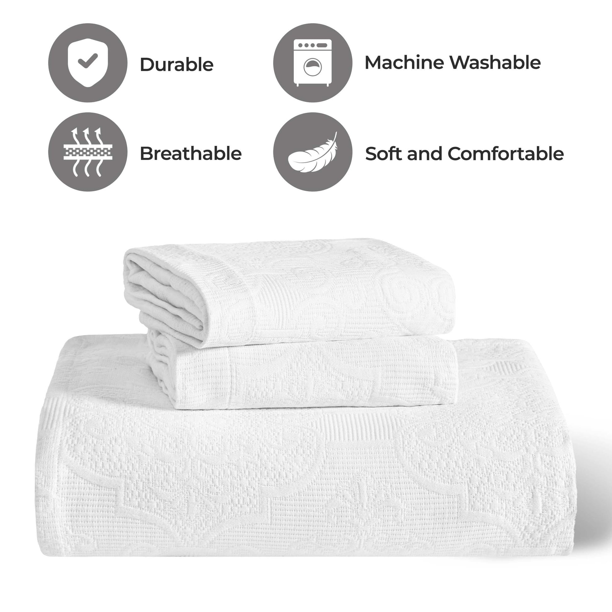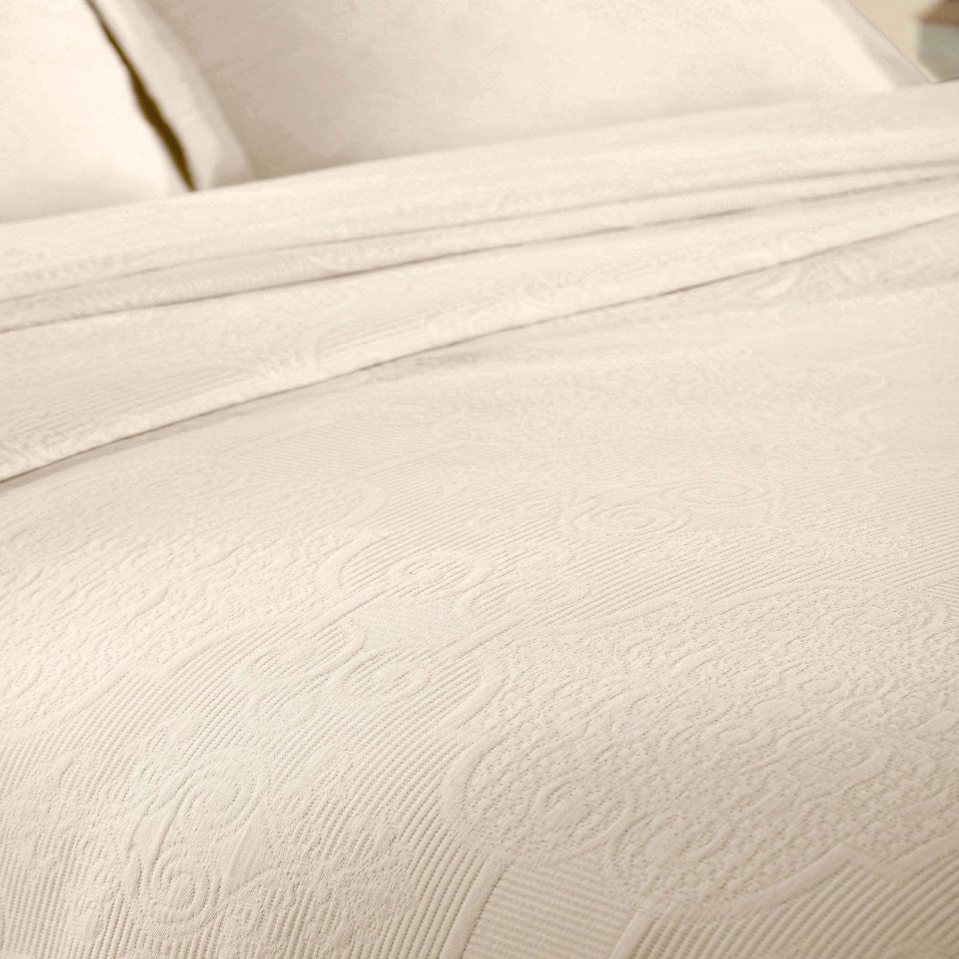 Elevate your bedroom with the exceptional comfort and style of the Superior Florin Cotton Matelasse Bedspread Set. Crafted from premium Cotton, this versatile set is soft and breathable, perfect as an added layer or on its own. The jacquard weave displays a scrolling medallion pattern that becomes a focal point in your bedroom. This gorgeous bundle includes 1 oversized bedspread that hangs to the floor, eliminating the need for a bed skirt, and 2 matching pillow shams (Twin size includes 1 pillow sham). Available in your choice of solid colors and sizes, updating the look of your modern or transitional space has never been easier.