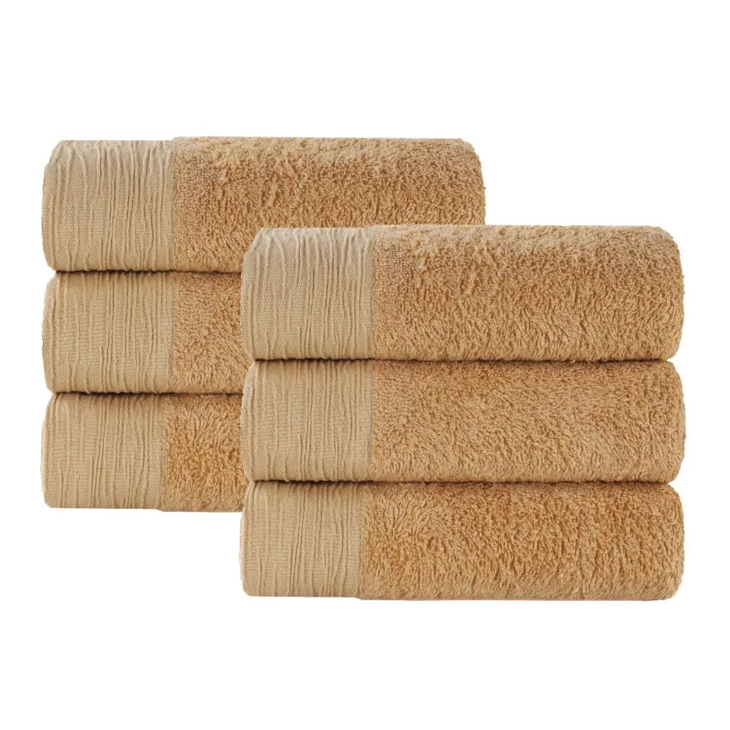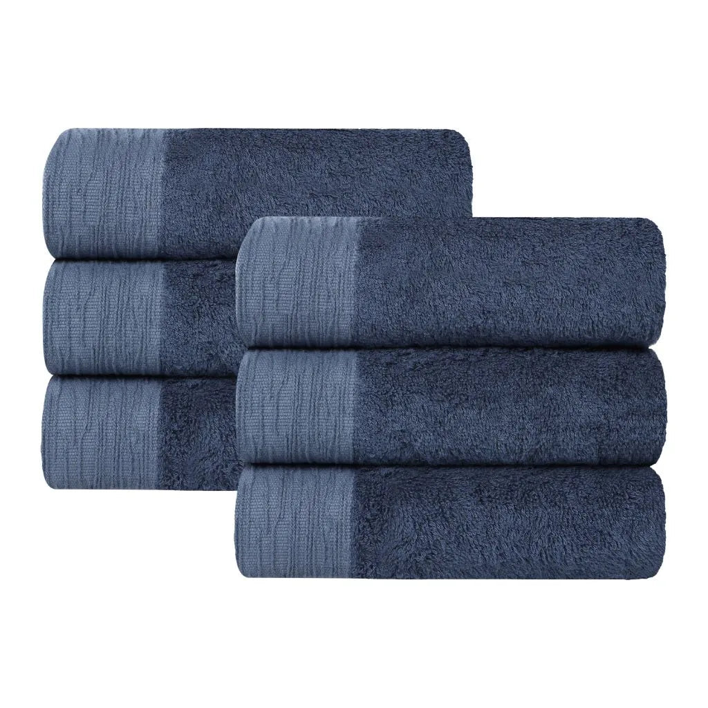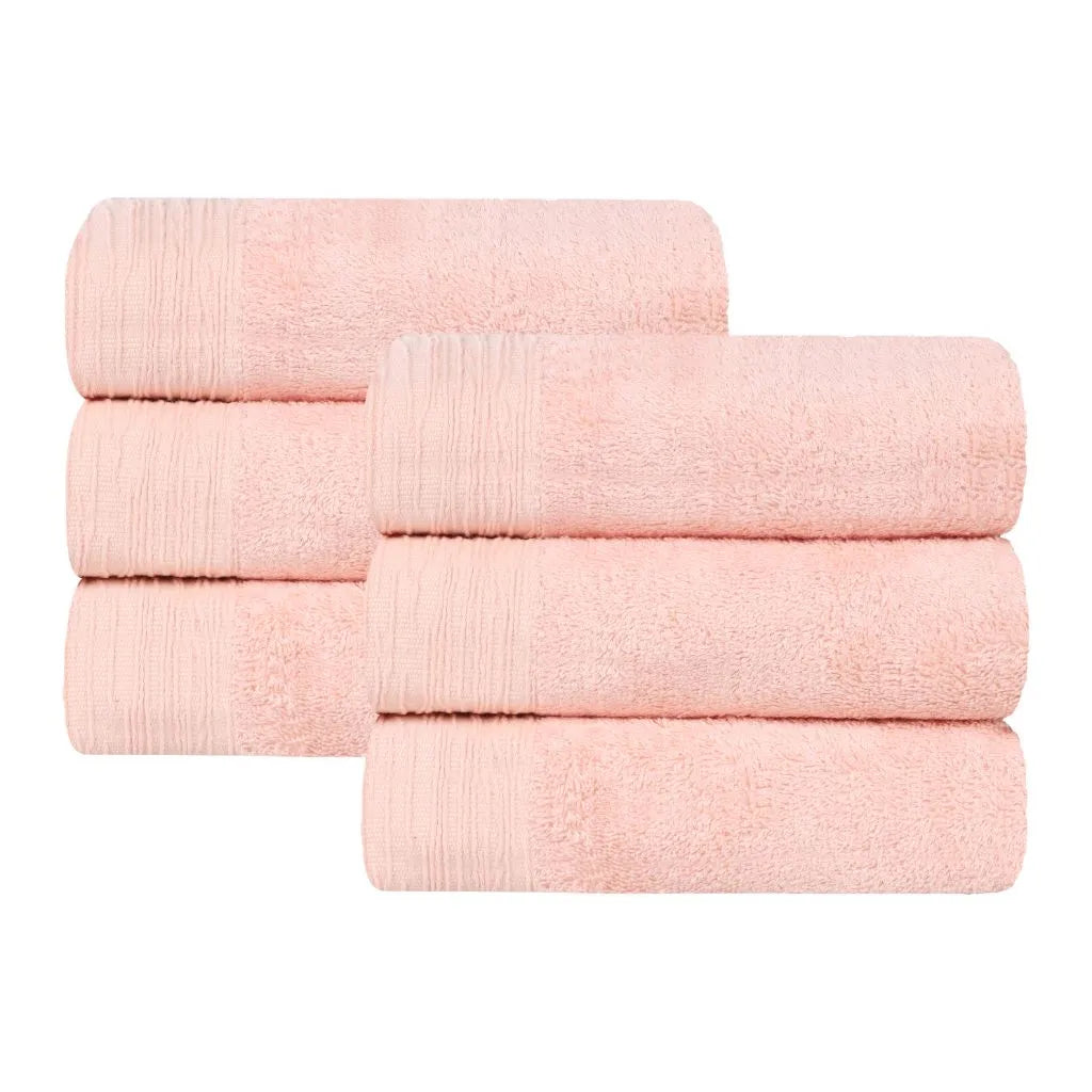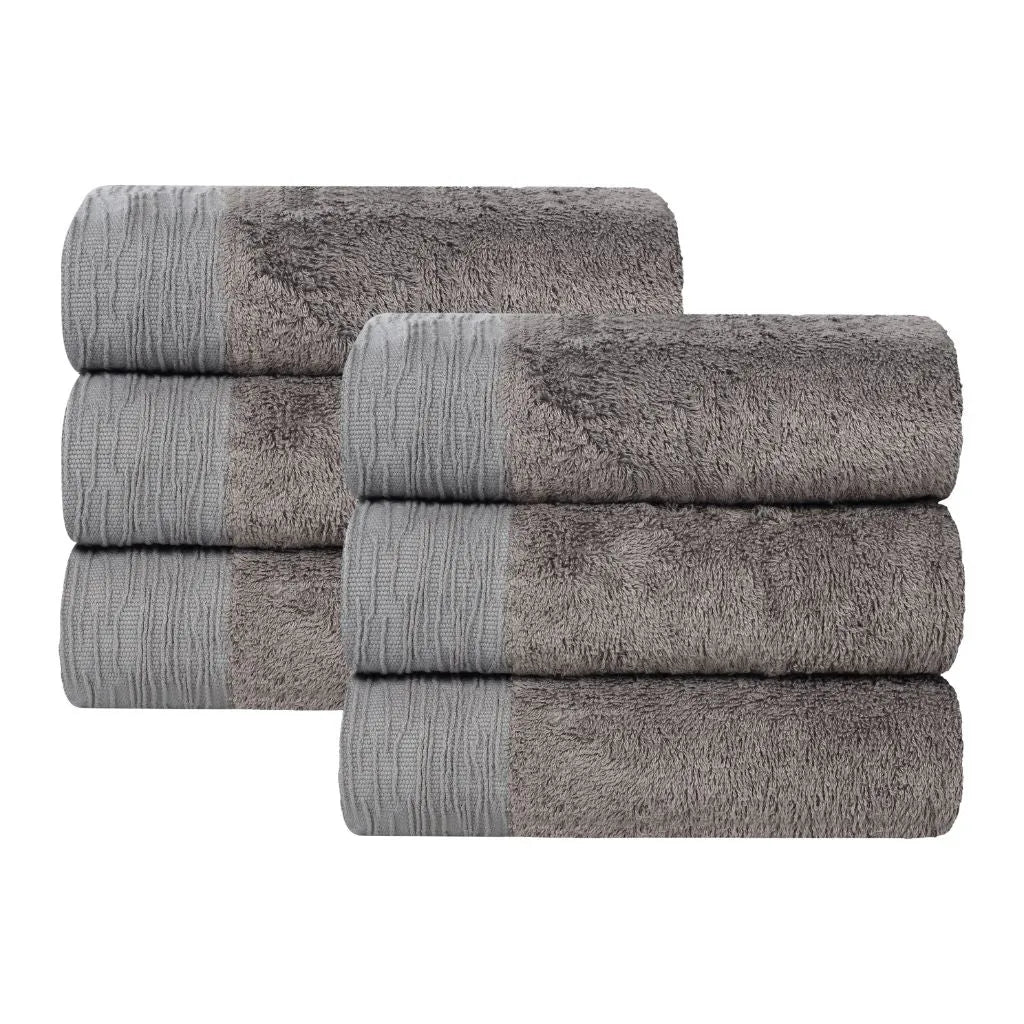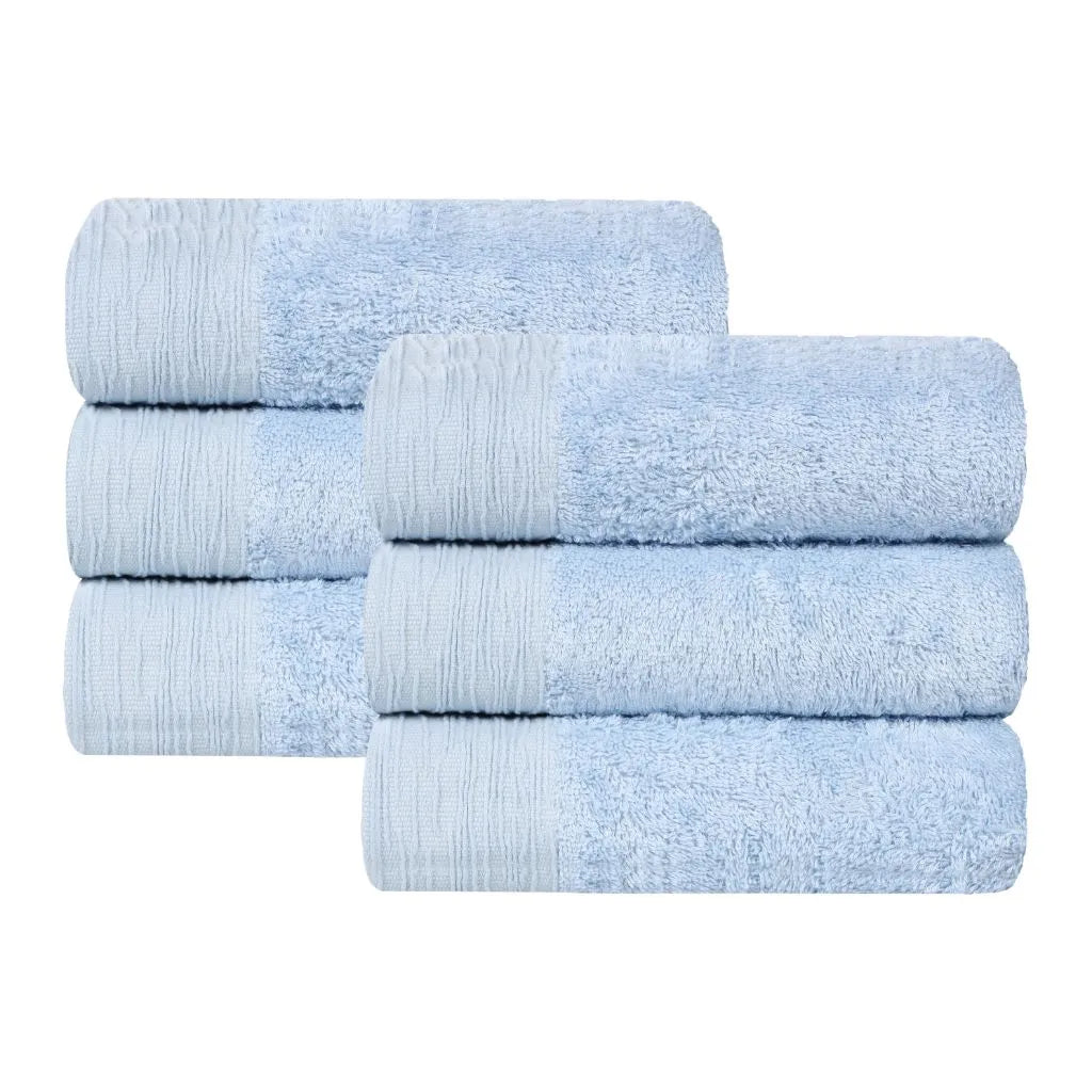 Elevate your day-to-day routine with the unique touch of the Superior Rayon from Bamboo Eco-Friendly Fluffy Soft Modern Solid Hand Towel Set of 6. This 40% Rayon from Bamboo 60% Cotton towel set is crafted for a soft, absorbent, and luxurious experience. Boasting a classic solid design and wave textured border, bring a unique style to your guest or master bathroom with this bundle. Each towel is finished with secure hemmed edges to avoid fraying and a durable single-ply to withstand countless washes and last you years to come. Featuring a hanging loop on each piece, enjoy both convenience and comfort with this versatile set.