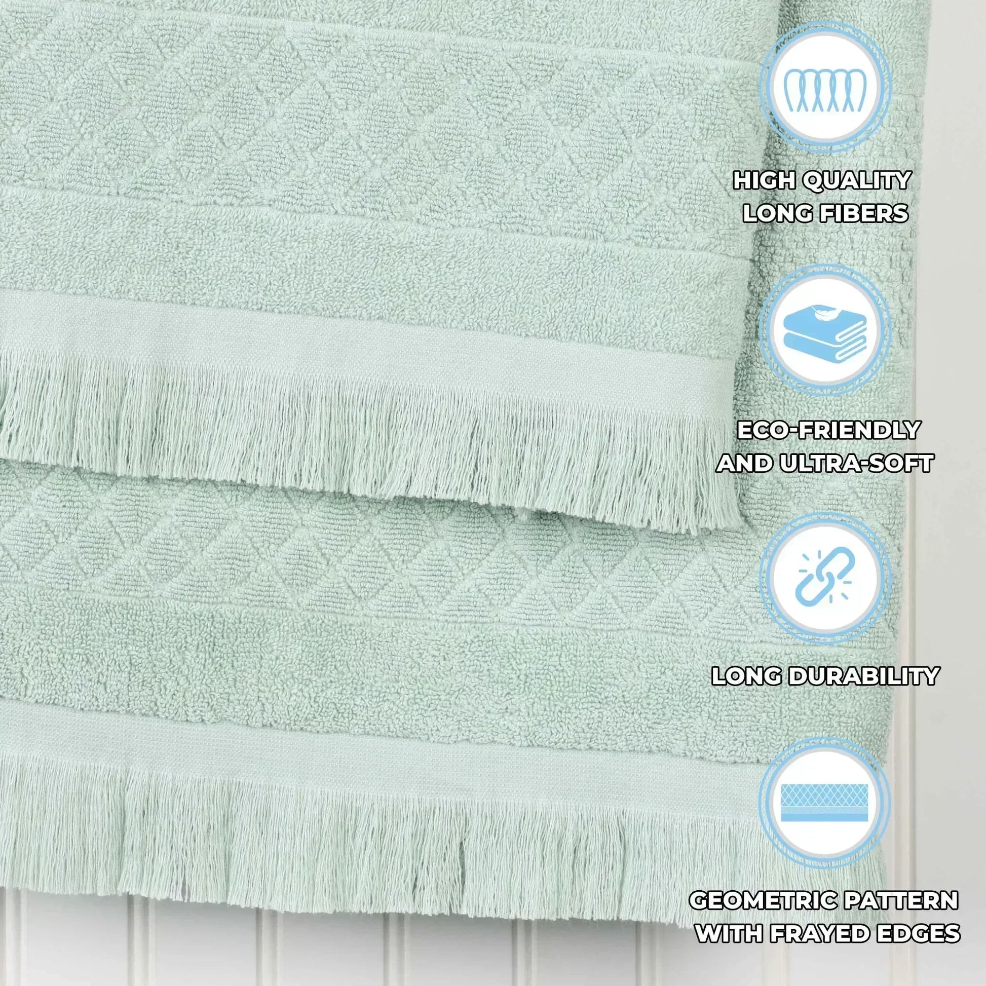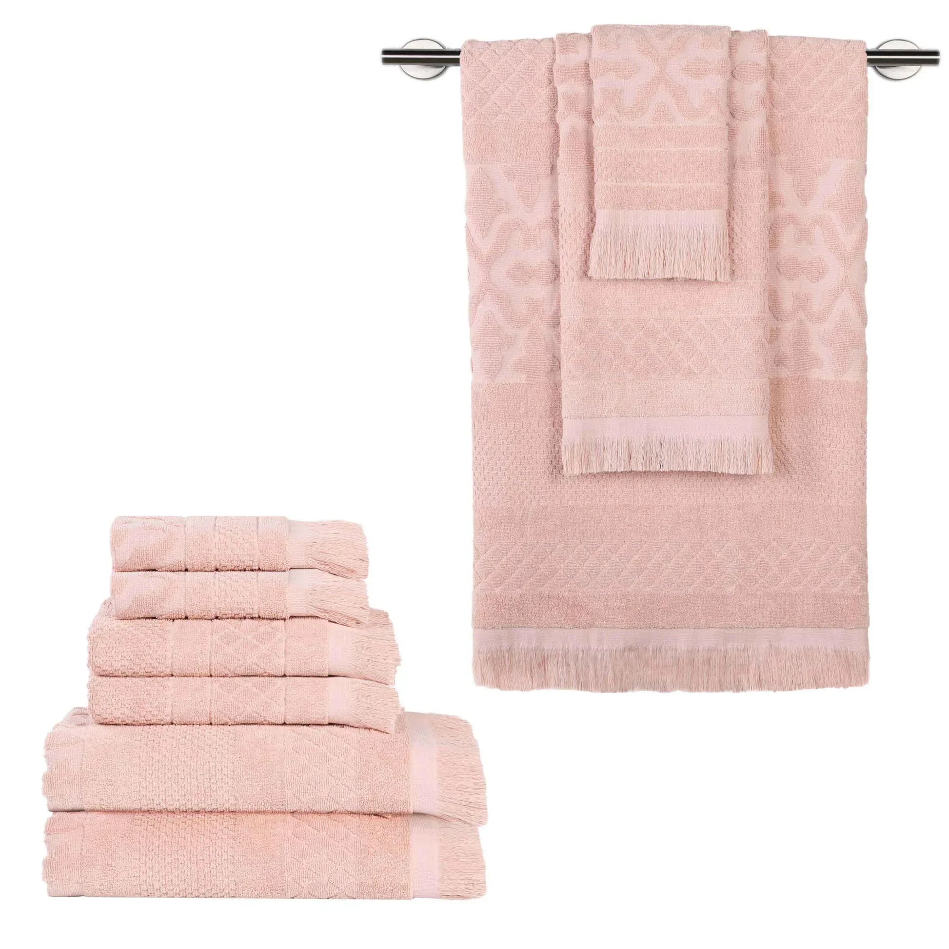 Refresh your bathroom with a harmonious blend of elegance and comfort with the Superior Rolla Cotton Geometric Jacquard Plush Soft Absorbent 9 Piece Towel Set. These Cotton towels are crafted for a soft, absorbent, and luxurious experience. Boasting a geometric pattern with frayed edges, bring unique style to your guest or master bathroom with this bundle. Each towel is finished with a durable single-ply to withstand countless washes and last you years to come. Featuring a hanging loop on each piece, enjoy both convenience and comfort with this versatile set.