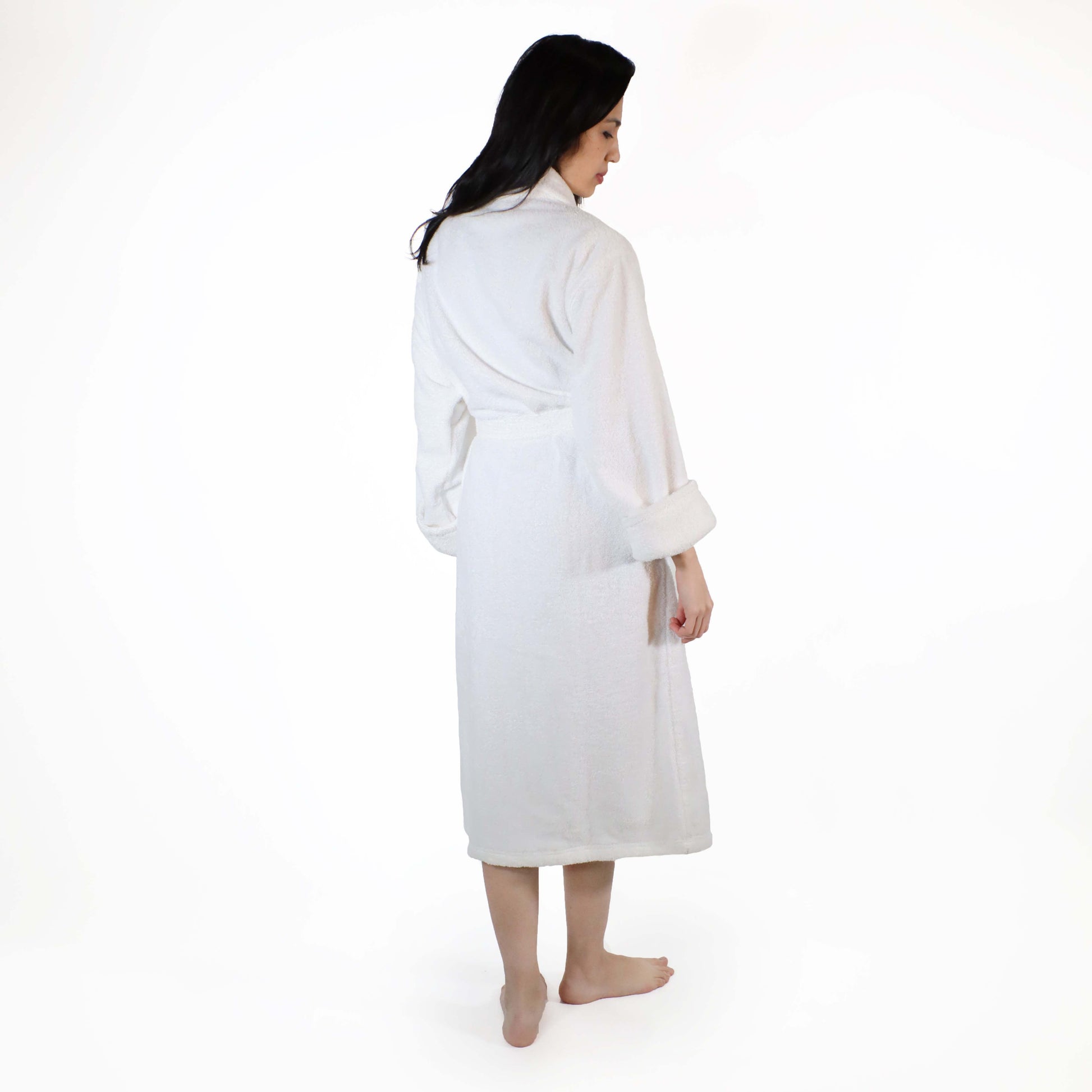 Lounge in relaxation with this ultra-soft Women’s Turkish Cotton Bathrobe. Well-designed with a loop at the neck for quick-drying, fold-back sleeves, 2 front patch pockets, a fluffy shawl collar, and 2 vertical belt loops for an array of heights, this robe will become your new favorite for at-home comfort. This gorgeous robe is crafted from premium and smooth Turkish Cotton fibers that are absorbent, wick moisture off your skin quickly, and keep you warm and cozy after a soothing bath or shower. Robes boast a plain dobby weave with a single-loop design that gives it a lightweight feel you’ll love. Choose from 2 sizes, S/M or L/XL, and 4 solid colors including gray, navy blue, ivory, or white. These robes are colorfast and machine washable, becoming even softer over time. Enjoy spa quality at home all year round with this plush, long-lasting bathrobe.