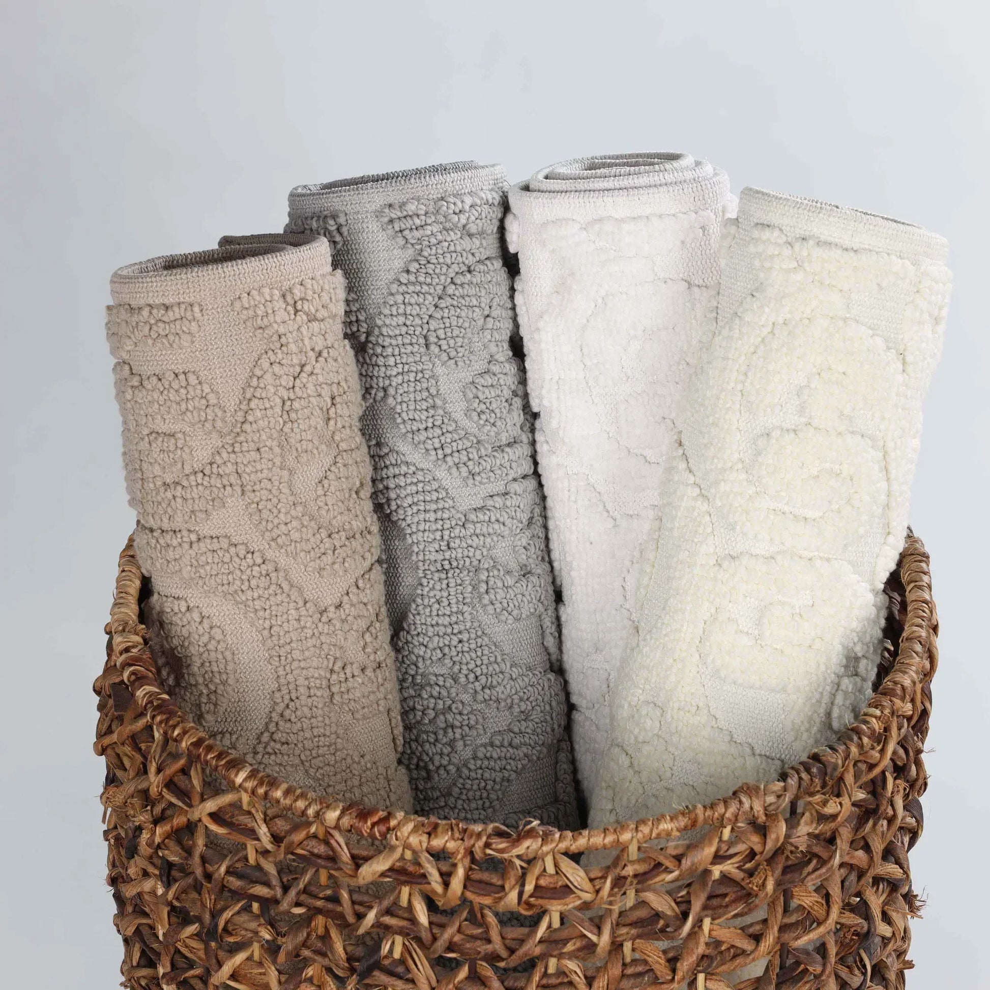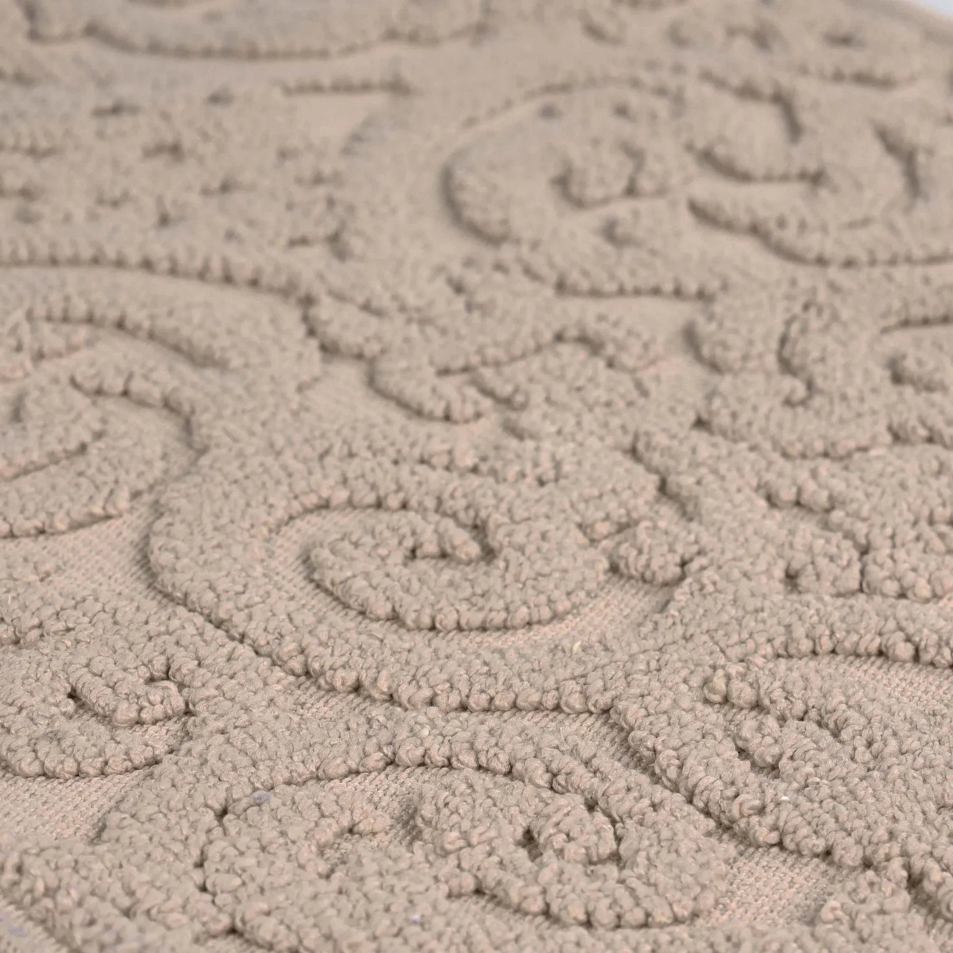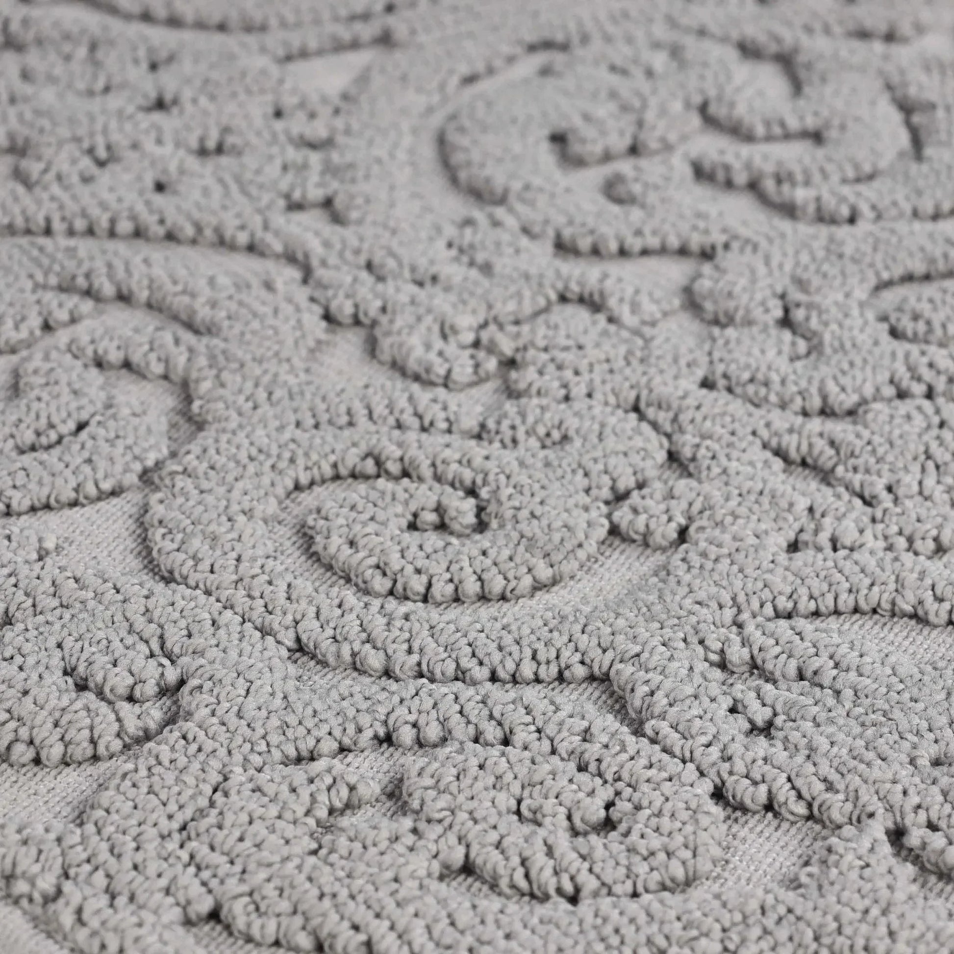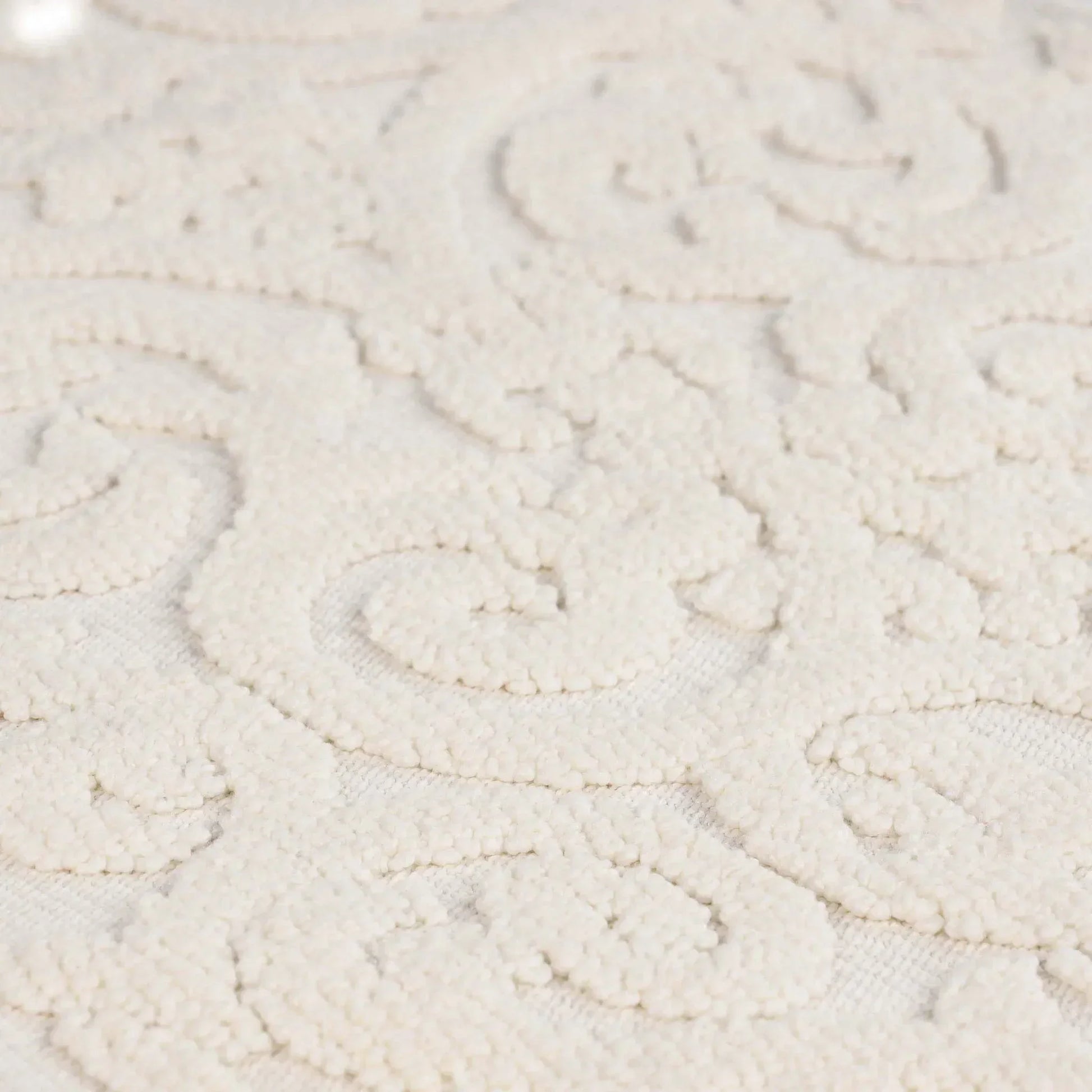 Indulge in the exquisite comfort and timeless elegance of our Venere Floral Scroll Bath Rug Set. This meticulously crafted ensemble of two rugs features a sophisticated jacquard floral scroll pattern, interwoven with a plush high-low pile that adds captivating dimension to your bathroom sanctuary.