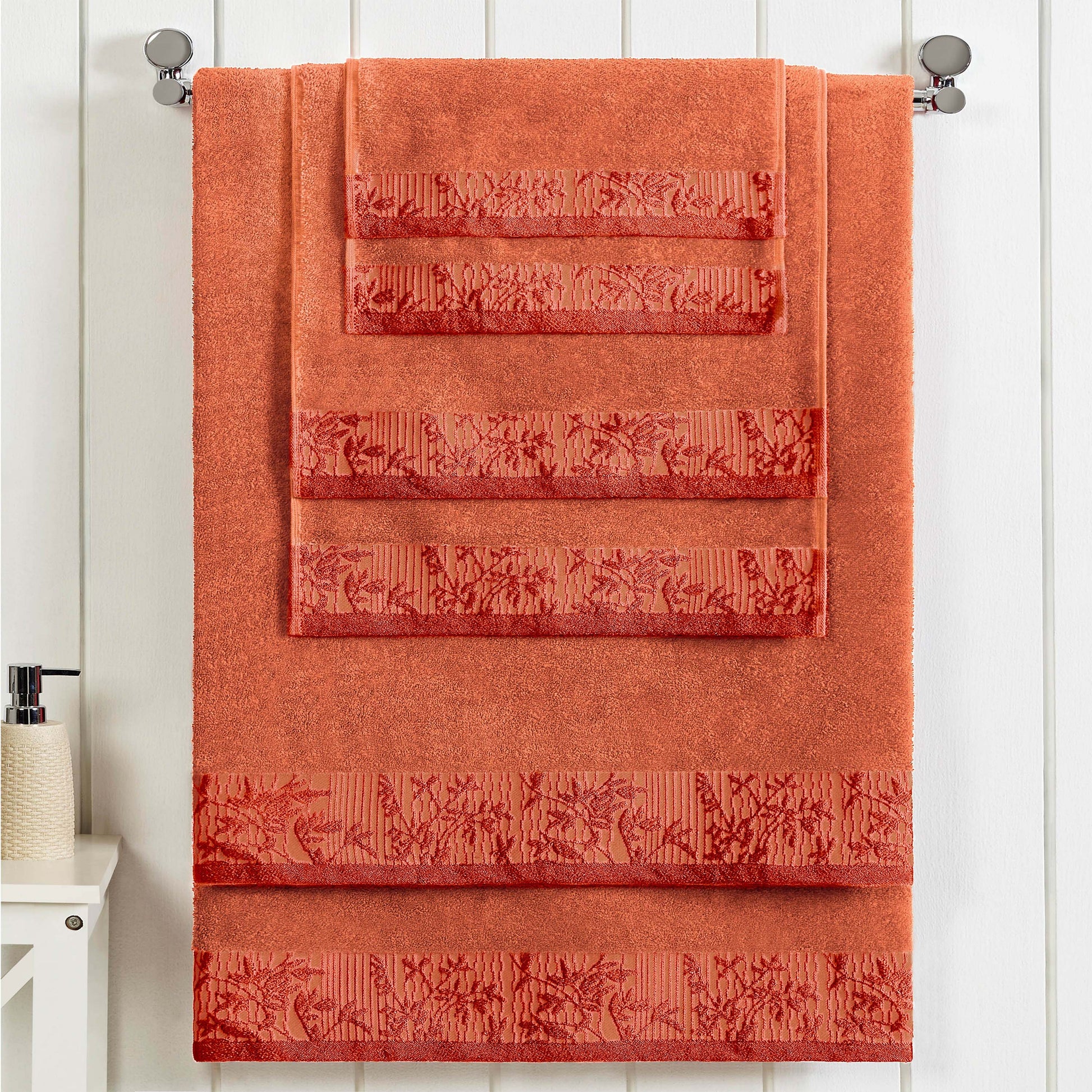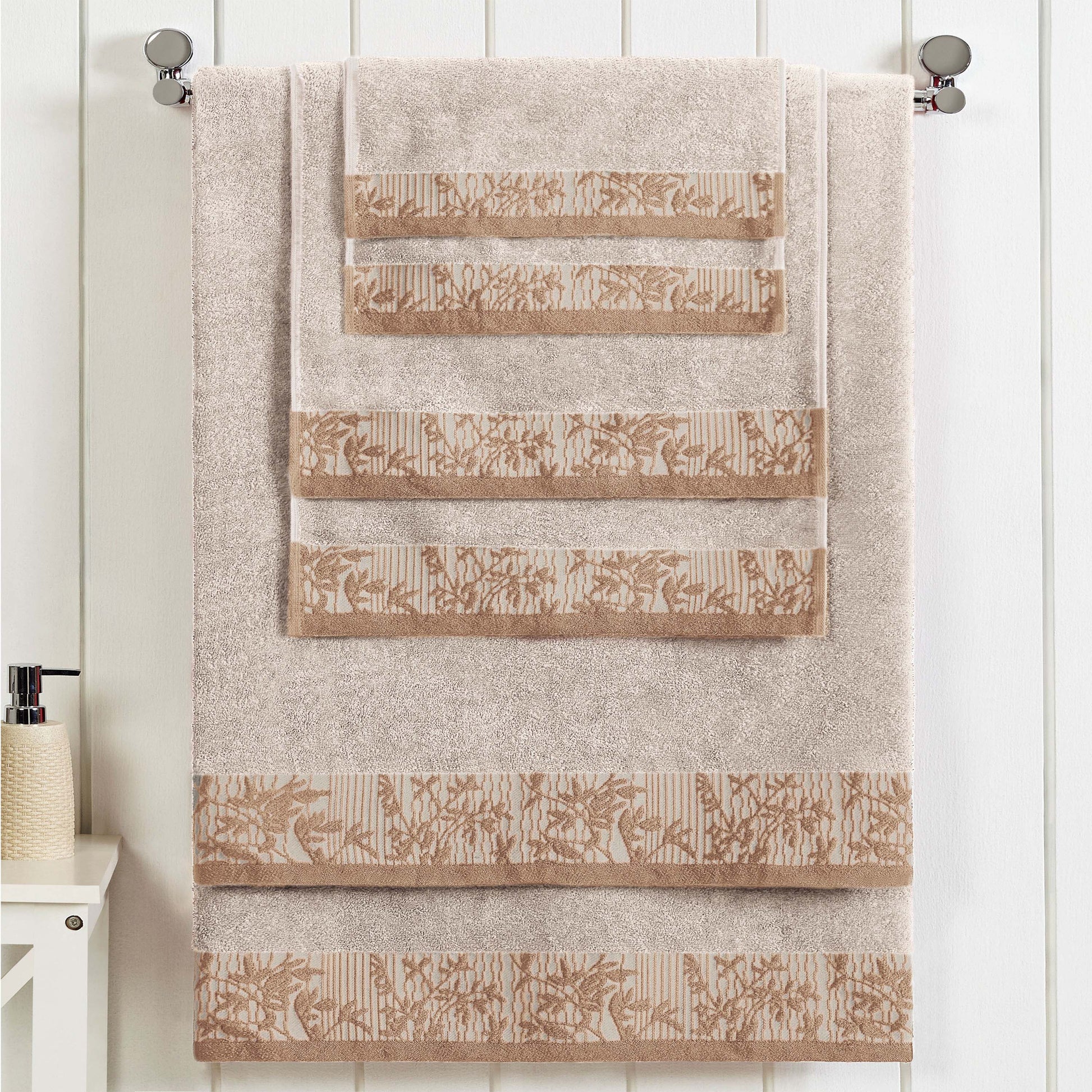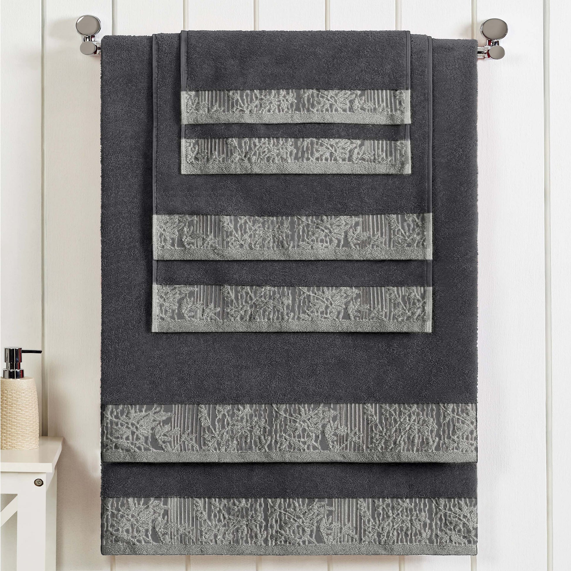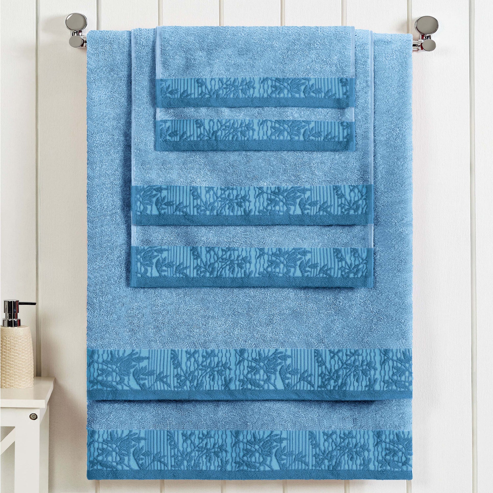Introduce a touch of timeless elegance to your home with the Wisteria 6-Piece Towel Set. As one of our most popular floral bath towel sets, this collection features a beautifully detailed jacquard floral border. This stylish, decorative bath towel set is crafted to be a stunning focal point in any master or guest bathroom.