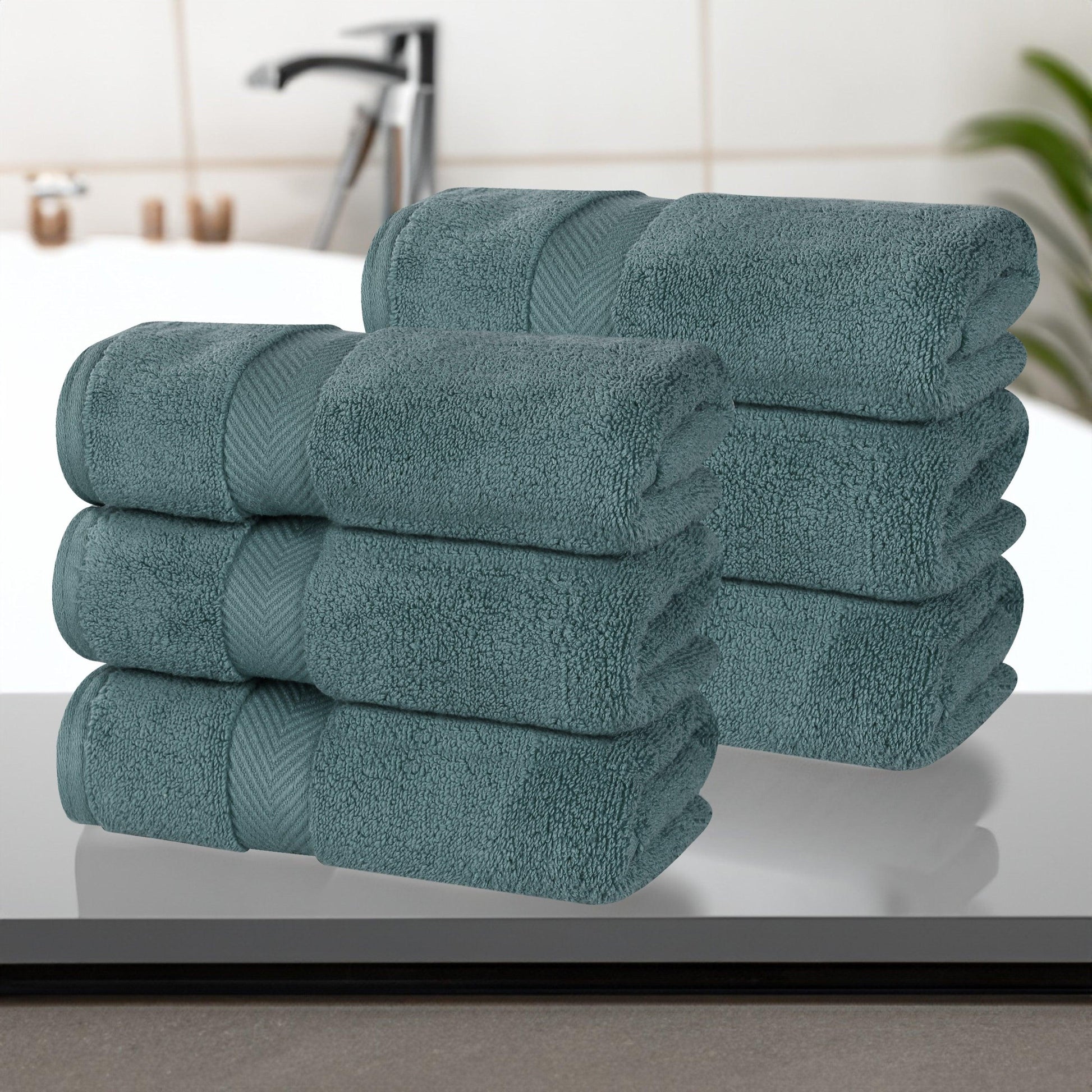 Add a calm and comfortable vibe to your bathroom retreat with our Zero Twist Cotton Hand Towel Set. Our fluffy cotton towels have a luxuriously soft feel and versatile absorption, perfect for cleaning up spills or effortlessly drying your hands off. The unique zero-twist weave is smooth, plush, and highly absorbent to get you dry quickly. For added style, each piece in this bundle features an elegant chevron dobby border with a hanging loop for effortless drying. These towels are available in vibrant color options to match your bathroom decor style. For comfort and durability, each towel has a medium-weight thickness. This set of daily essentials includes 6 hand towels to easily stock your bathroom or kitchen.