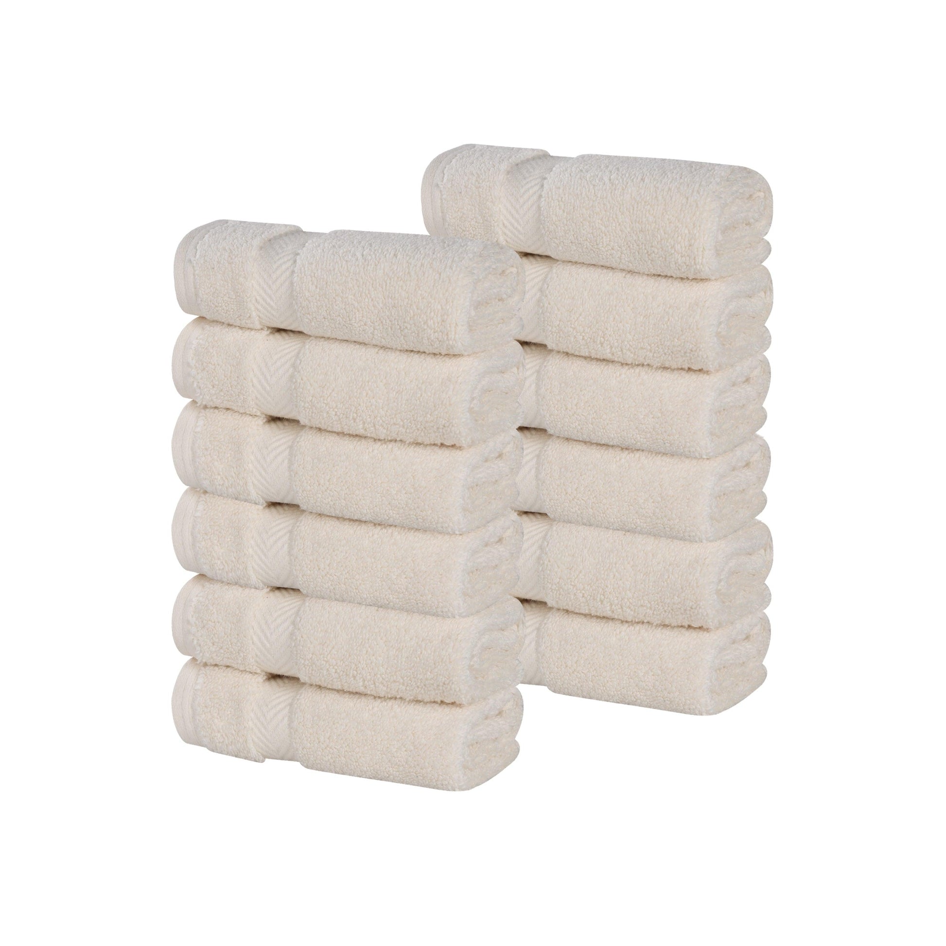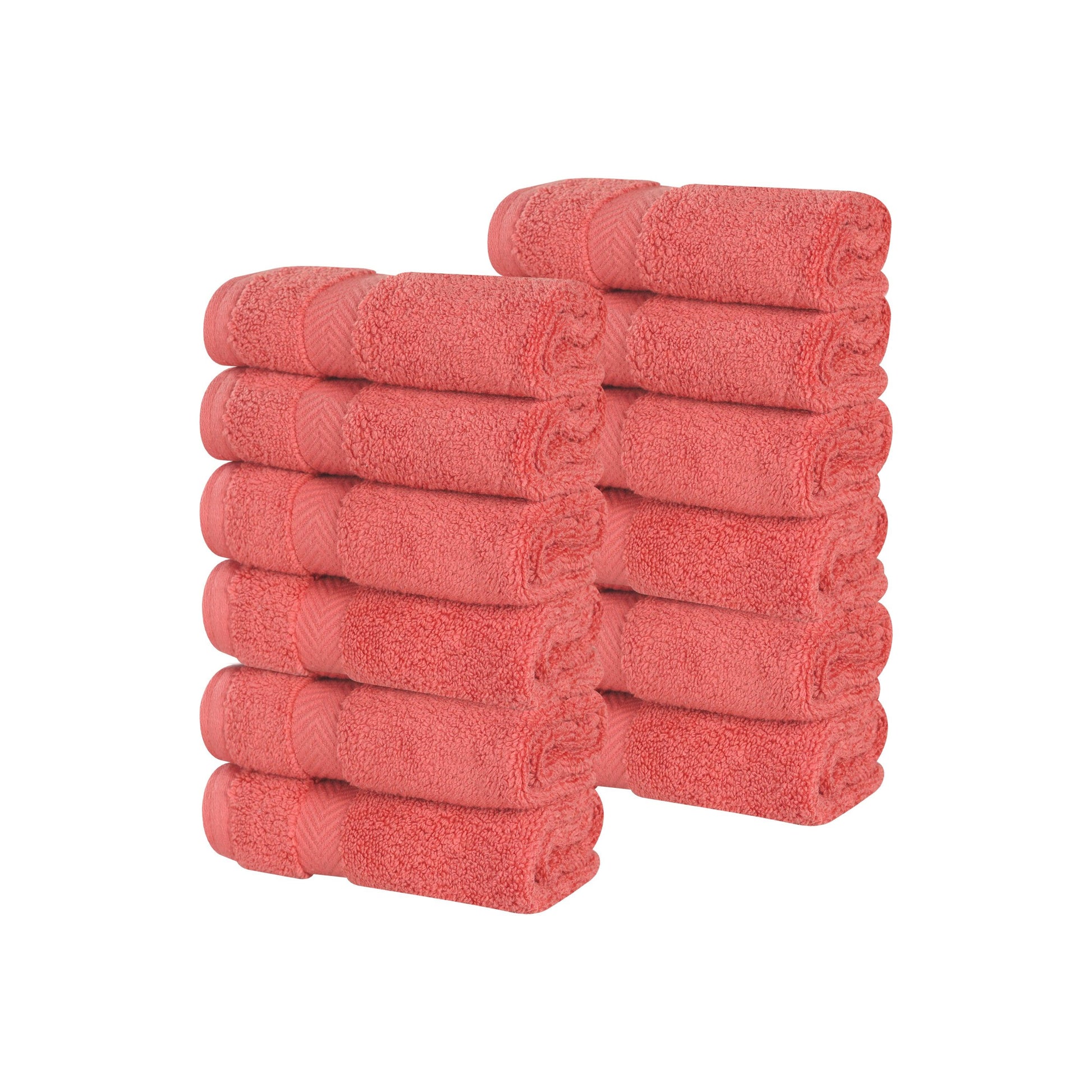 Dry off in a sophisticated, spa-quality style with our Zero Twist Cotton Face Towel/ Washcloth Set. Our fluffy cotton face towels have a luxuriously soft feel with versatile absorption, ideal for cleaning up spills or as an accessory to your daily bathroom routine. The unique zero-twist weave is smooth, plush, and highly absorbent to get you dry quickly. For added style, each piece in this bundle features an elegant chevron dobby border with a hanging loop for effortless drying. These towels are available in a variety of vibrant color options to match your bathroom decor style. Pamper yourself while giving a modern flourish to any bathroom or kitchen with these small towels. This set of daily essentials includes 12 washcloths that can also be used as face towels.